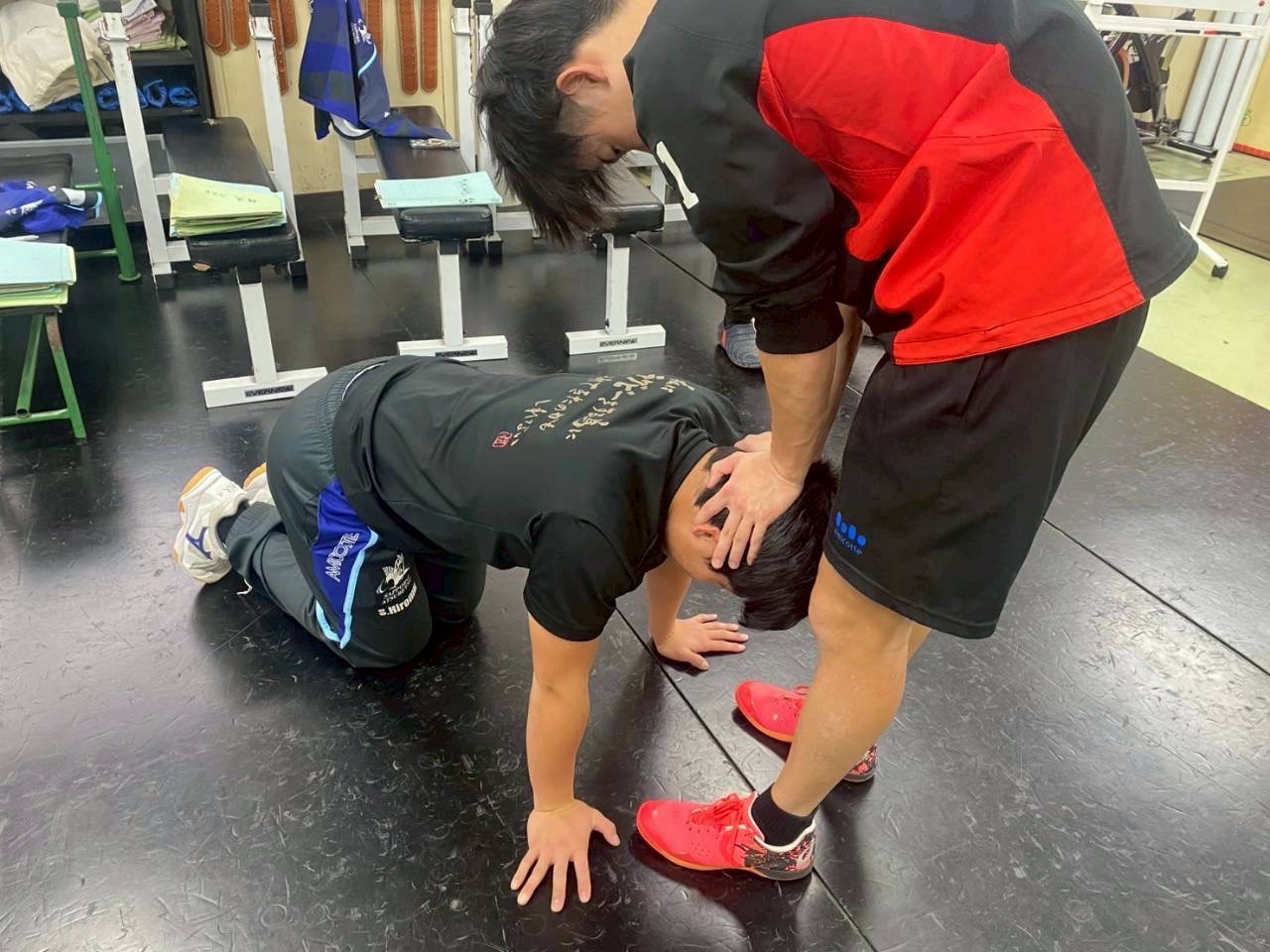 ウエイトの後に腸腰筋と首のトレーニングを行いました。久々の練習だったので、体が重く感じている選手が多かったようですが、しっかりと行っている姿が見られました。
