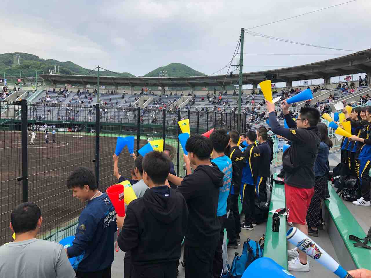 今日はラグビー部、剣道部、有志の3年生で一生懸命応援しました。さらに、普段野球部が合同練習や練習試合をしている大麻高校の野球部の生徒たちも積極的に応援に加わってくれて一体感のあるスタンドになったと思います。3得点を畳み掛けた場面や、伊藤くんのホームランの場面はみんなが手を取り合って喜びました。