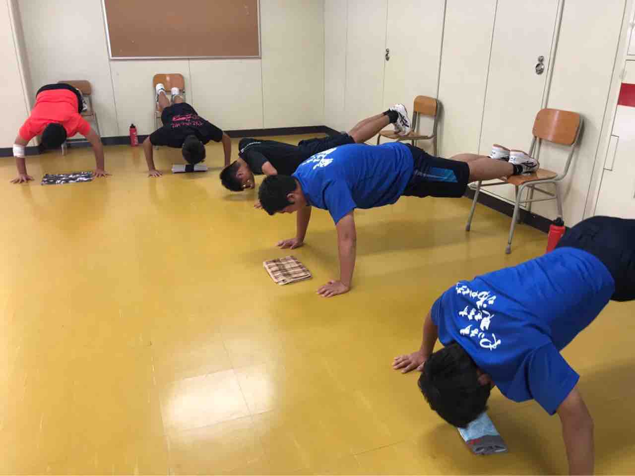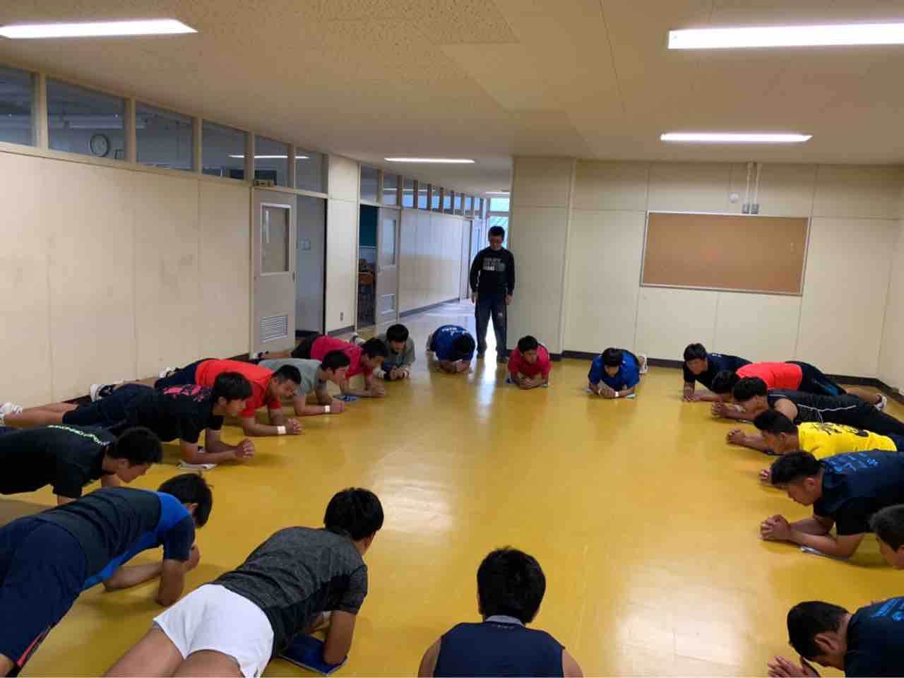SCは堀先生やリーダー陣が少ない中、残ったメンバーでしっかり集中して取り組みました。上級生は以前に重さを重くするだけでなく正しいフォームでやることを意識してやろうという反省があってから、鏡を見てゆっくりフォームを確認していたり同じグループの人たちで見あったりしてより意味のある練習となりました。