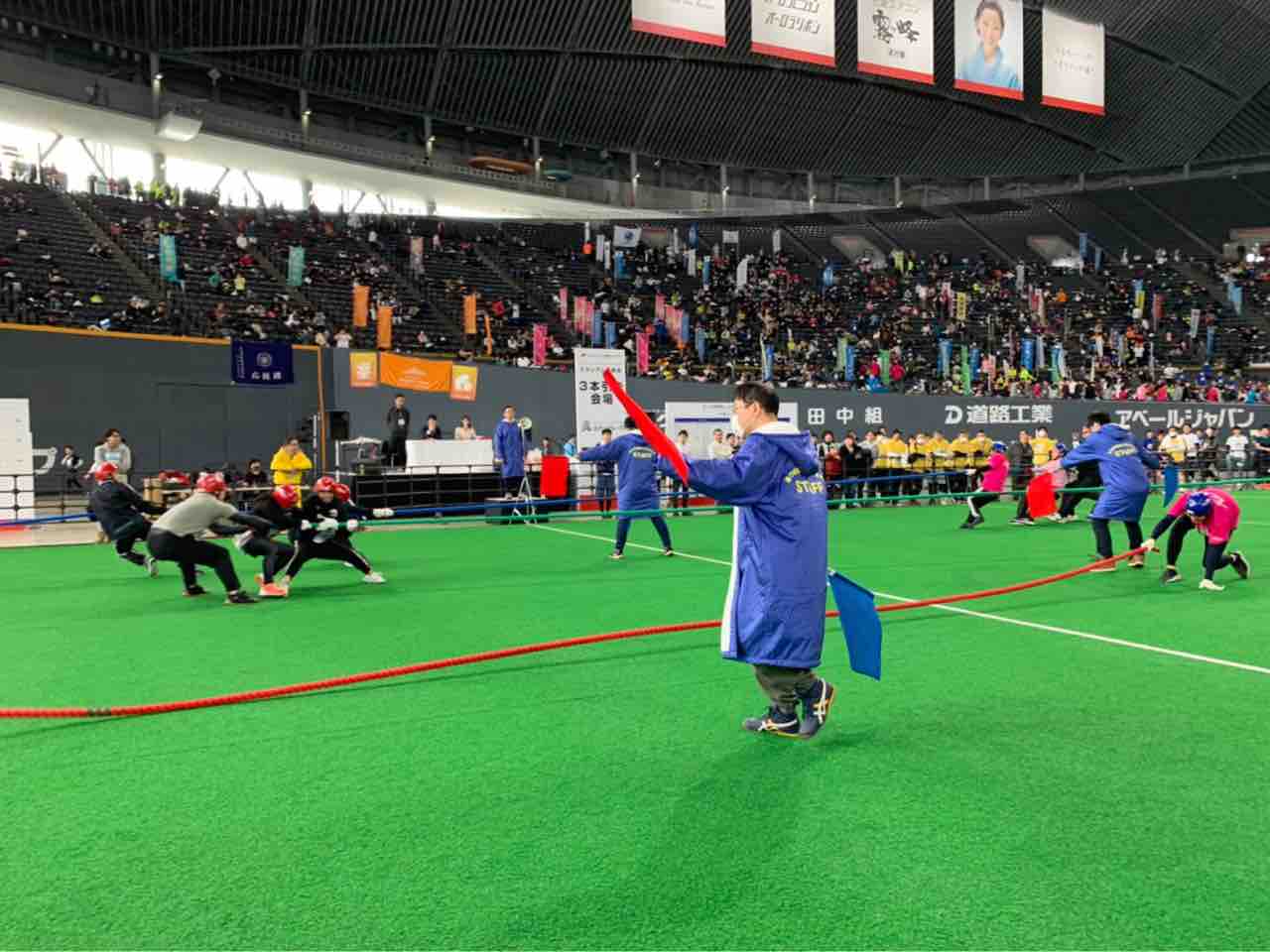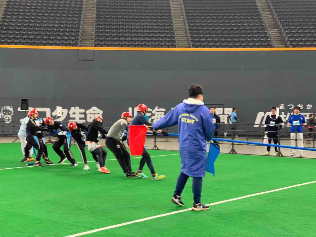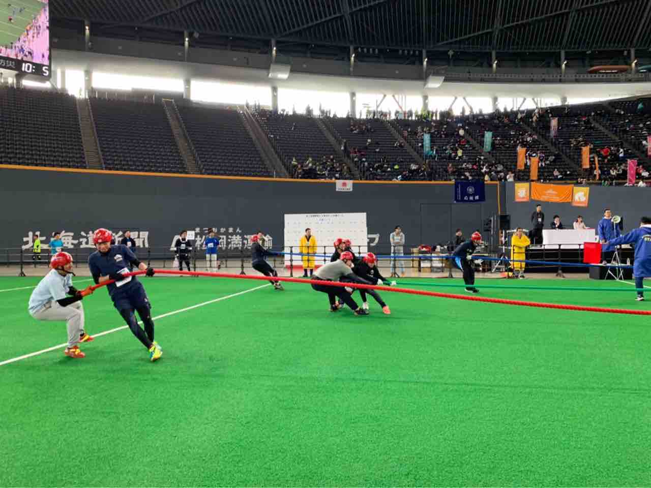 札幌厚別ラグビー部は、綱引き(3本引き)に出場しました。8人1チームで40秒間戦い、先に2本抜いた方が勝利となります。