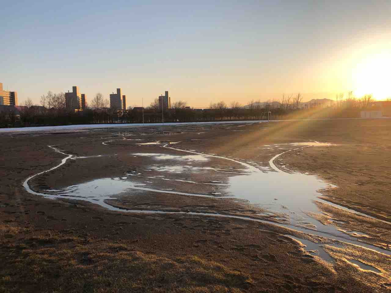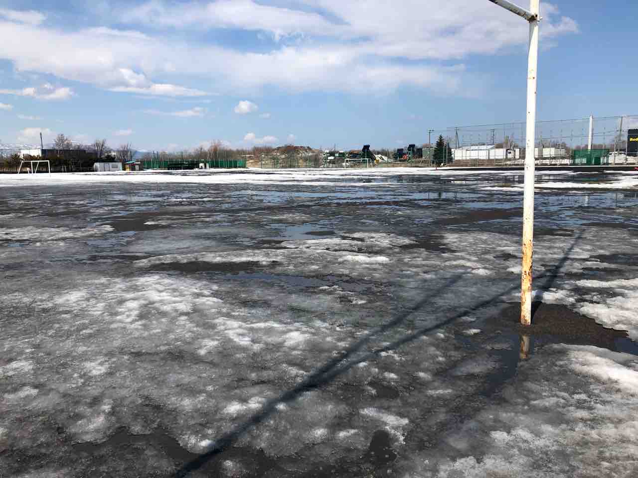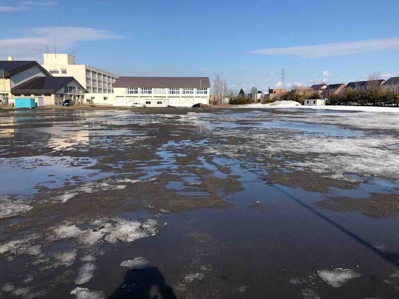 グランドに使った水路から側溝は勢いよく水が流れていきます。とても気持ちが良いです。グランドの雪解け水が流れ出ていくことで、土のグランドへまた一歩大きく前進です。