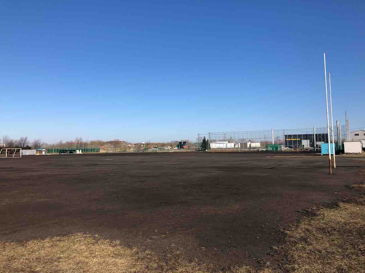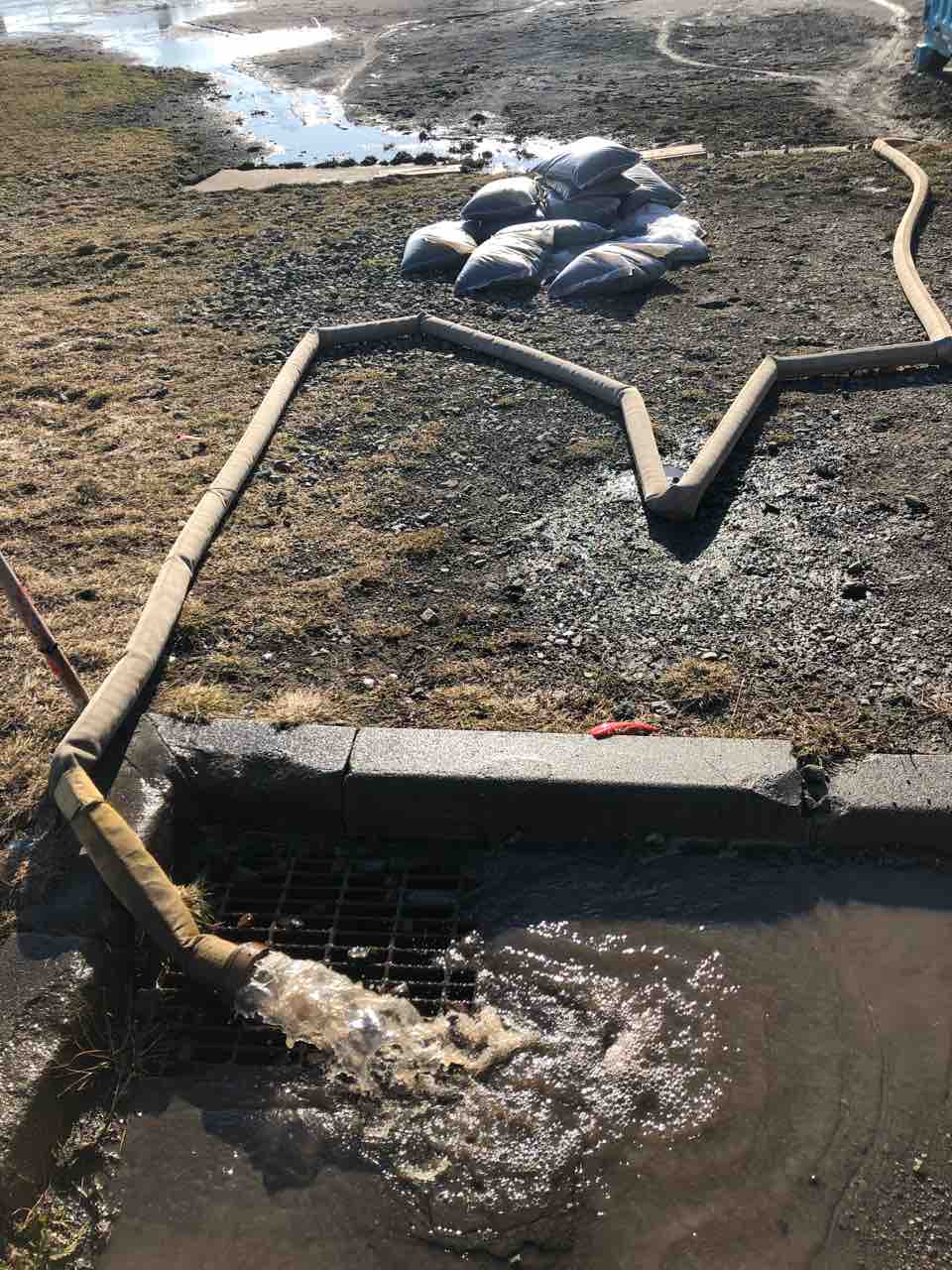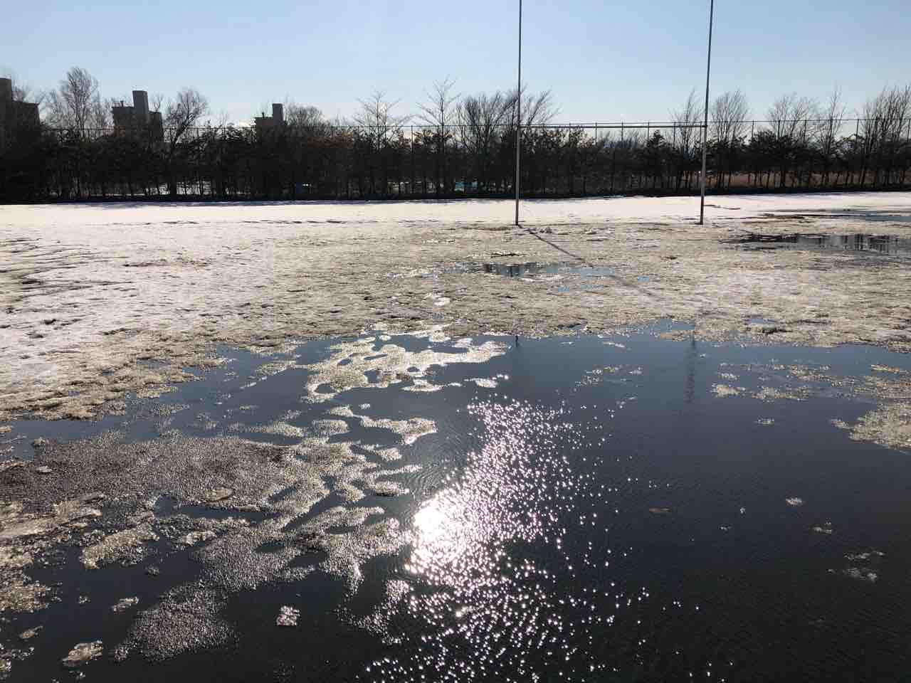 グランドに使った水路から側溝は勢いよく水が流れていきます。とても気持ちが良いです。グランドの雪解け水が流れ出ていくことで、土のグランドへまた一歩大きく前進です。