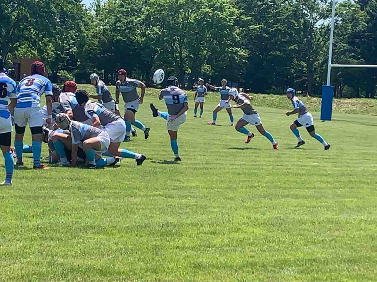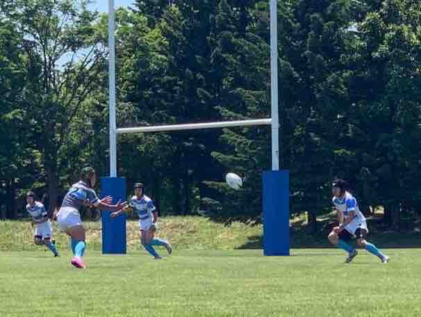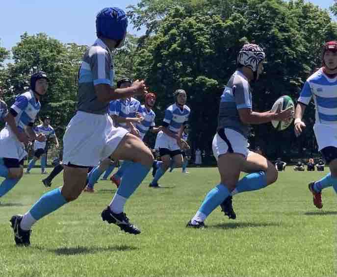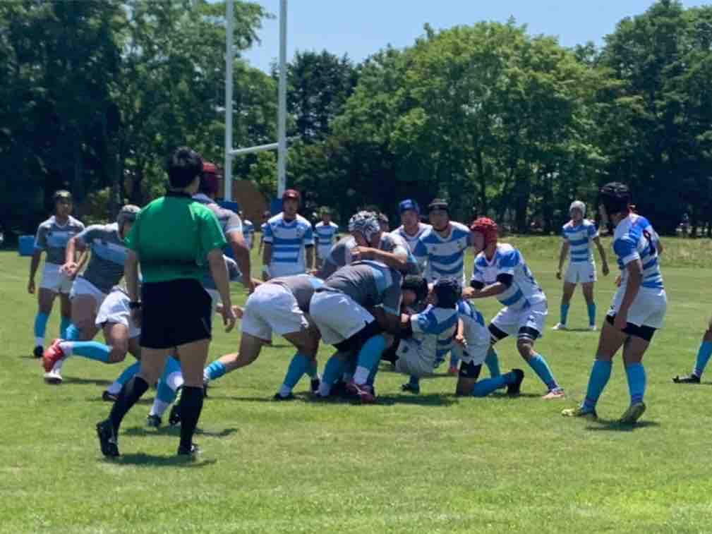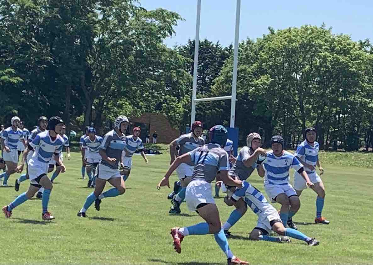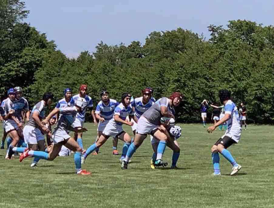 11:45キックオフ、25分ハーフで前半戦がスタートしました。敵陣に攻め込み、チャンスを作るもペナルティーやノックオンでなかなかトライにつながりませんでした。開始17分で、モールから押し込み庭田がトライを取りました。その後も攻防を繰り広げましたが、前半は、5(1T0G)-0という結果でハーフタイムに移りました。