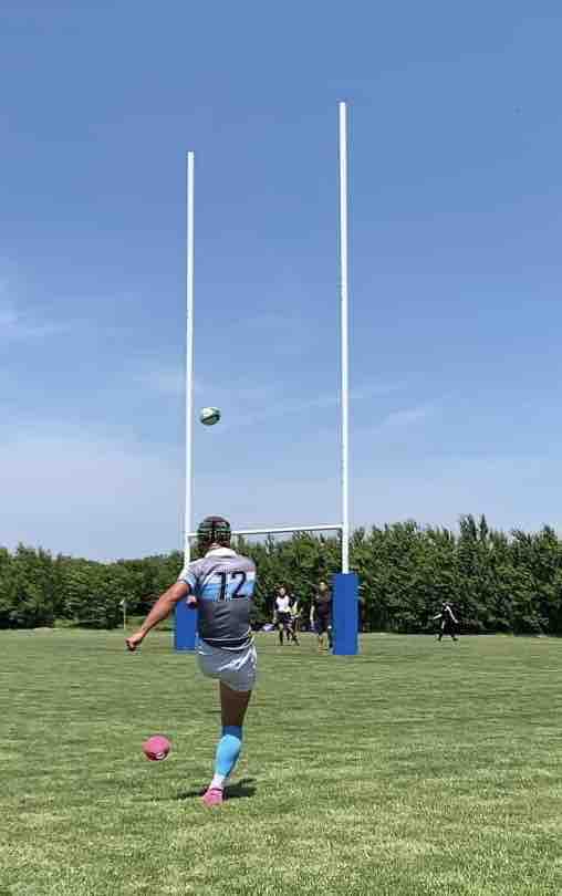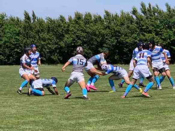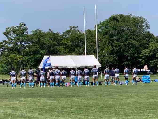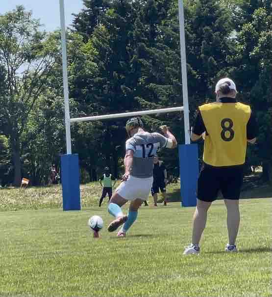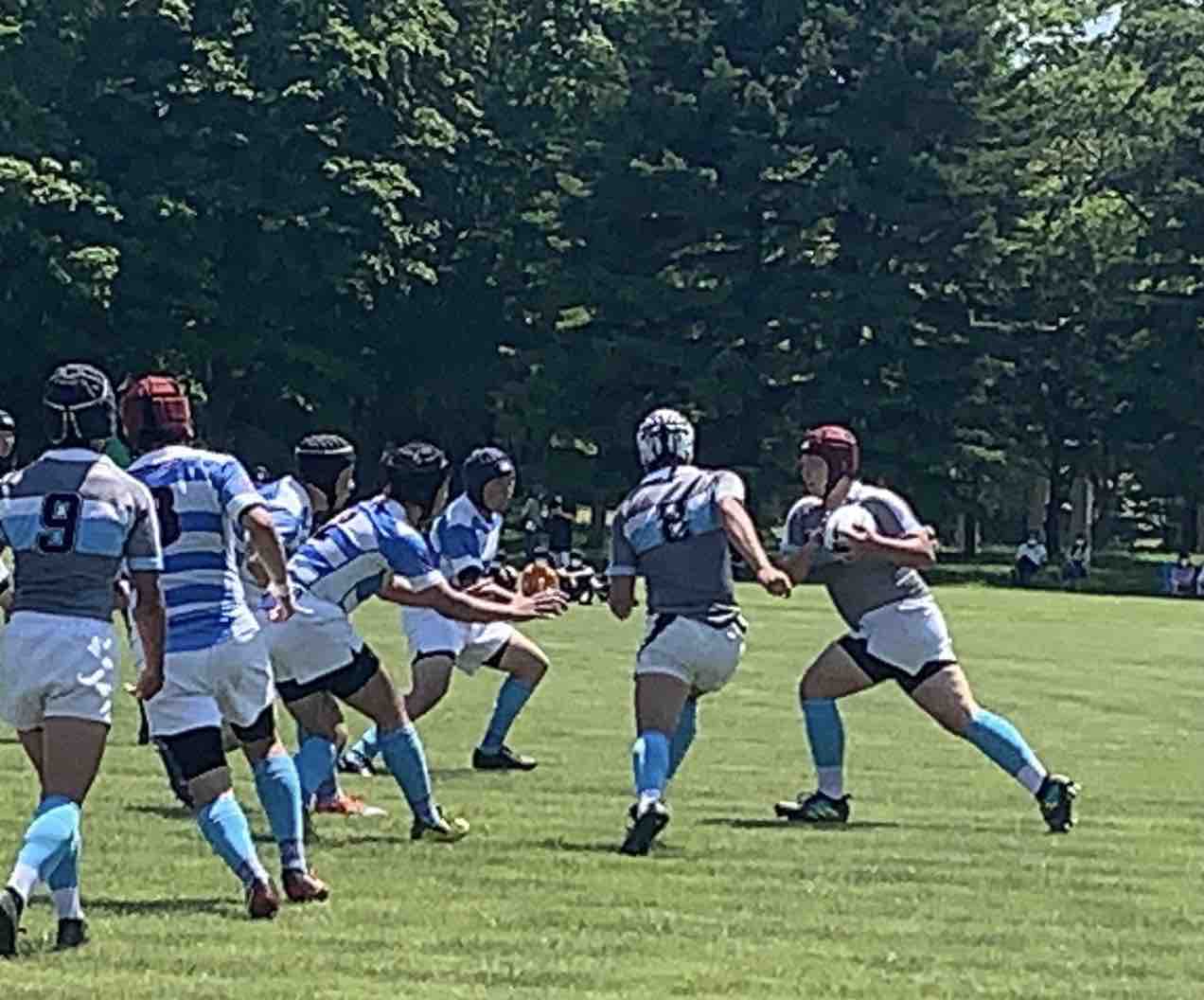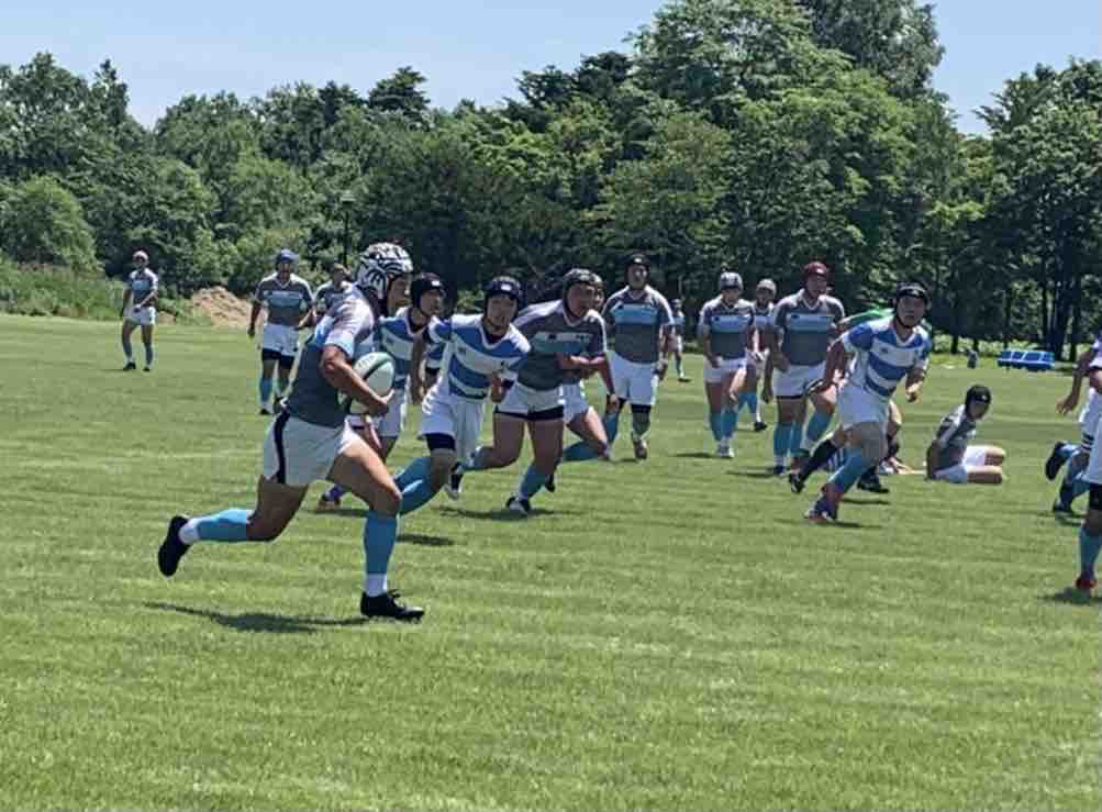 11:45キックオフ、25分ハーフで前半戦がスタートしました。敵陣に攻め込み、チャンスを作るもペナルティーやノックオンでなかなかトライにつながりませんでした。開始17分で、モールから押し込み庭田がトライを取りました。その後も攻防を繰り広げましたが、前半は、5(1T0G)-0という結果でハーフタイムに移りました。