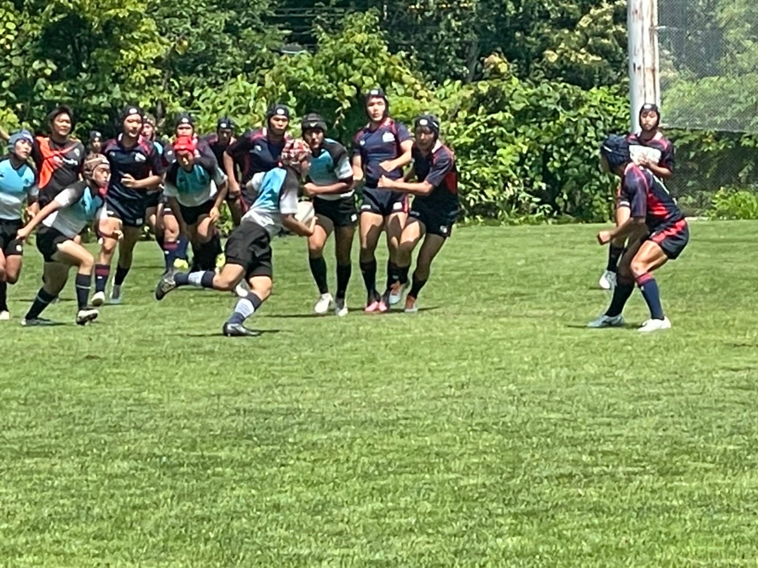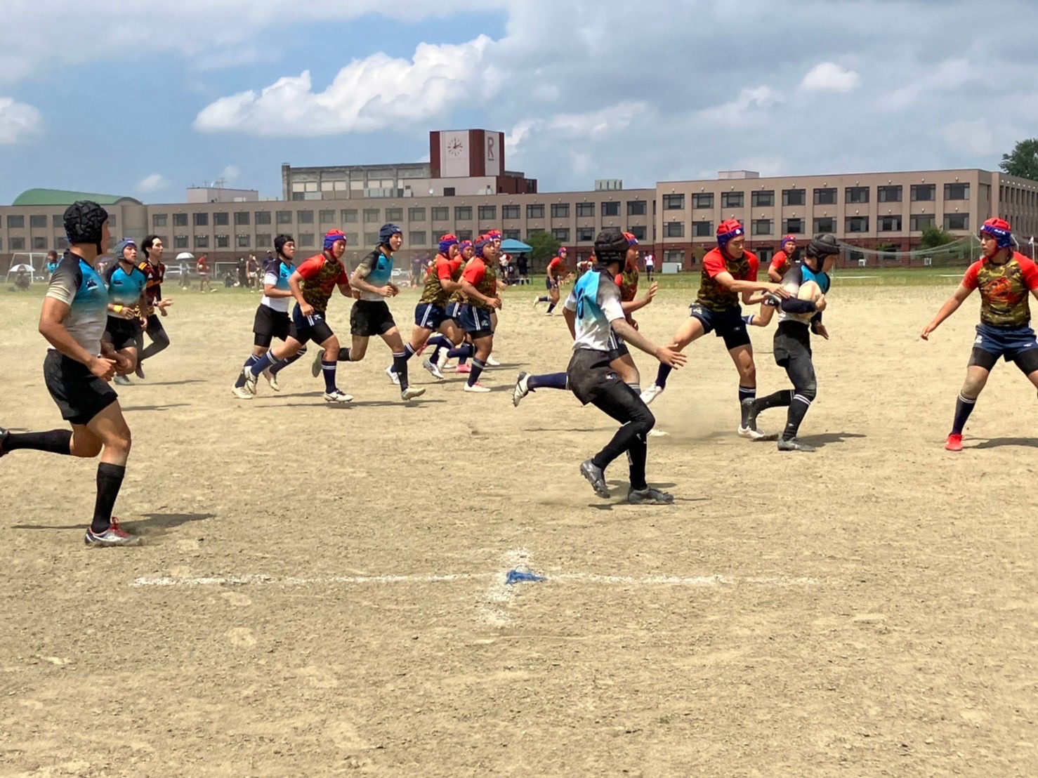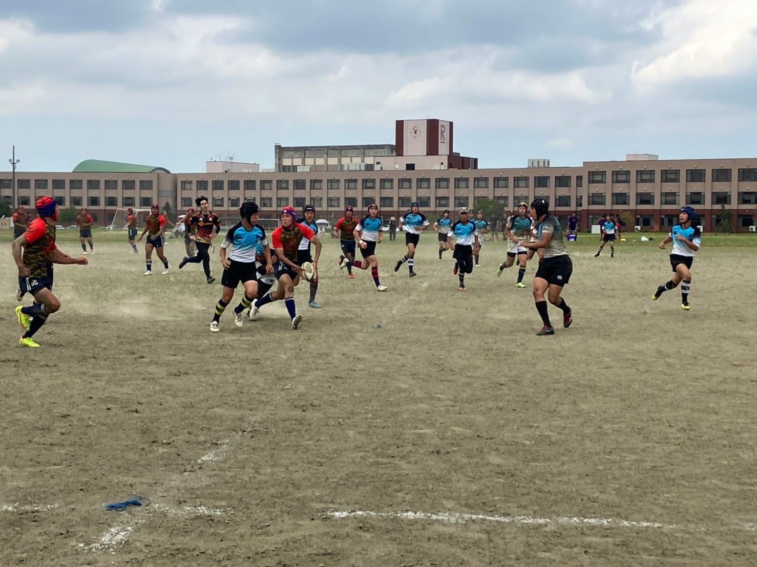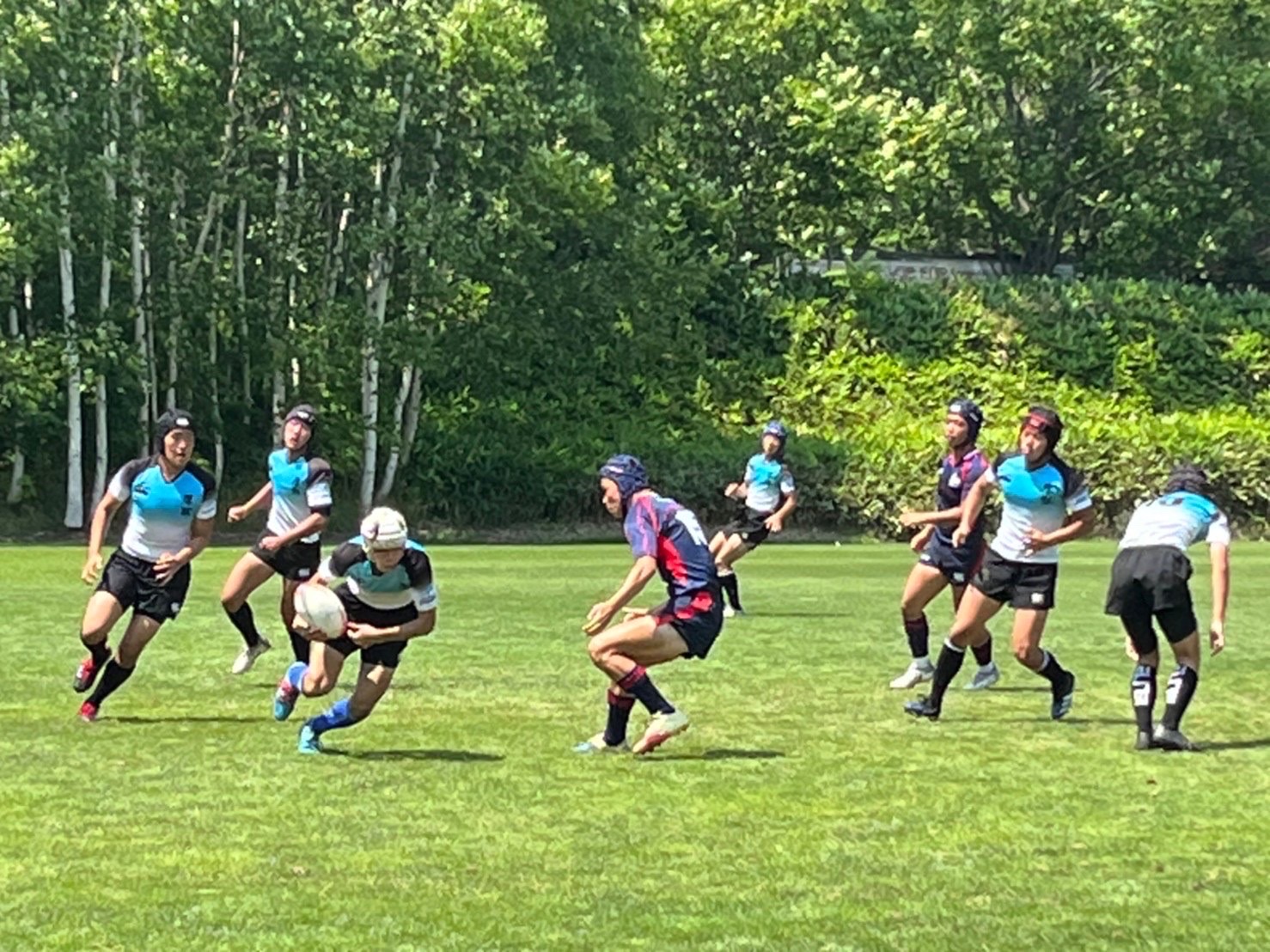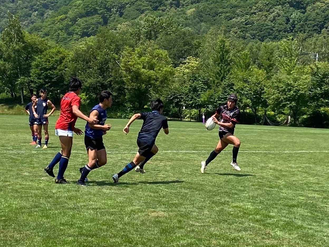 試合は20分で行い、1試合目は函館ラ・サールと対戦しました。開始早々ハーフラインでの攻め合いが続きました。厚別のマイボールの時間が多いですが、なかなか前に進めていませんでした。キックミスなどでボールを手放した後に簡単に突破されてトライを許してしまいました。中盤エリアでのディフェンスが後手に回っていたので監督からは相手より早く立つようにとアドバイスをしていただき、気持ちを入れ直し試合に戻りました。開始5分半、平野がスクラムからDFの隙をつき突破してFBを引きつけて堀にパスを回しそのままトライ!その後、ディフェンスエラーから攻め込まれ、スクラムからの相手のサインプレーへの対応が後手に回りボールを外に回されトライを取られました。厚別もパスを回し前に出ようとしますが、ノックオンやパスミスが目立っているように感じました。その後自陣のゴール近くまで攻められますが、キックで一気に敵陣ゴール前まで進みます。上田が相手をかわしゴール直前まで攻め込んでラックに。梅本が直ぐにボールをピックしてインゴールに飛び込んでトライを決め、試合が終了しました。結果は14(2T2G)-14(2T2G)の同点でした。