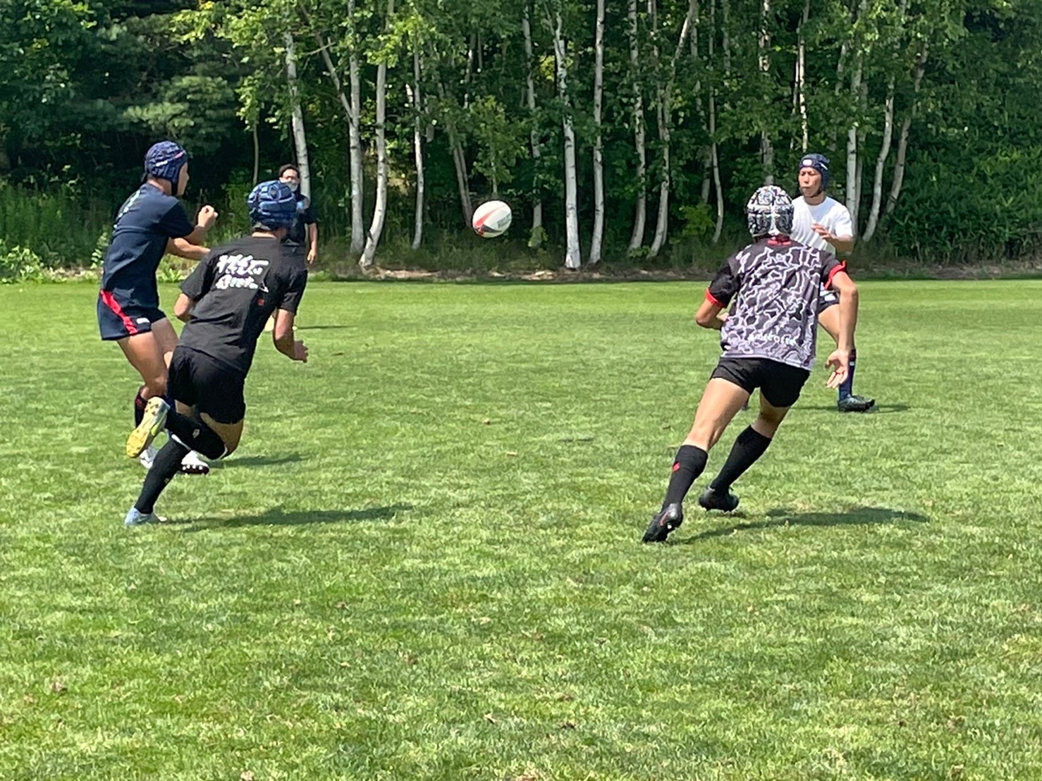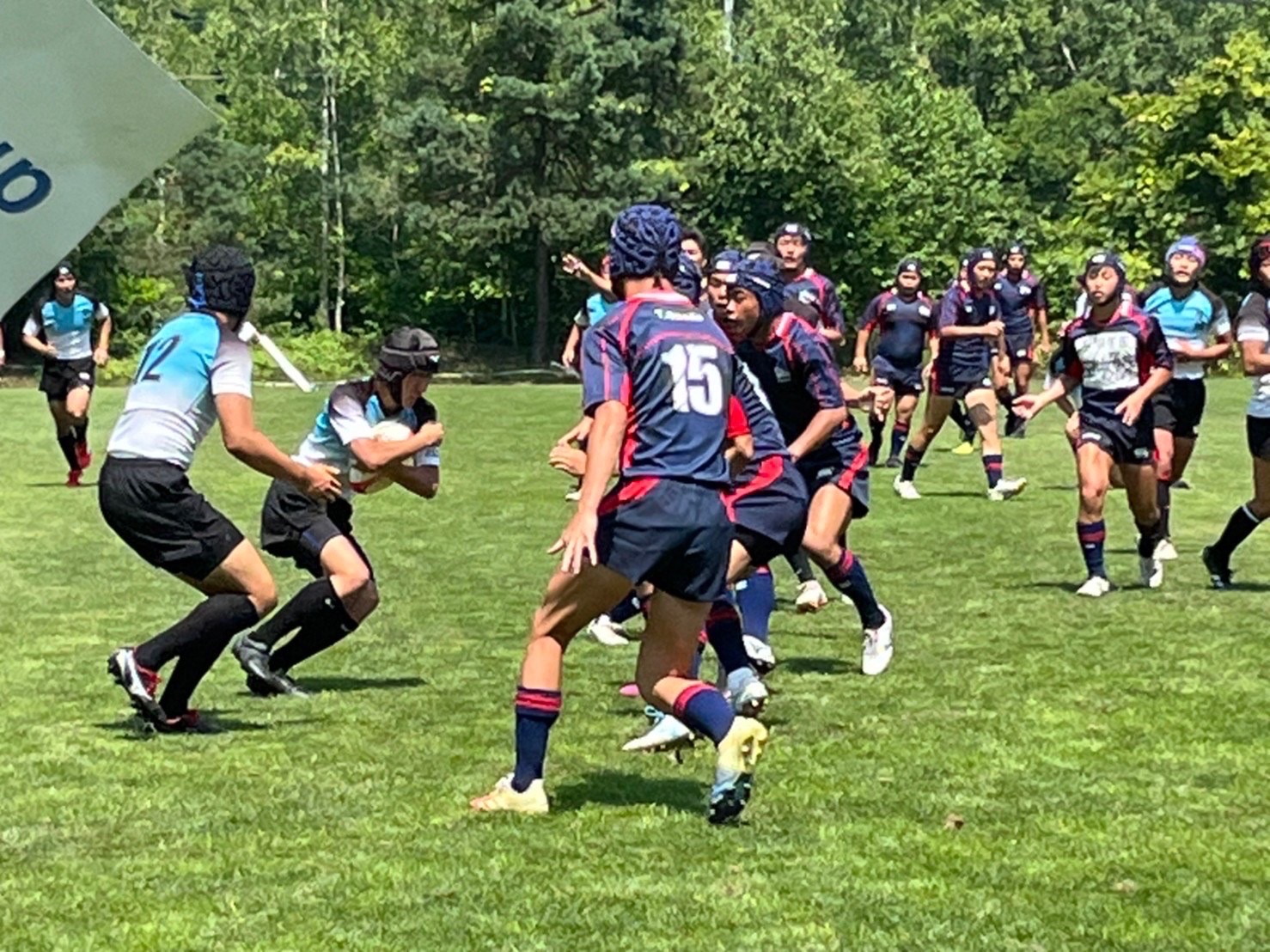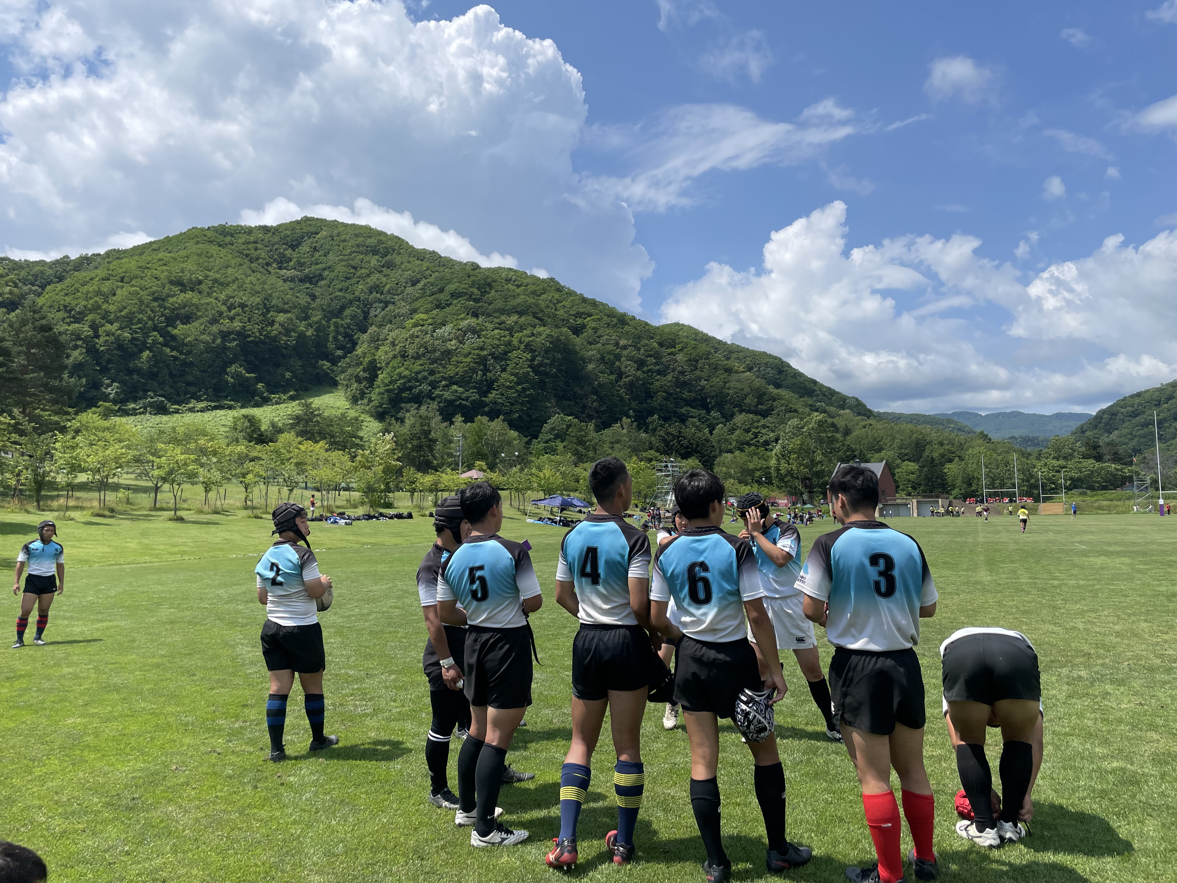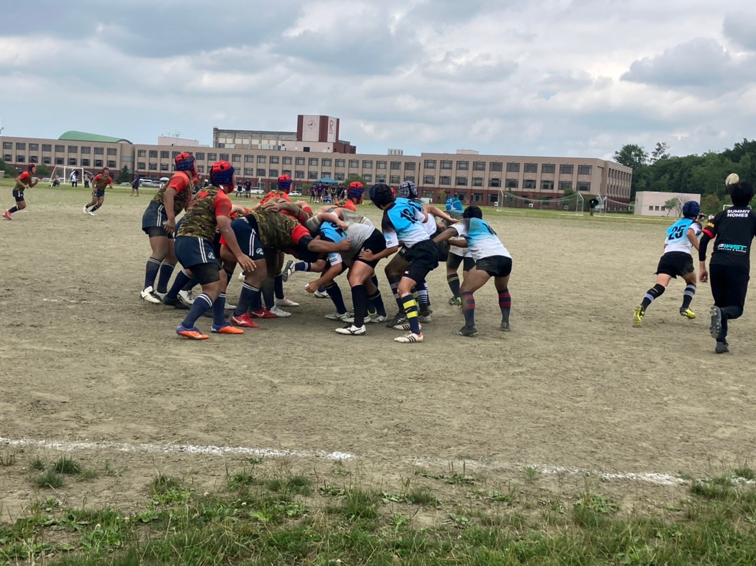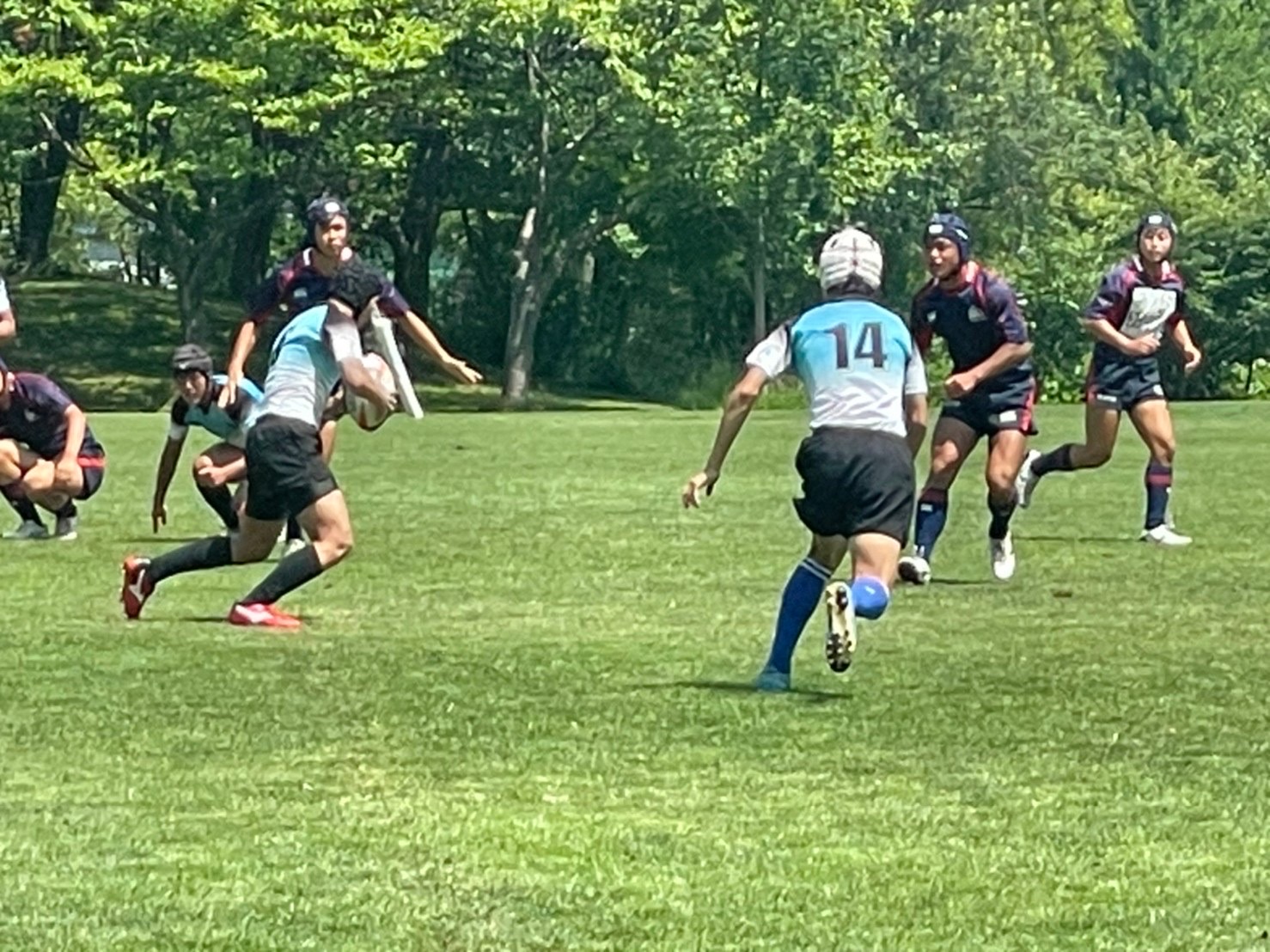 試合は20分で行い、1試合目は函館ラ・サールと対戦しました。開始早々ハーフラインでの攻め合いが続きました。厚別のマイボールの時間が多いですが、なかなか前に進めていませんでした。キックミスなどでボールを手放した後に簡単に突破されてトライを許してしまいました。中盤エリアでのディフェンスが後手に回っていたので監督からは相手より早く立つようにとアドバイスをしていただき、気持ちを入れ直し試合に戻りました。開始5分半、平野がスクラムからDFの隙をつき突破してFBを引きつけて堀にパスを回しそのままトライ!その後、ディフェンスエラーから攻め込まれ、スクラムからの相手のサインプレーへの対応が後手に回りボールを外に回されトライを取られました。厚別もパスを回し前に出ようとしますが、ノックオンやパスミスが目立っているように感じました。その後自陣のゴール近くまで攻められますが、キックで一気に敵陣ゴール前まで進みます。上田が相手をかわしゴール直前まで攻め込んでラックに。梅本が直ぐにボールをピックしてインゴールに飛び込んでトライを決め、試合が終了しました。結果は14(2T2G)-14(2T2G)の同点でした。