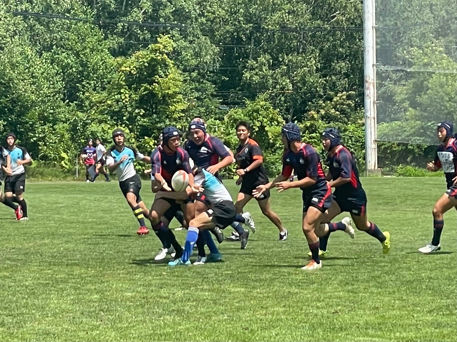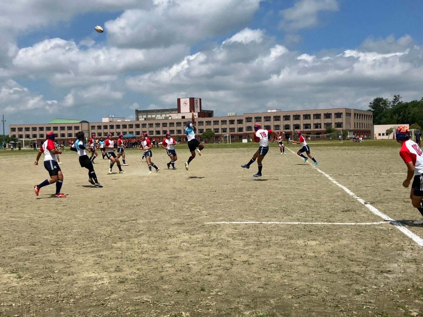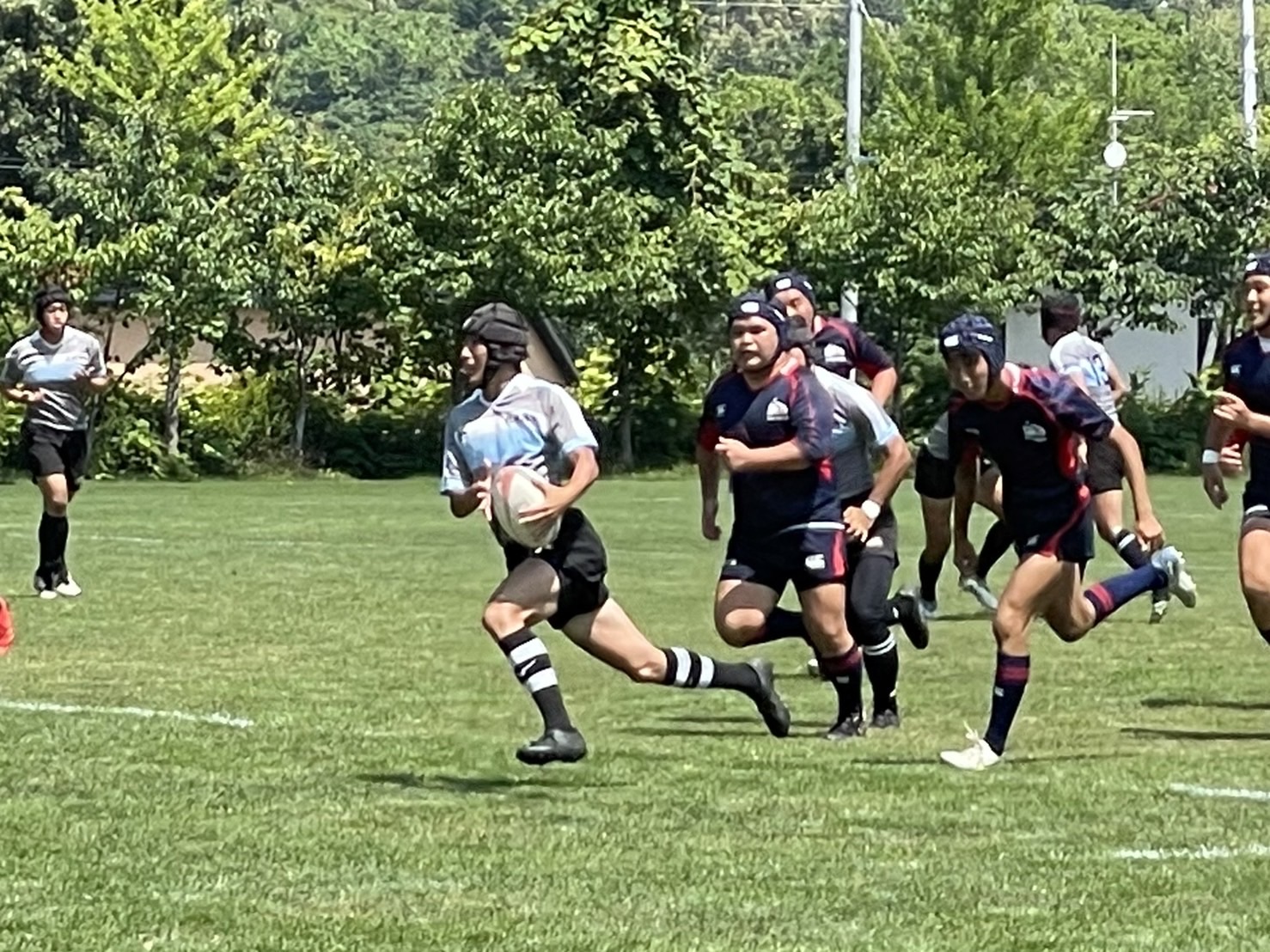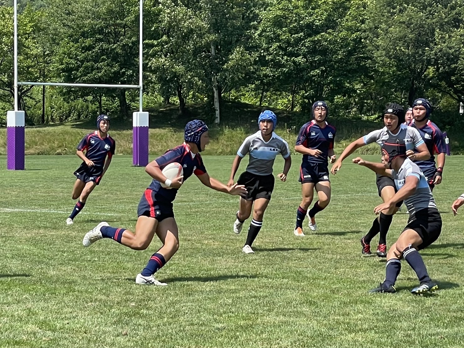 試合は20分で行い、1試合目は函館ラ・サールと対戦しました。開始早々ハーフラインでの攻め合いが続きました。厚別のマイボールの時間が多いですが、なかなか前に進めていませんでした。キックミスなどでボールを手放した後に簡単に突破されてトライを許してしまいました。中盤エリアでのディフェンスが後手に回っていたので監督からは相手より早く立つようにとアドバイスをしていただき、気持ちを入れ直し試合に戻りました。開始5分半、平野がスクラムからDFの隙をつき突破してFBを引きつけて堀にパスを回しそのままトライ!その後、ディフェンスエラーから攻め込まれ、スクラムからの相手のサインプレーへの対応が後手に回りボールを外に回されトライを取られました。厚別もパスを回し前に出ようとしますが、ノックオンやパスミスが目立っているように感じました。その後自陣のゴール近くまで攻められますが、キックで一気に敵陣ゴール前まで進みます。上田が相手をかわしゴール直前まで攻め込んでラックに。梅本が直ぐにボールをピックしてインゴールに飛び込んでトライを決め、試合が終了しました。結果は14(2T2G)-14(2T2G)の同点でした。