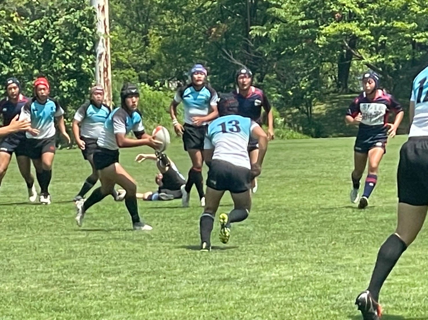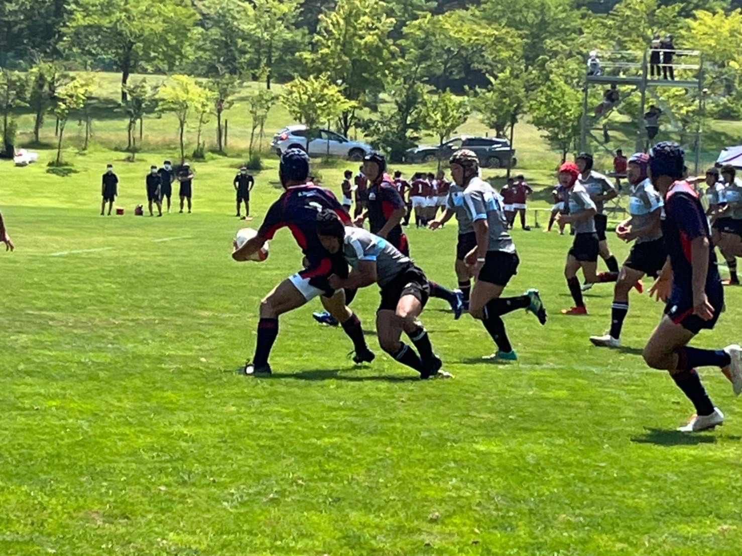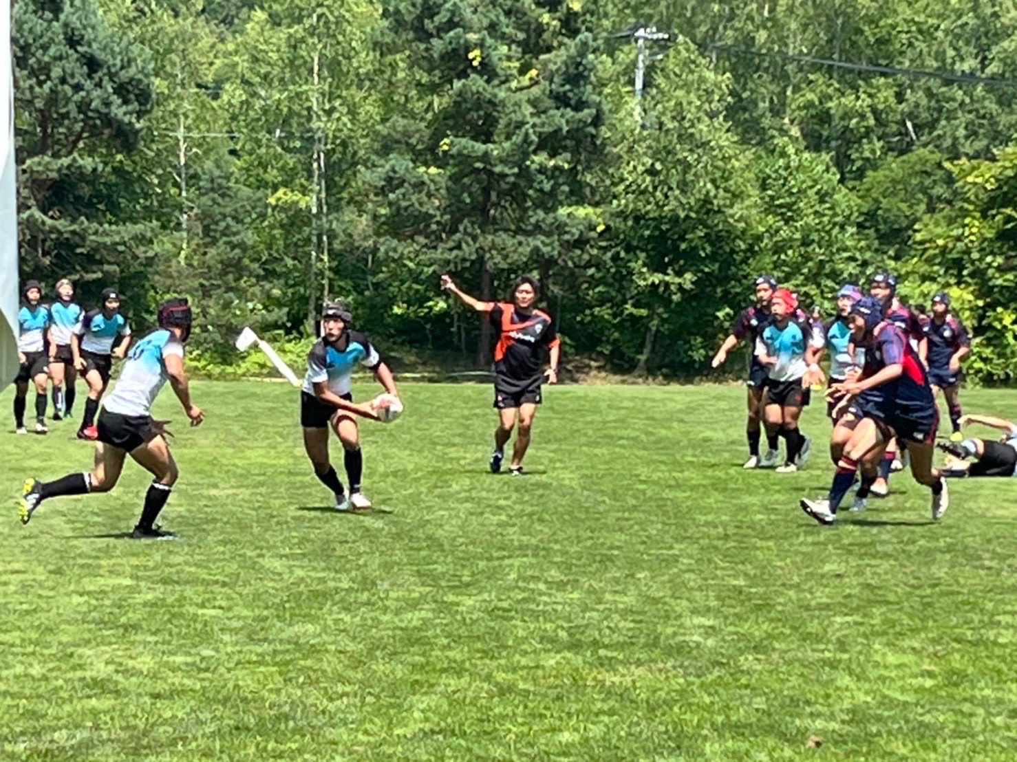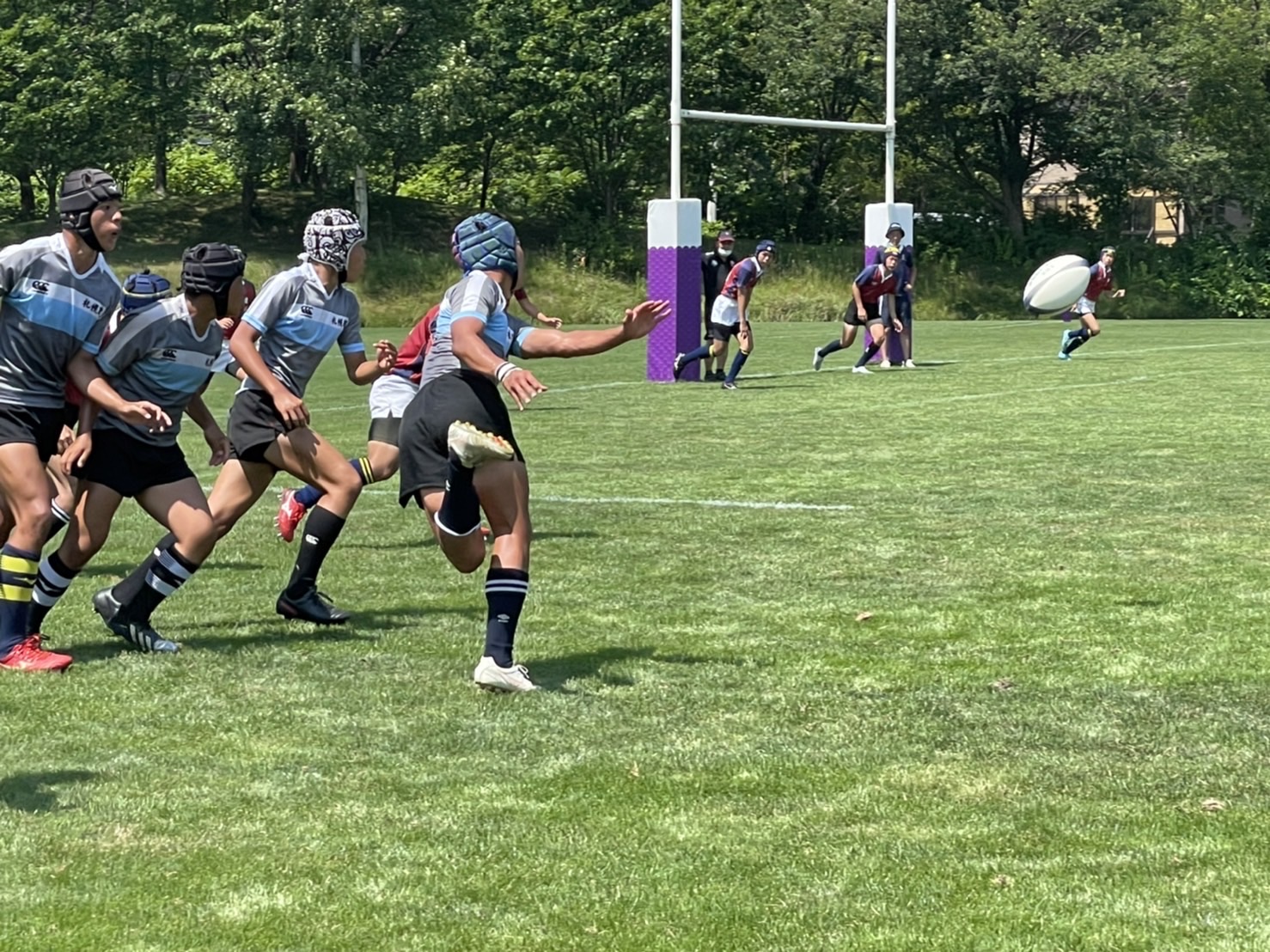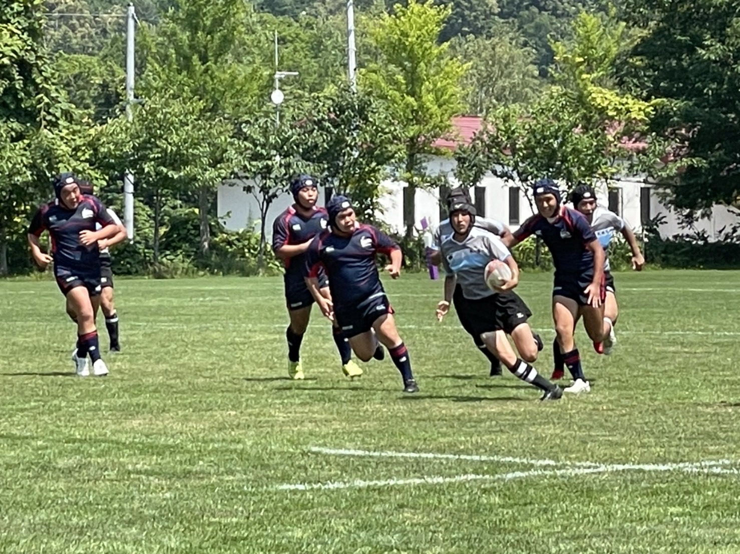 試合は20分で行い、1試合目は函館ラ・サールと対戦しました。開始早々ハーフラインでの攻め合いが続きました。厚別のマイボールの時間が多いですが、なかなか前に進めていませんでした。キックミスなどでボールを手放した後に簡単に突破されてトライを許してしまいました。中盤エリアでのディフェンスが後手に回っていたので監督からは相手より早く立つようにとアドバイスをしていただき、気持ちを入れ直し試合に戻りました。開始5分半、平野がスクラムからDFの隙をつき突破してFBを引きつけて堀にパスを回しそのままトライ!その後、ディフェンスエラーから攻め込まれ、スクラムからの相手のサインプレーへの対応が後手に回りボールを外に回されトライを取られました。厚別もパスを回し前に出ようとしますが、ノックオンやパスミスが目立っているように感じました。その後自陣のゴール近くまで攻められますが、キックで一気に敵陣ゴール前まで進みます。上田が相手をかわしゴール直前まで攻め込んでラックに。梅本が直ぐにボールをピックしてインゴールに飛び込んでトライを決め、試合が終了しました。結果は14(2T2G)-14(2T2G)の同点でした。