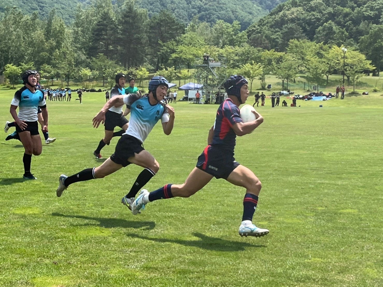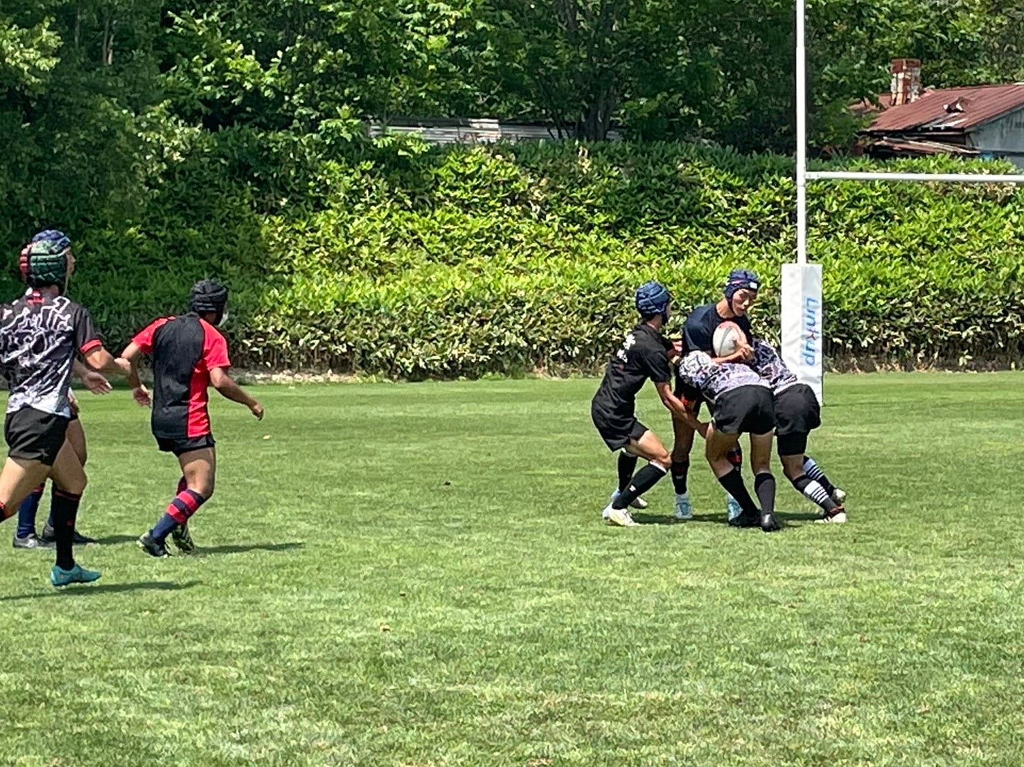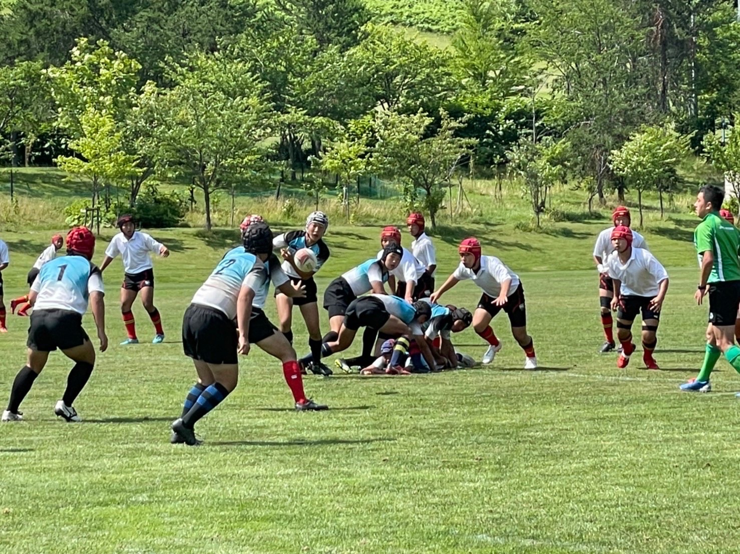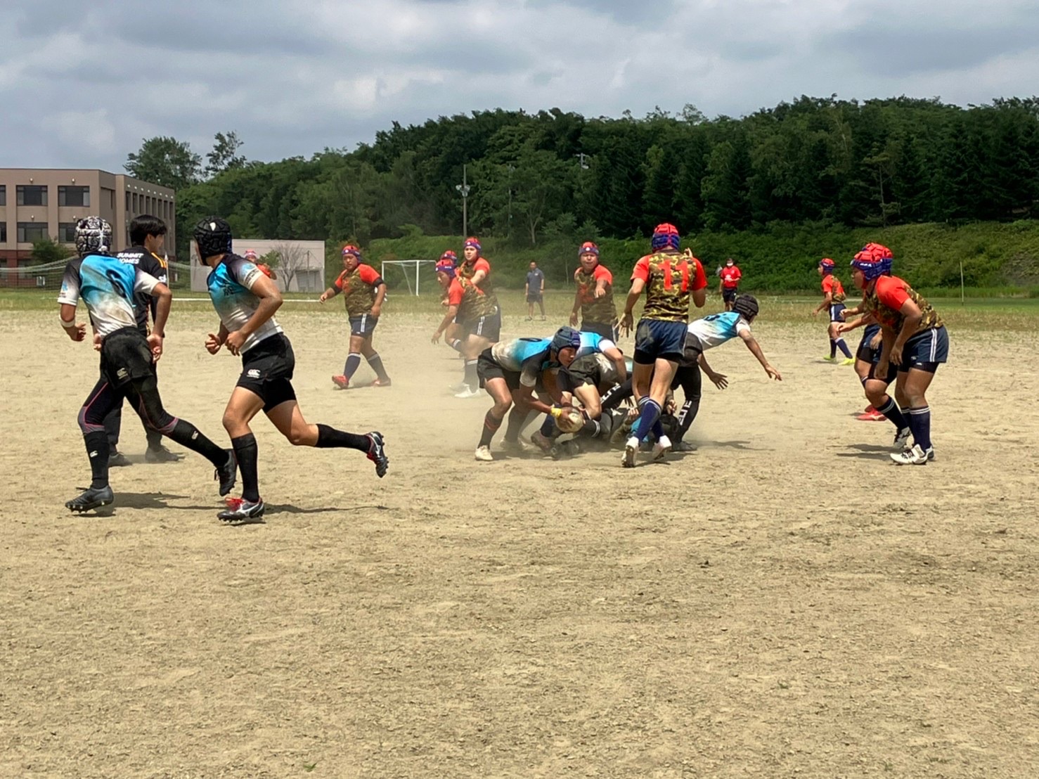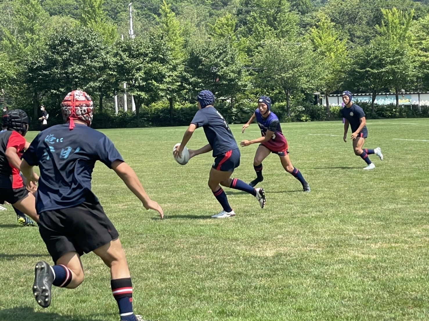試合は20分で行い、1試合目は函館ラ・サールと対戦しました。開始早々ハーフラインでの攻め合いが続きました。厚別のマイボールの時間が多いですが、なかなか前に進めていませんでした。キックミスなどでボールを手放した後に簡単に突破されてトライを許してしまいました。中盤エリアでのディフェンスが後手に回っていたので監督からは相手より早く立つようにとアドバイスをしていただき、気持ちを入れ直し試合に戻りました。開始5分半、平野がスクラムからDFの隙をつき突破してFBを引きつけて堀にパスを回しそのままトライ!その後、ディフェンスエラーから攻め込まれ、スクラムからの相手のサインプレーへの対応が後手に回りボールを外に回されトライを取られました。厚別もパスを回し前に出ようとしますが、ノックオンやパスミスが目立っているように感じました。その後自陣のゴール近くまで攻められますが、キックで一気に敵陣ゴール前まで進みます。上田が相手をかわしゴール直前まで攻め込んでラックに。梅本が直ぐにボールをピックしてインゴールに飛び込んでトライを決め、試合が終了しました。結果は14(2T2G)-14(2T2G)の同点でした。