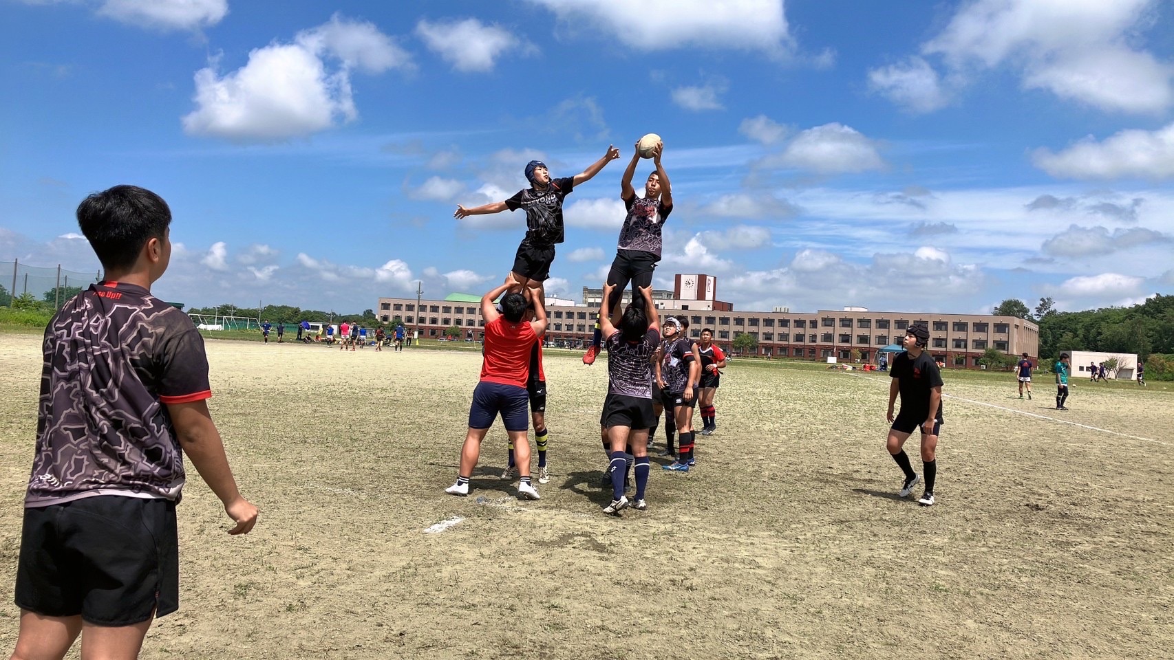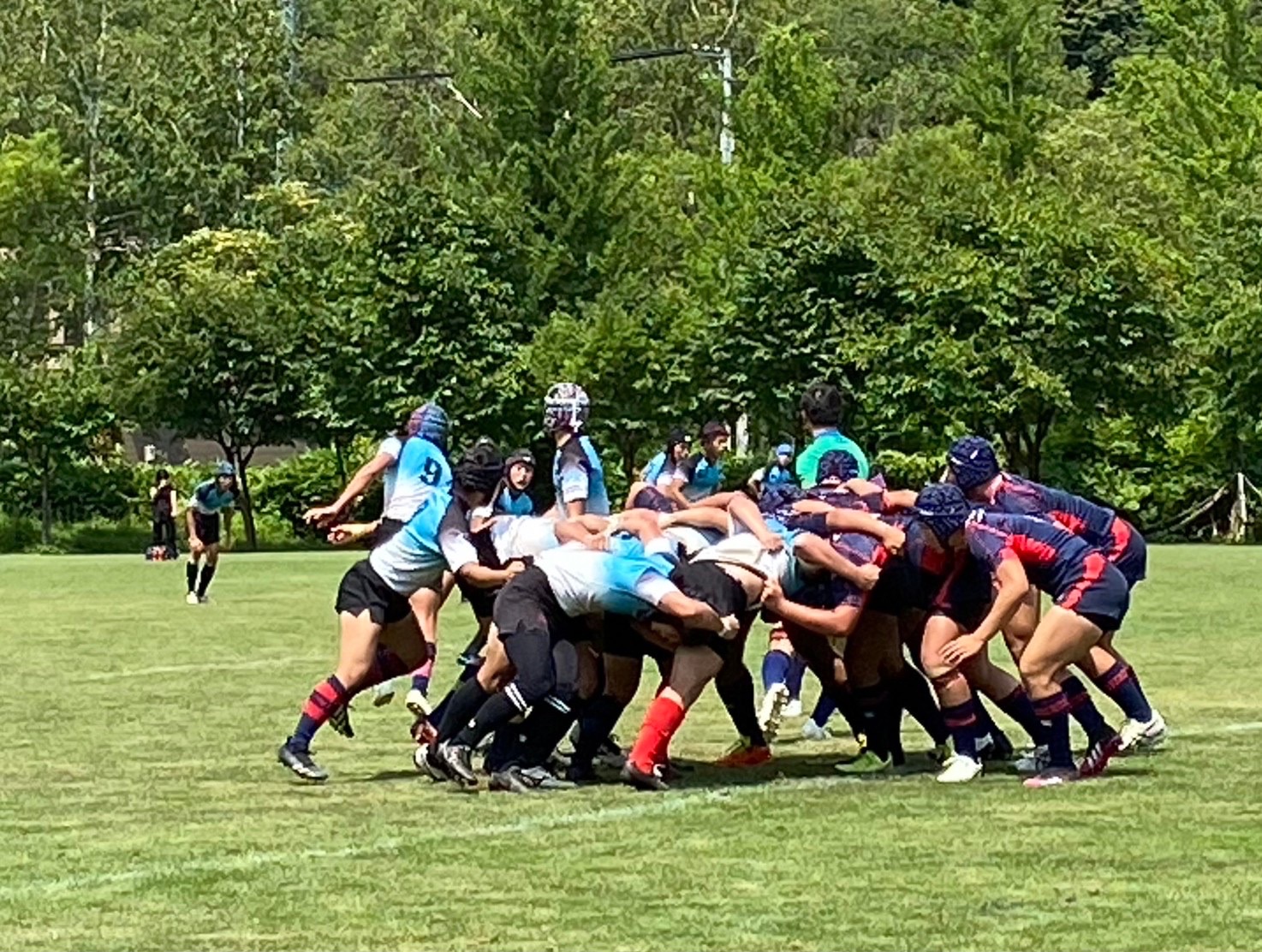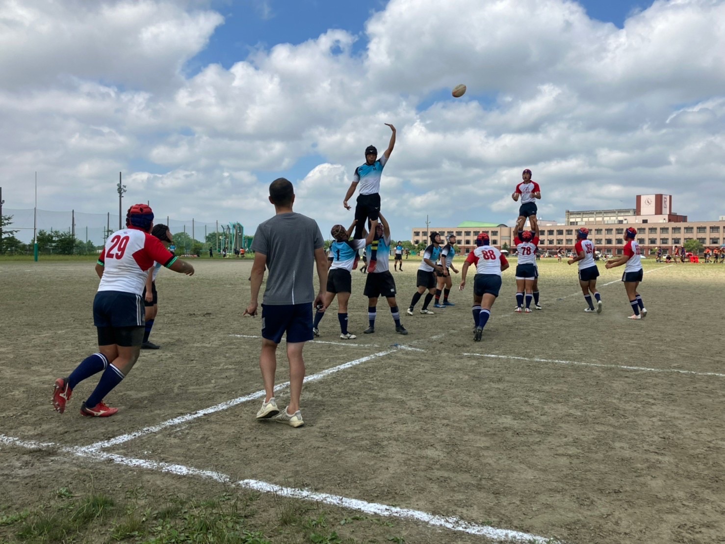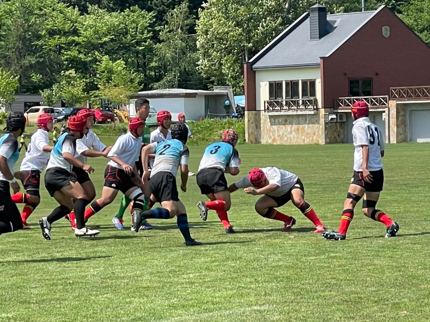 厚別ボールで試合がスタート。低い姿勢でタックルする事を意識していましたが、試合の状況を見ているとどうしても背中を上げてしまい、良いタックルができている選手が少ないように感じました。練習で学んだ事を試合で使えるよう、練習中から意識するようにしましょう。トライラインまで攻め込むも、ミスが発生し、トライを取りきれないなど大事な場面でのミスが目立ちました。勝利しましたが落ち着いて判断し、試合中に自分達で立ち直せるようにしていきましょう。