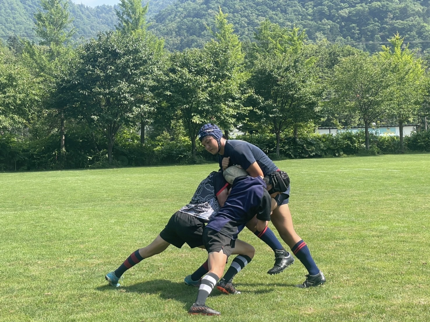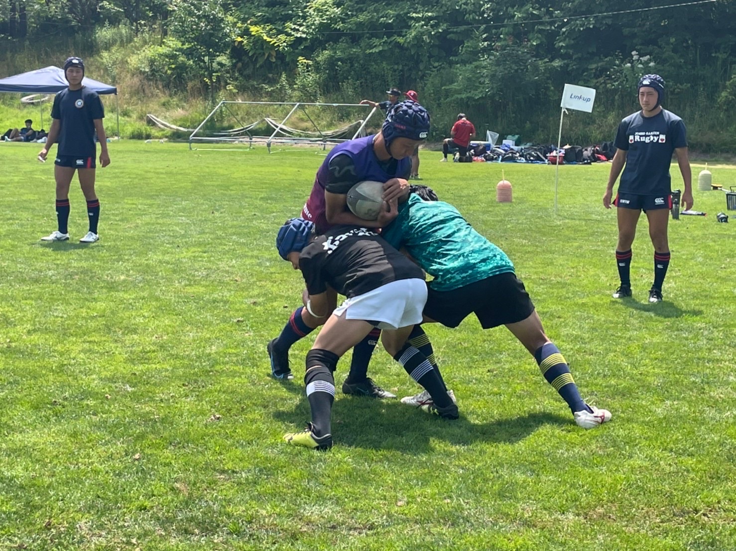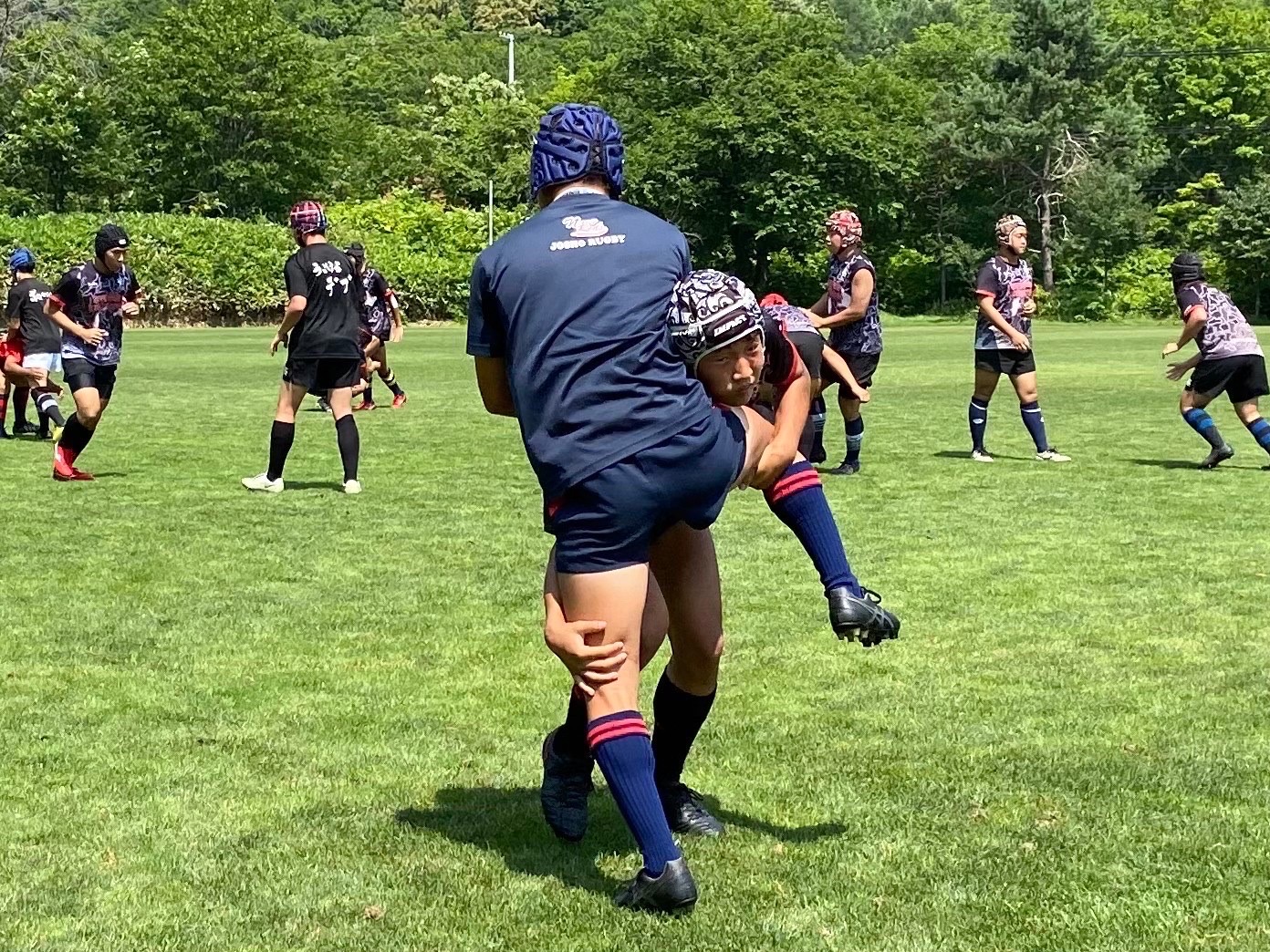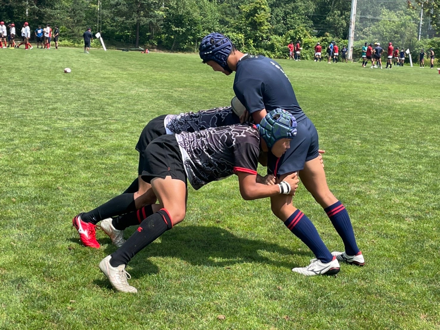 次に昨日の復習として1対1、1対2、連続タックルを行いました。胸を張って背中に力を入れること、顔を下げないで前を見ること、膝のバウンドを意識してタックルすることなど常翔の選手の方々に教えてもらいながら行いました。跳ね返されても強い姿勢を保とうという声がハドルトークから聞こえ、練習を理解する力が身に付いてきたと感じました。