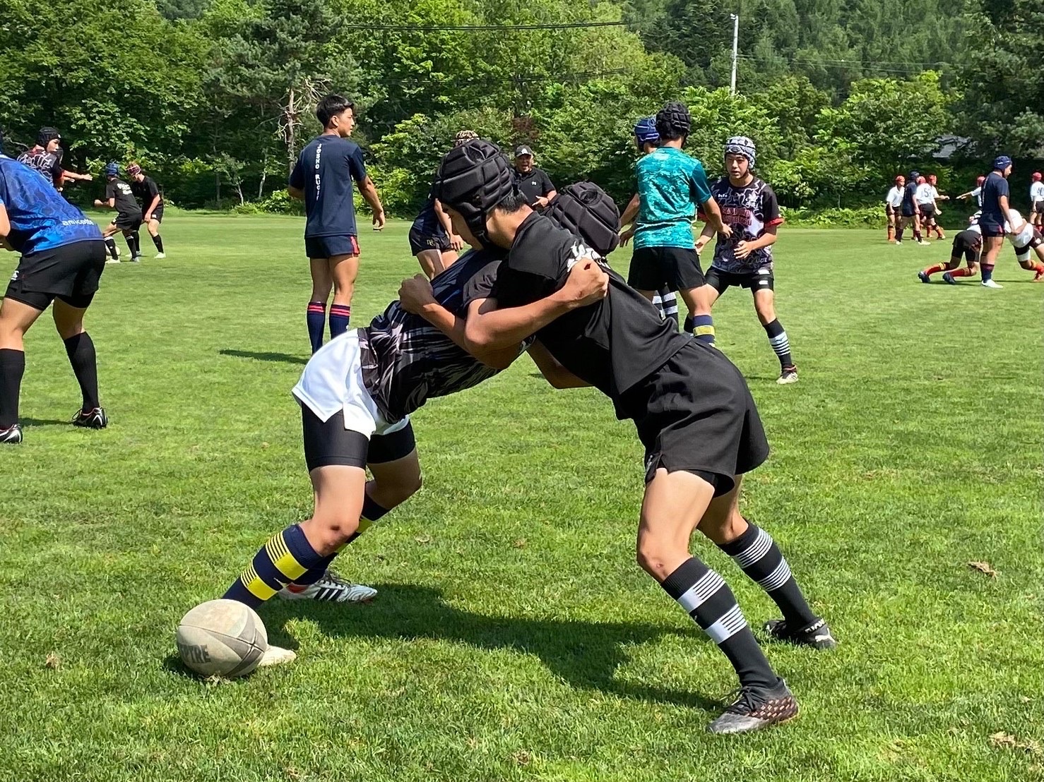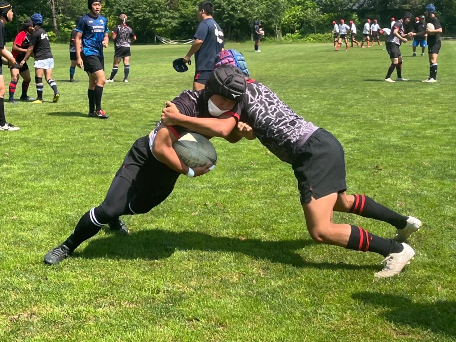 2人でのゲートでディフェンスを作る練習に移りました。1対1で学んだことを繋げることを心掛けました。ゲートは、首から腰を合わせ3人で三角形を作るイメージを持ちながら取り組みました。また、試合をイメージしてディフェンスするようにと指導していただきました。