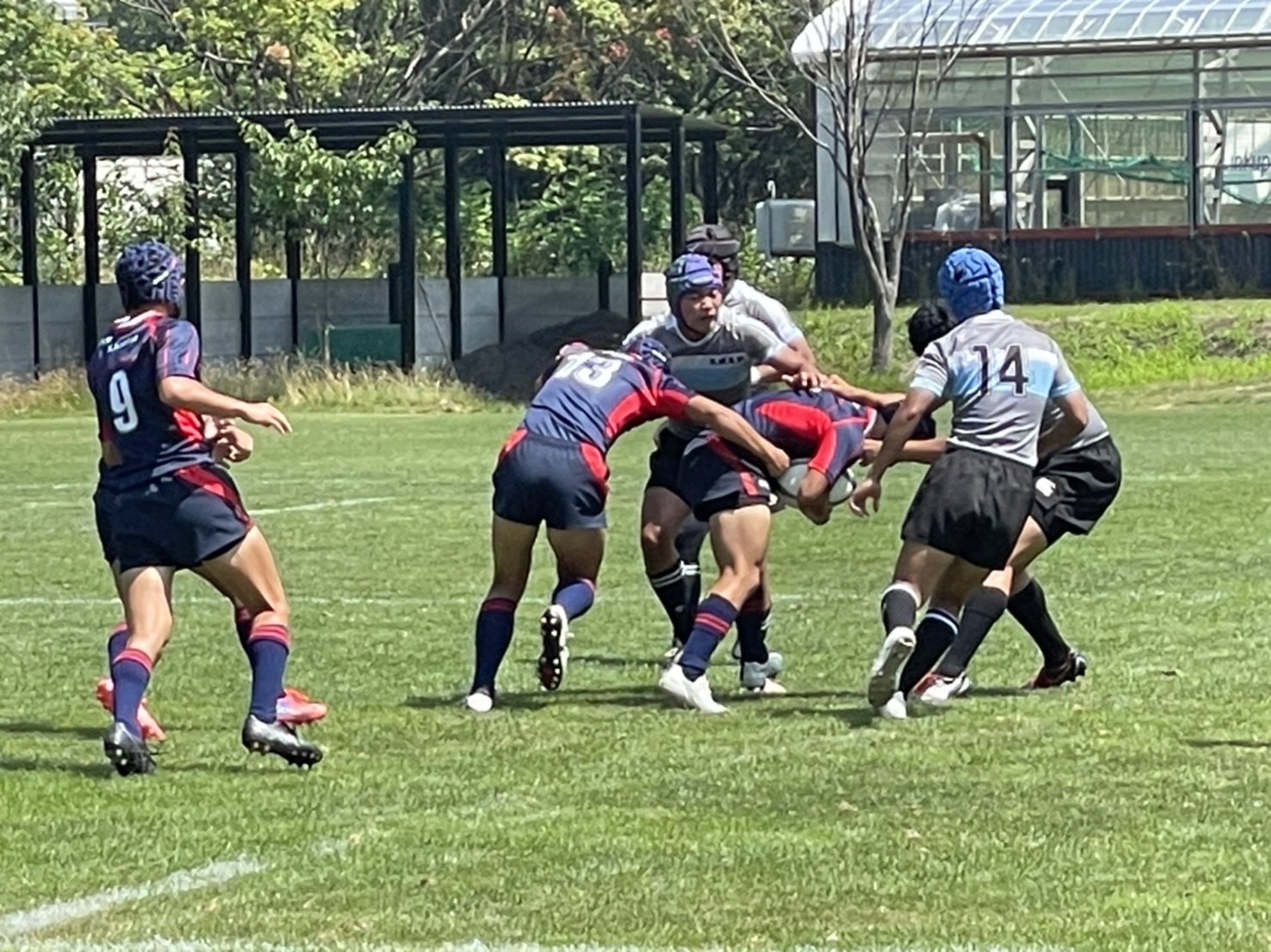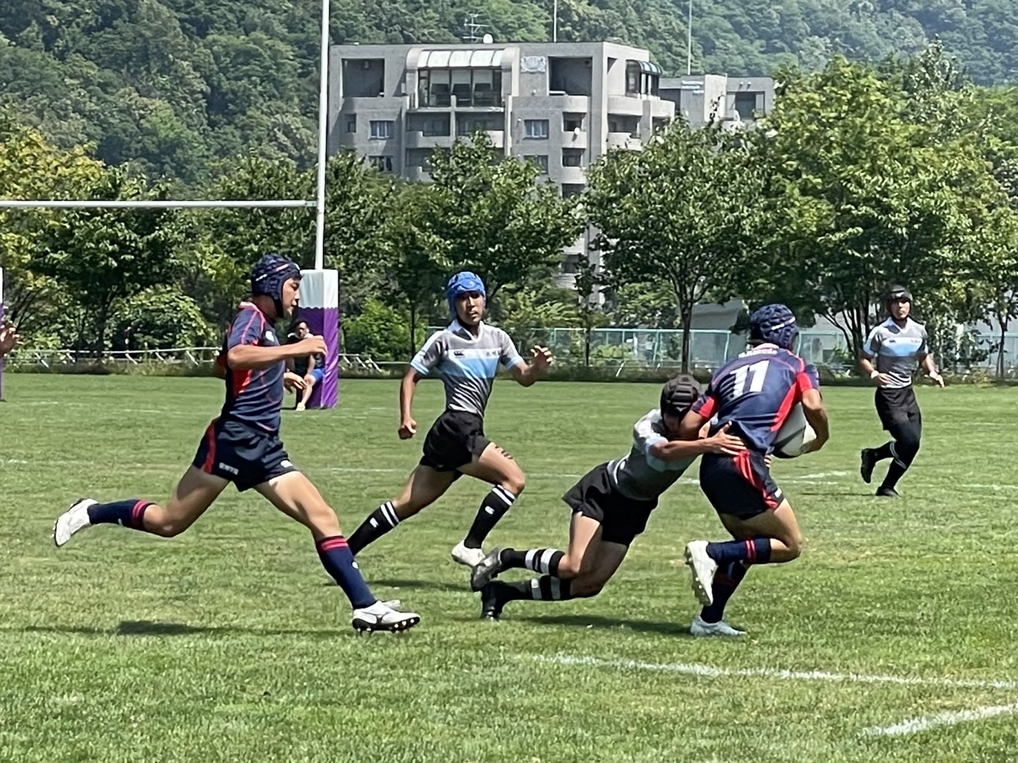 4試合目は厚別1年と立命館1年の合同チーム対神戸科技高の対戦でした。タックル時の姿勢が高く、相手に当たっていない事が多くあるようでした。お互いに声が届いておらず、なかなか連携が取れていないようだったので、しっかり仲間とのコミュニケーションを取るようにしましょう。また、仲間同士のサポートもしっかり行うようにしましょう。後一歩でトライという場面が3回ほどありましたがミスで得点に至らずスコアは0対5となりました。