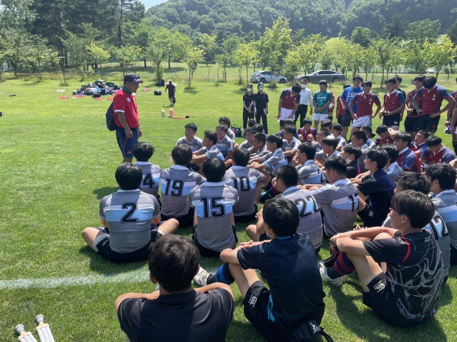 アップが終わった後、常翔学園の監督である野上先生からお話しがありました。自分勝手なプレーと自由にプレーすることは違うというラグビーに対する大切な話をしていただきました。教えてもらったことを実践し、その中で想像力を膨らませて形に埋まらないように自由にプレーができるような選手を目指せるようにしましょう。