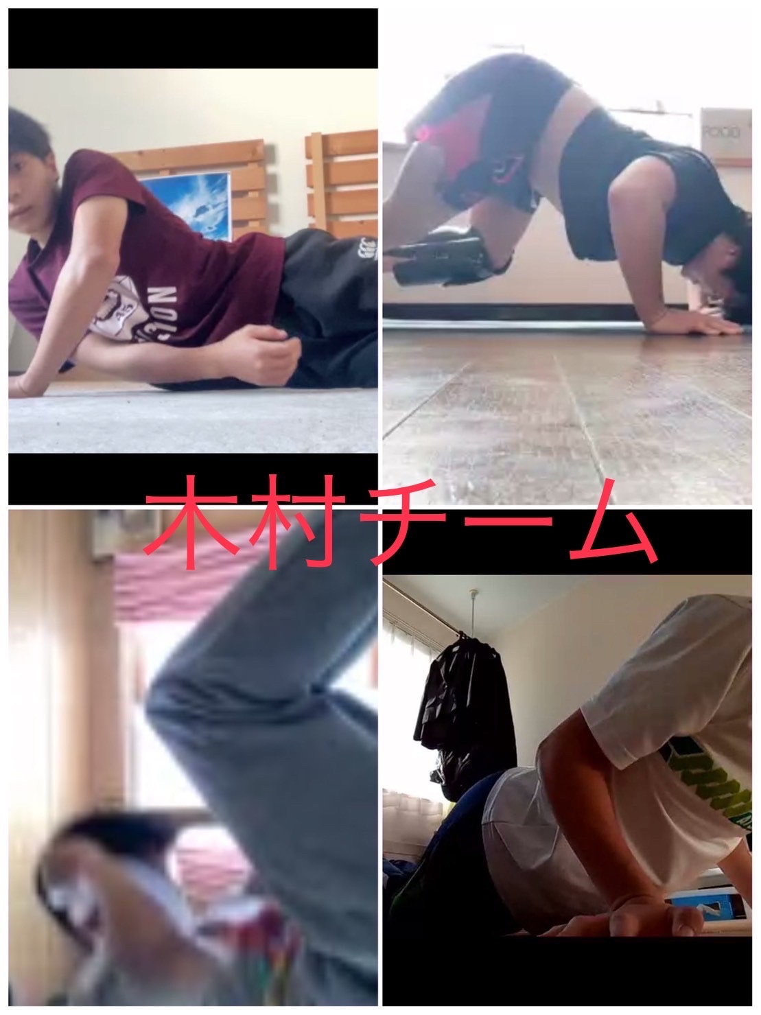 2日間に渡り、腹筋・腕立て・スクワット×100回行いました。声を掛け合いながら行えており、オンライントレーニングですが和気藹々楽しみながら取り組んでいました。またフォームが乱れないように気をつけながら取り組んでいる姿が多く見受けられたので継続していきましょう。