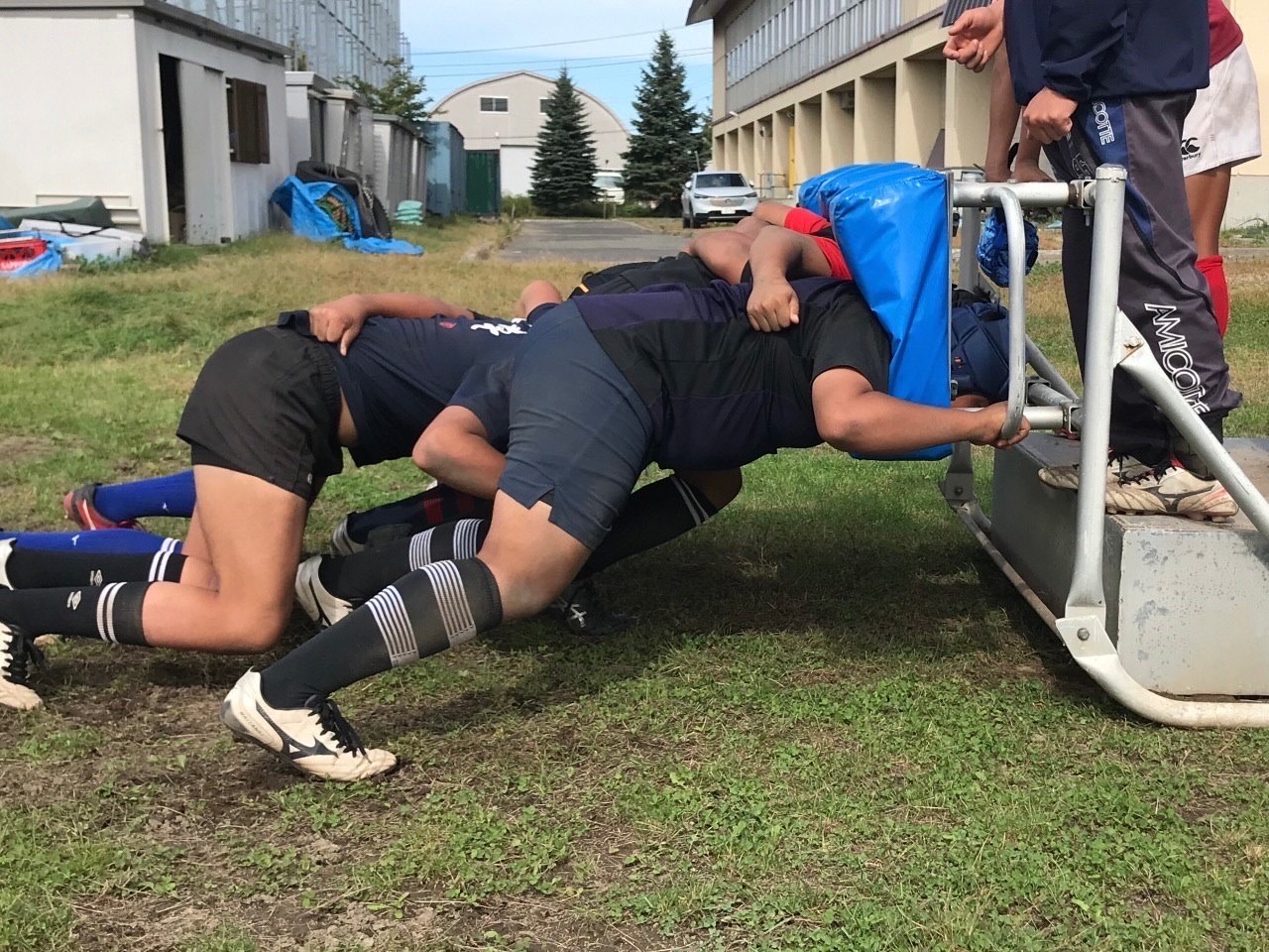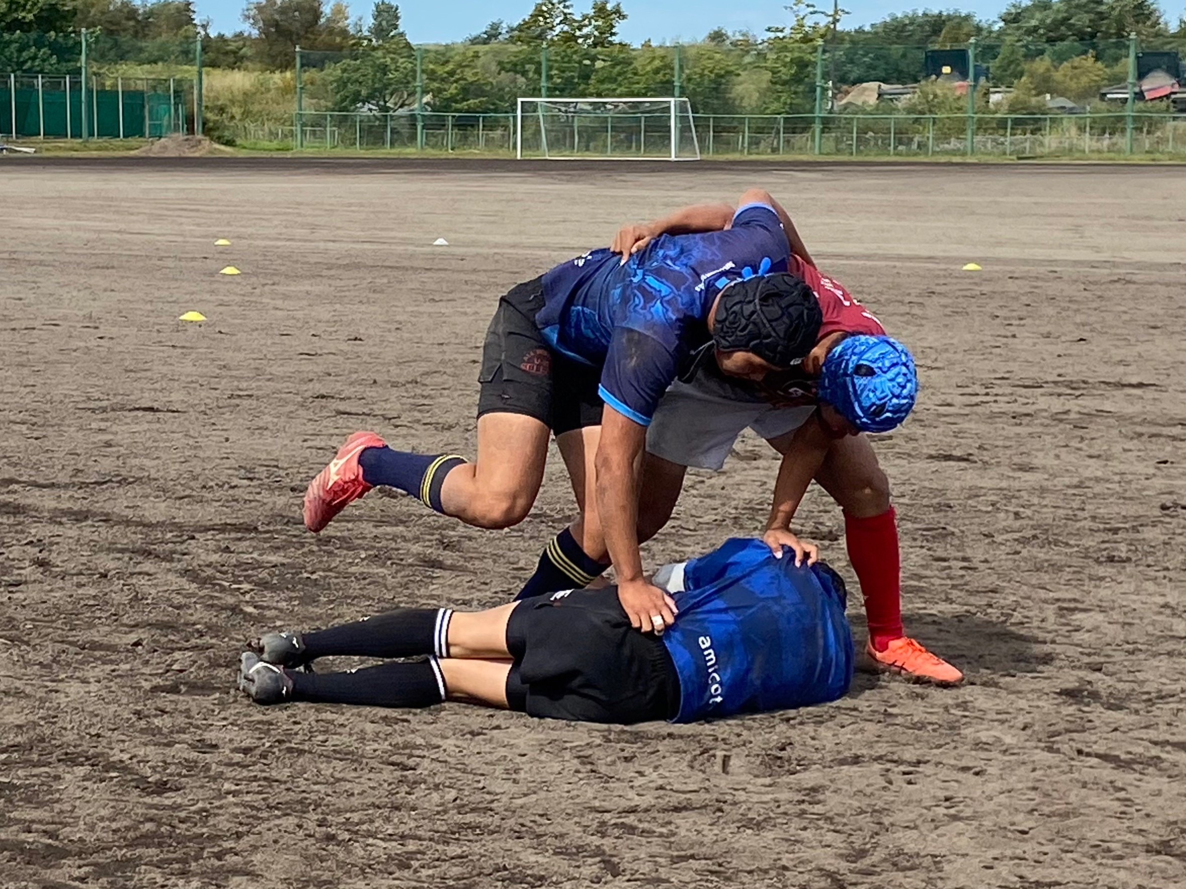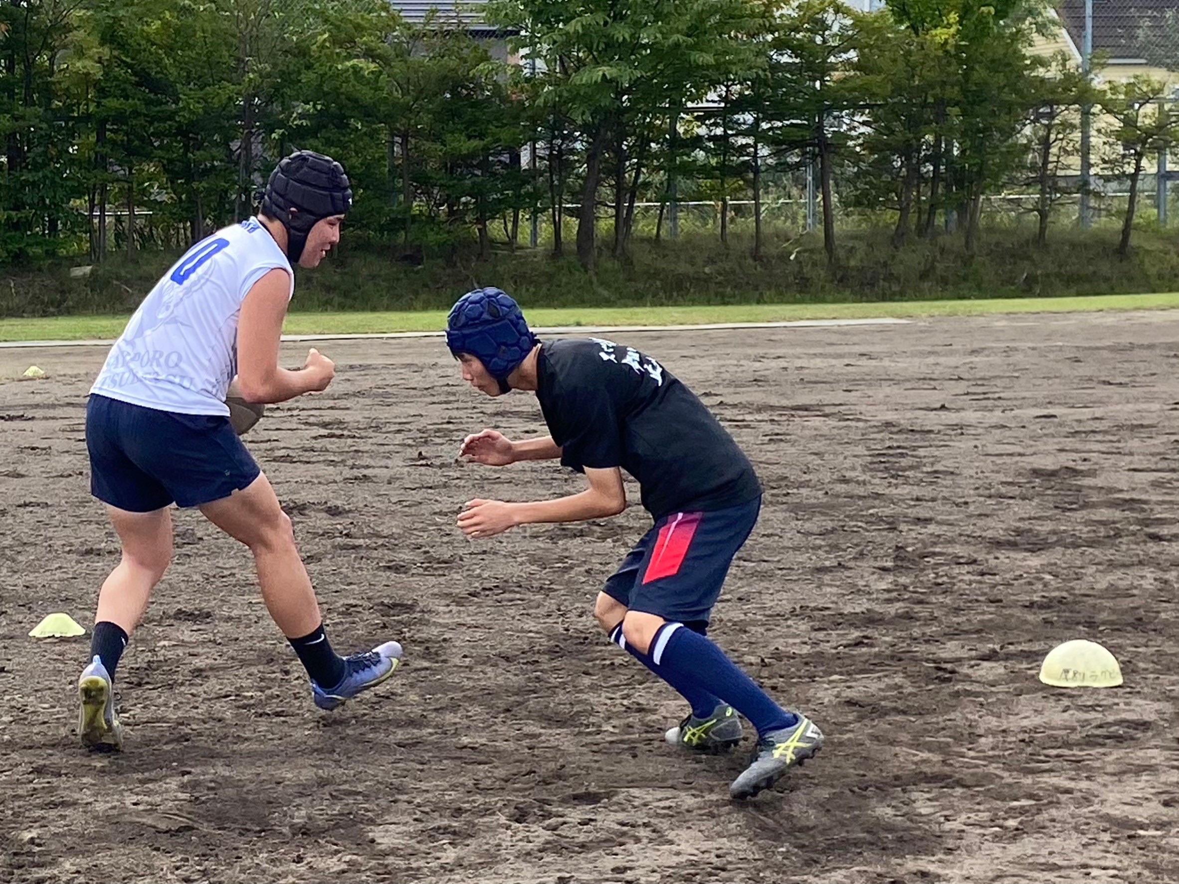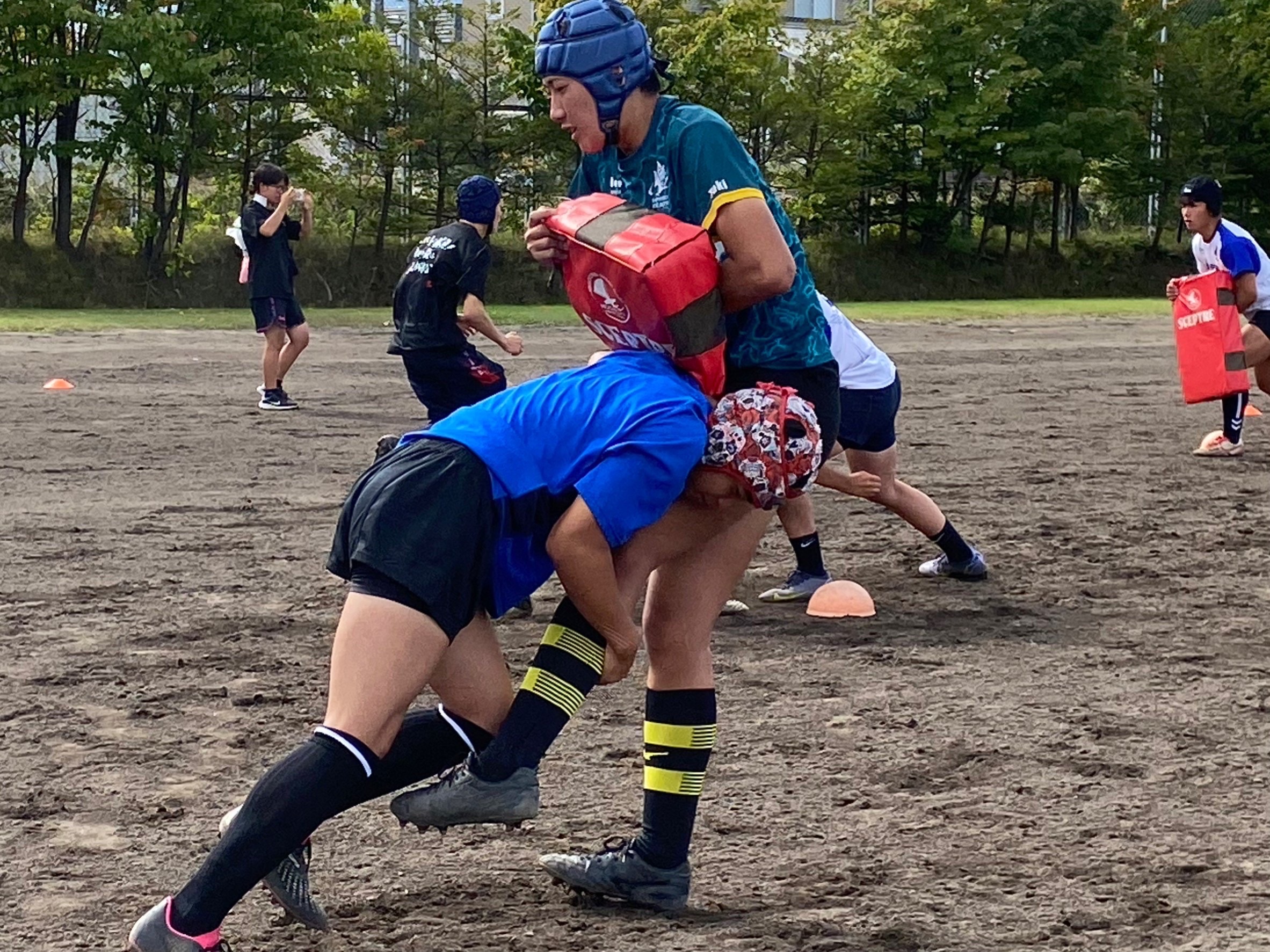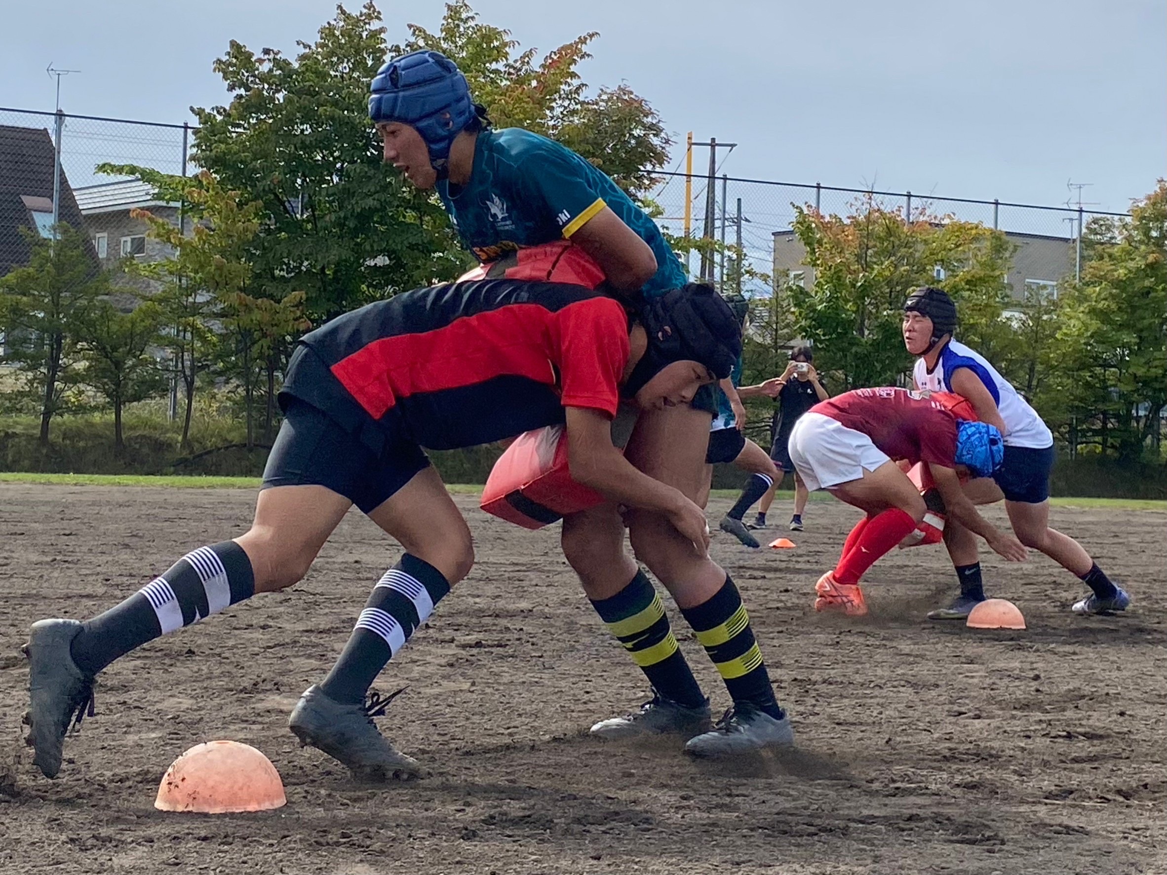 次にパドリングタックル、3列アップを行いました。日頃からロータックルを意識するよう指摘されていたので、素早く低姿勢に入ることが出来ていました。相手が構えてない時間にどれだけ前進し仕留められるかが鍵となりました。