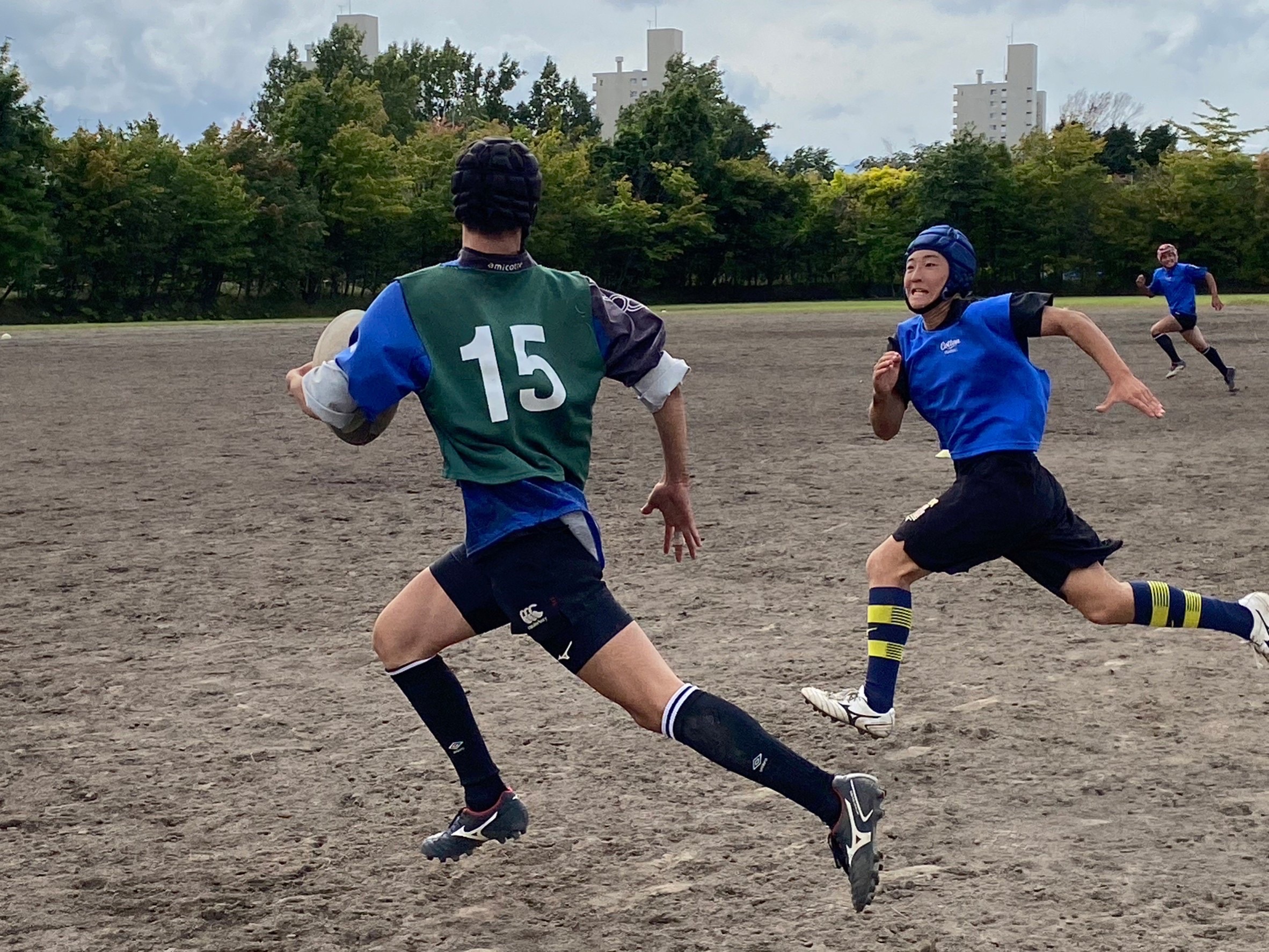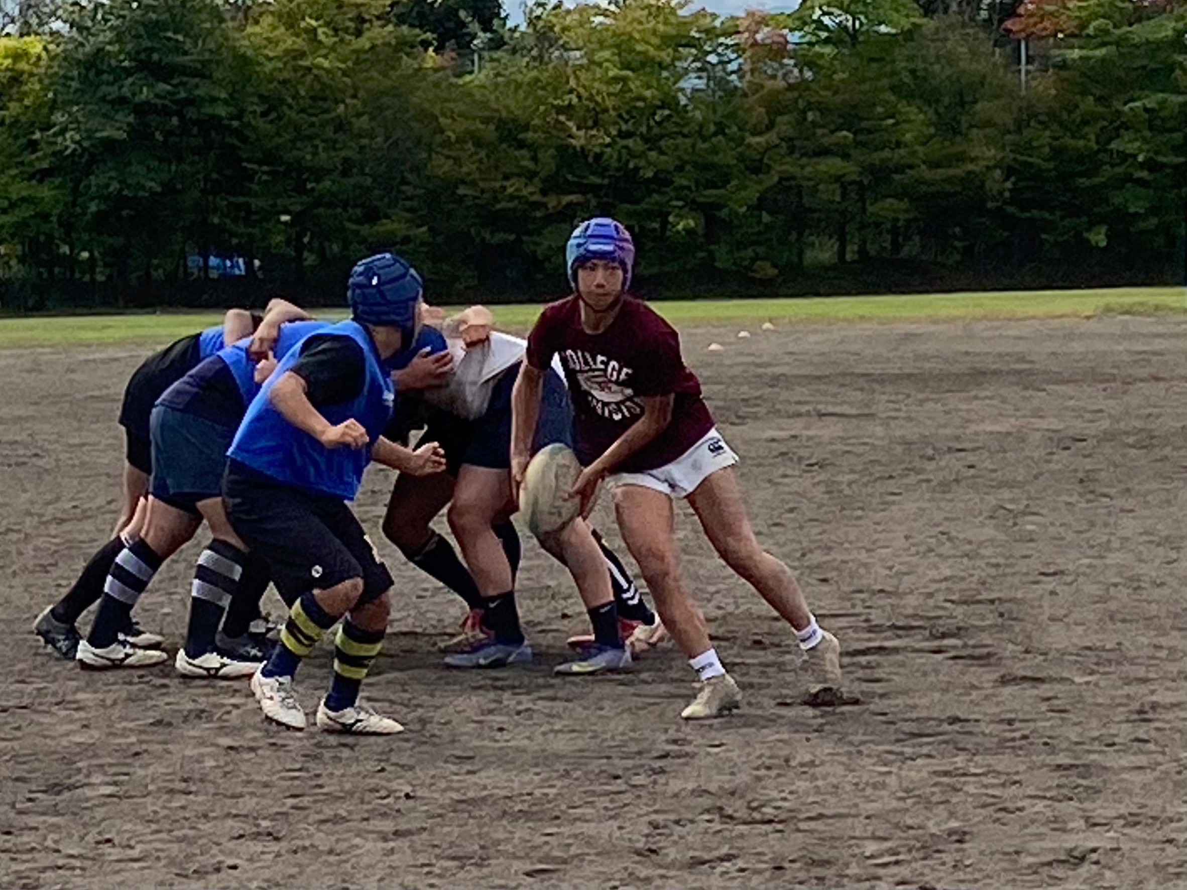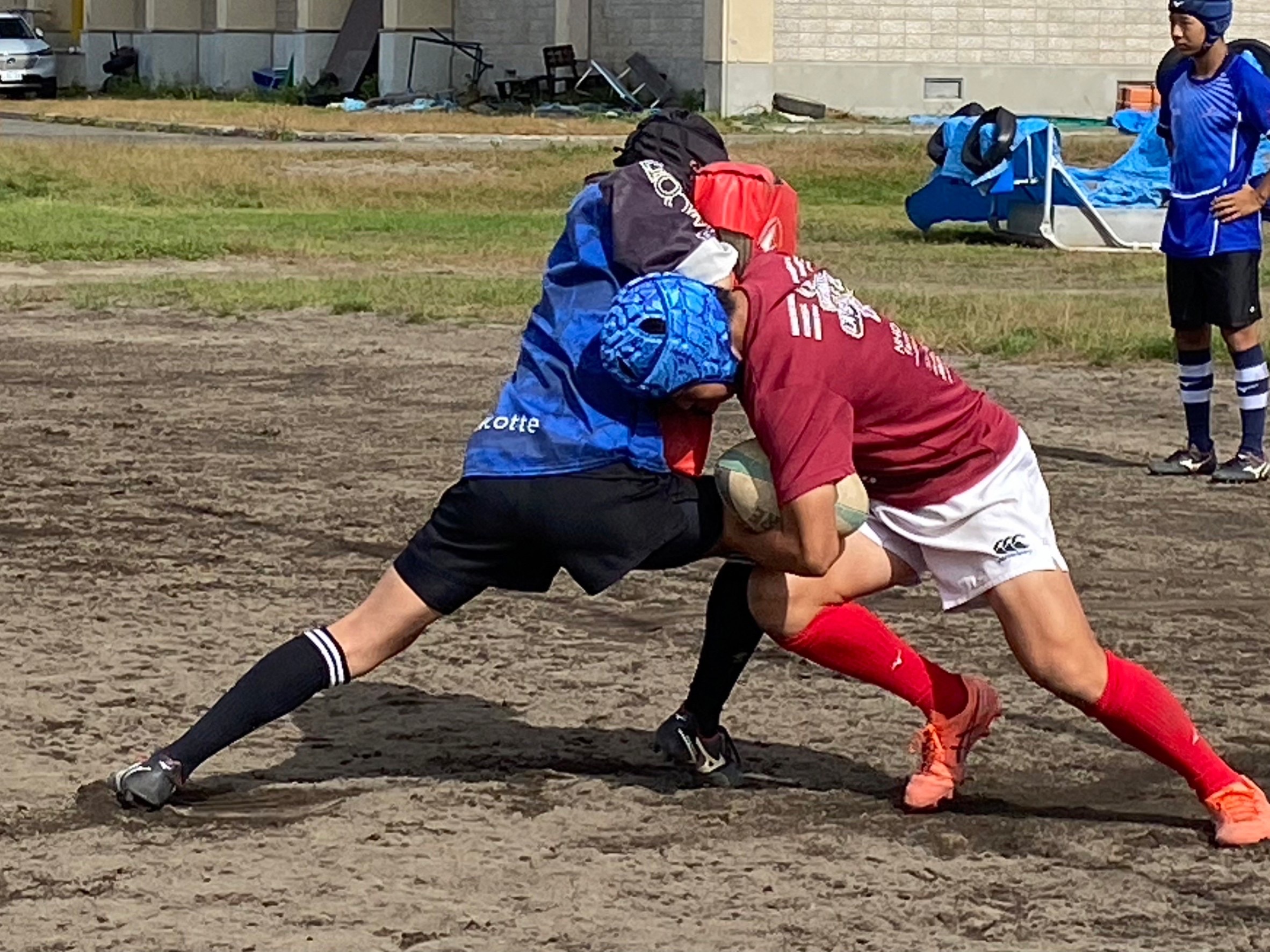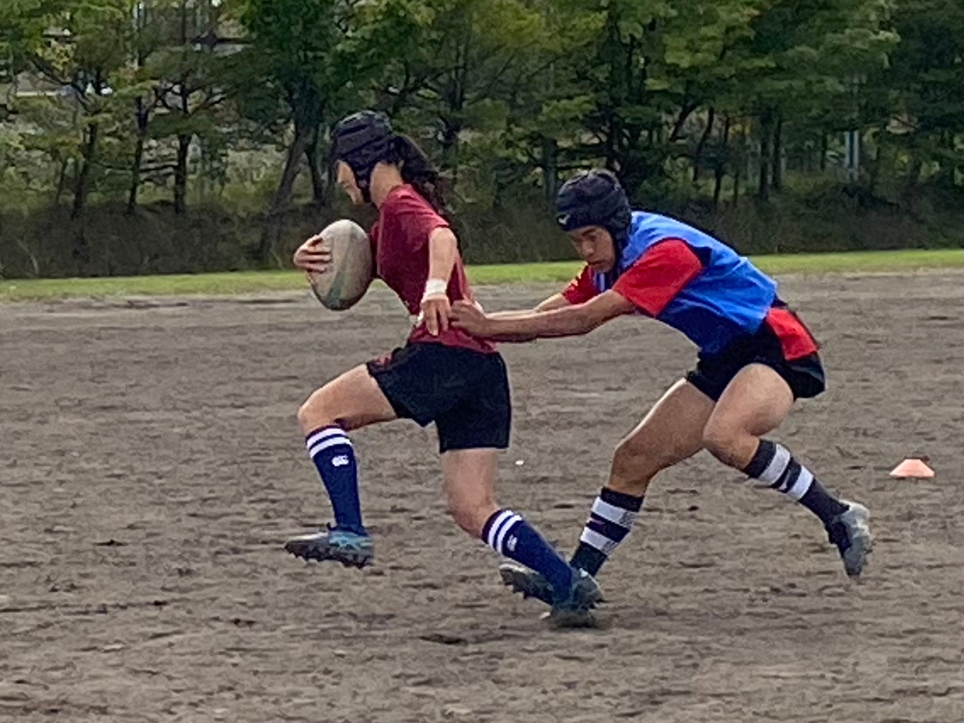 次にパドリングタックル、3列アップを行いました。日頃からロータックルを意識するよう指摘されていたので、素早く低姿勢に入ることが出来ていました。相手が構えてない時間にどれだけ前進し仕留められるかが鍵となりました。