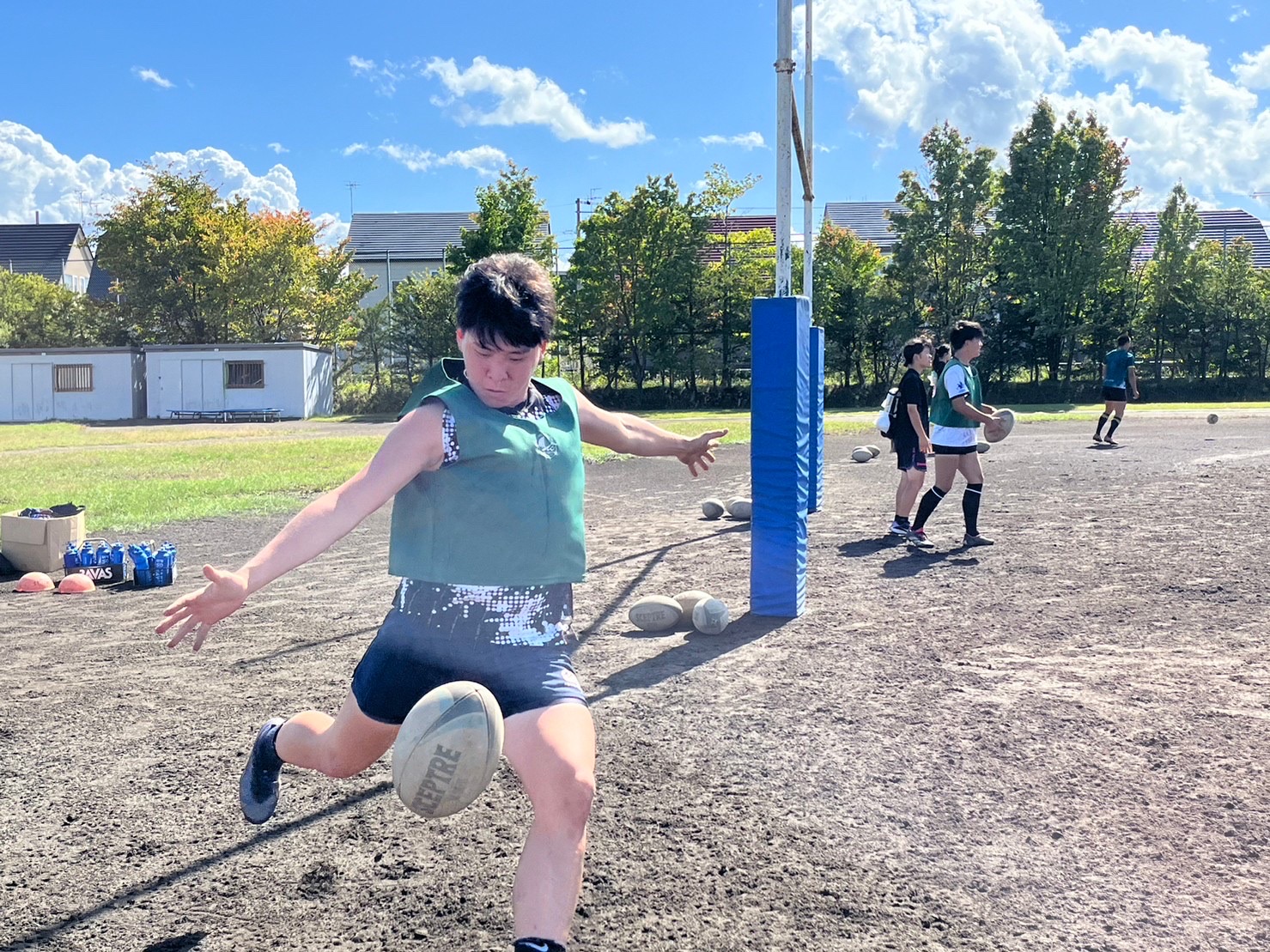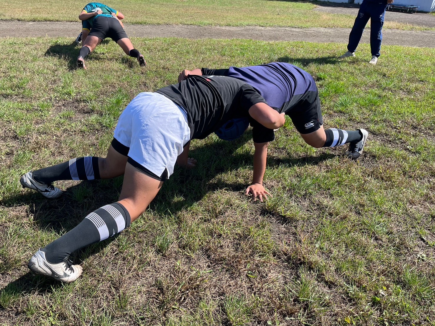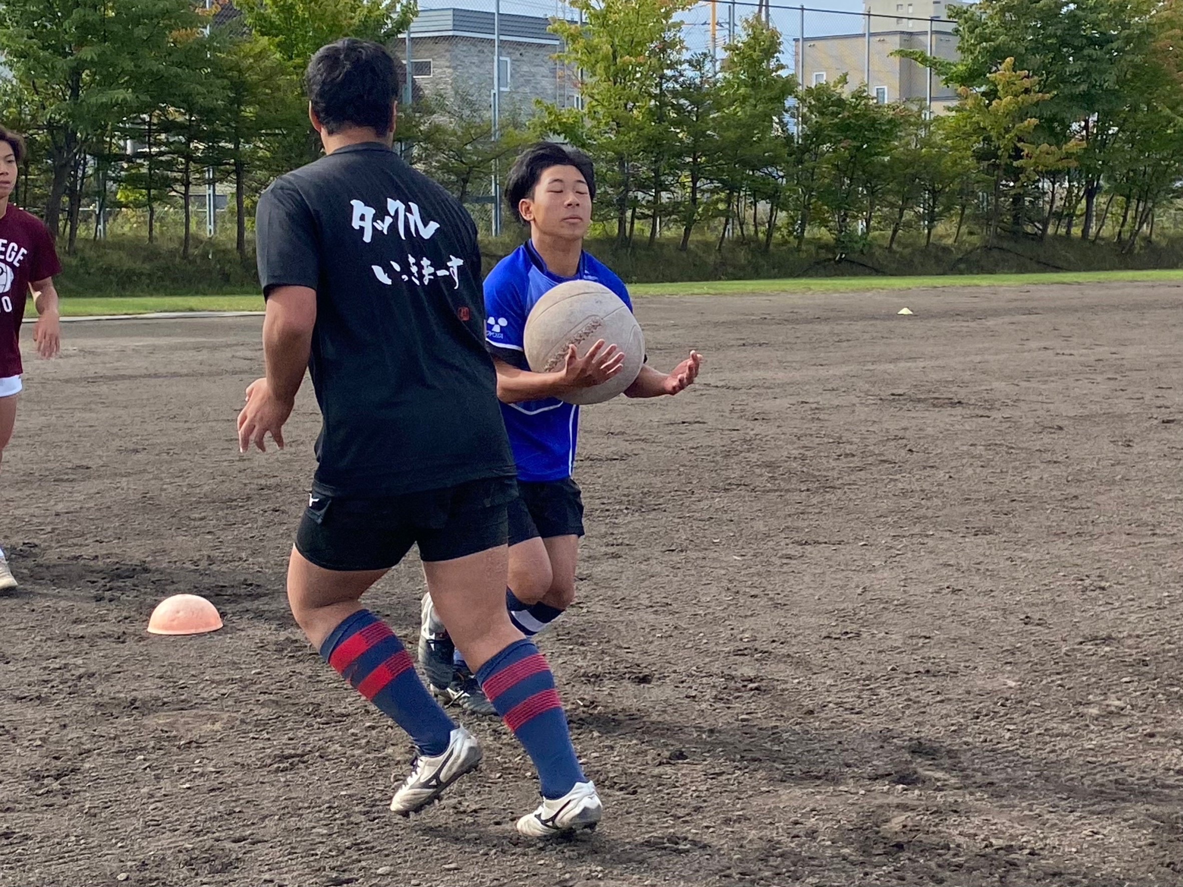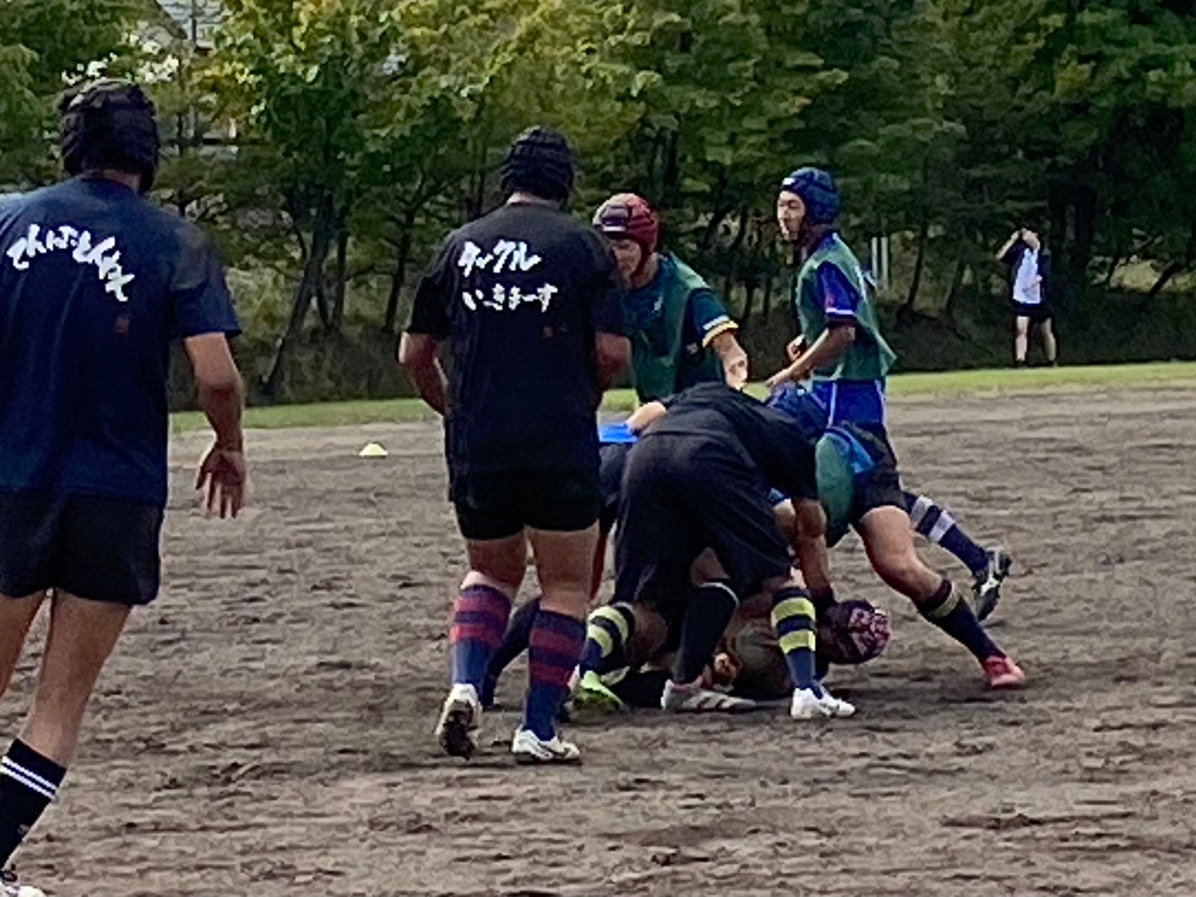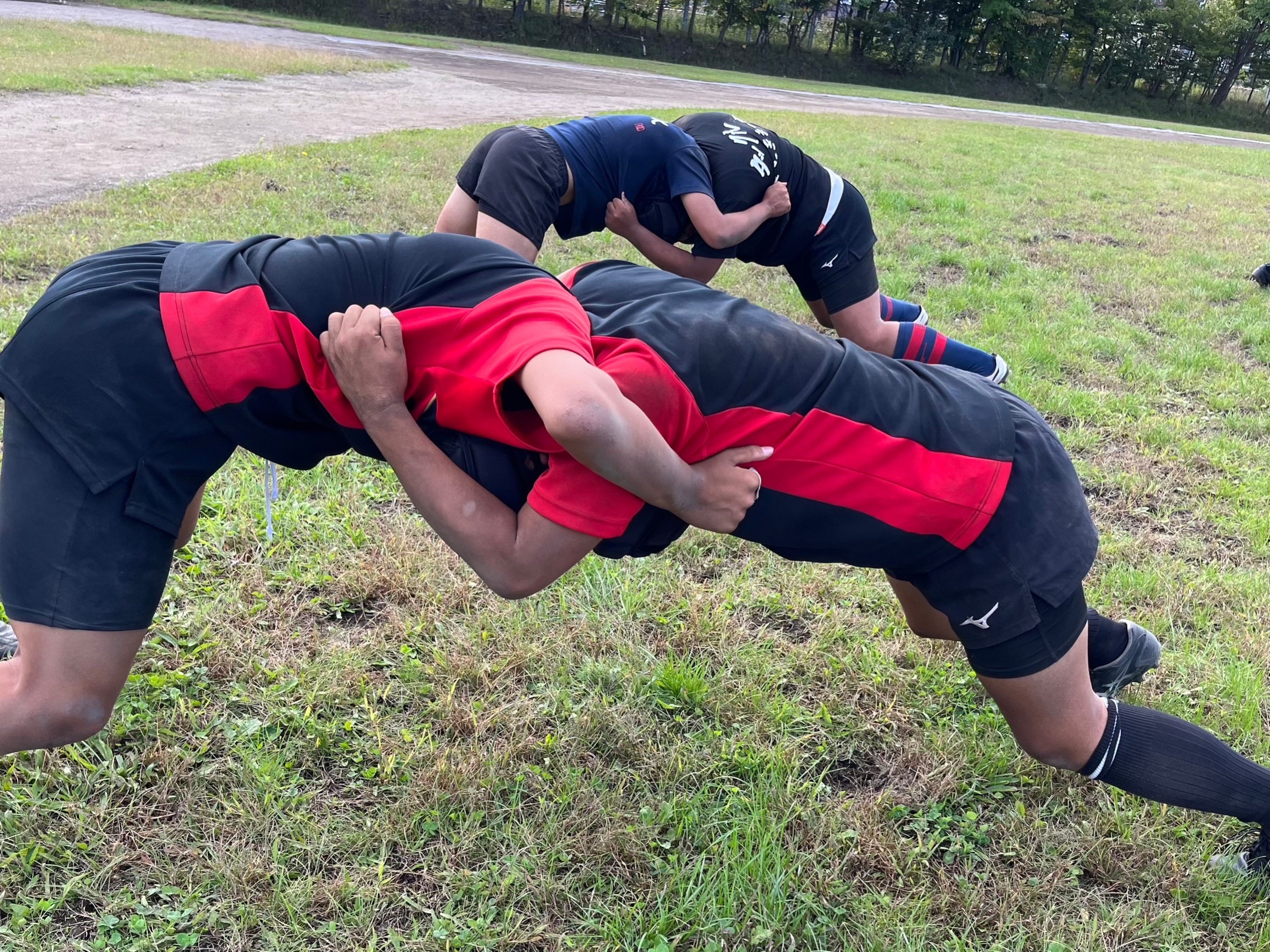 次にパドリングタックル、3列アップを行いました。ロータックルを意識しすぎて強度が下がってしまっていることがあるので、膝を落として強いタックルができるようにしましょう。タックルの入る位置は自分の首で入るイメージを教えて頂きました。そのイメージを忘れず強度の高いタックルを試合でもできるよう意識していきましょう。