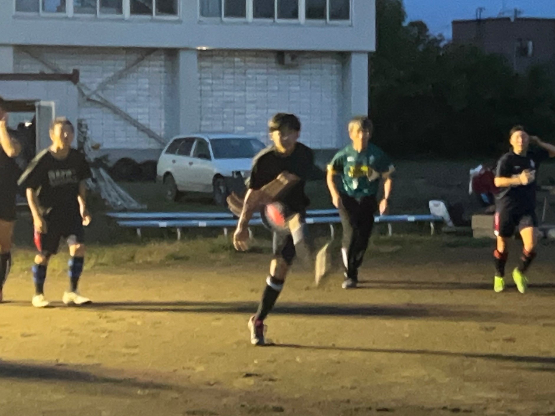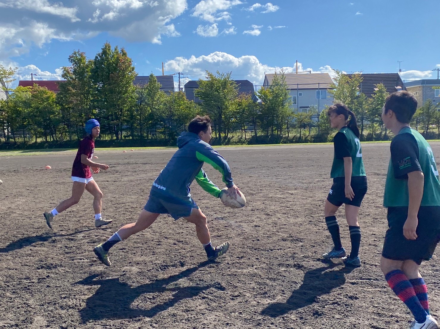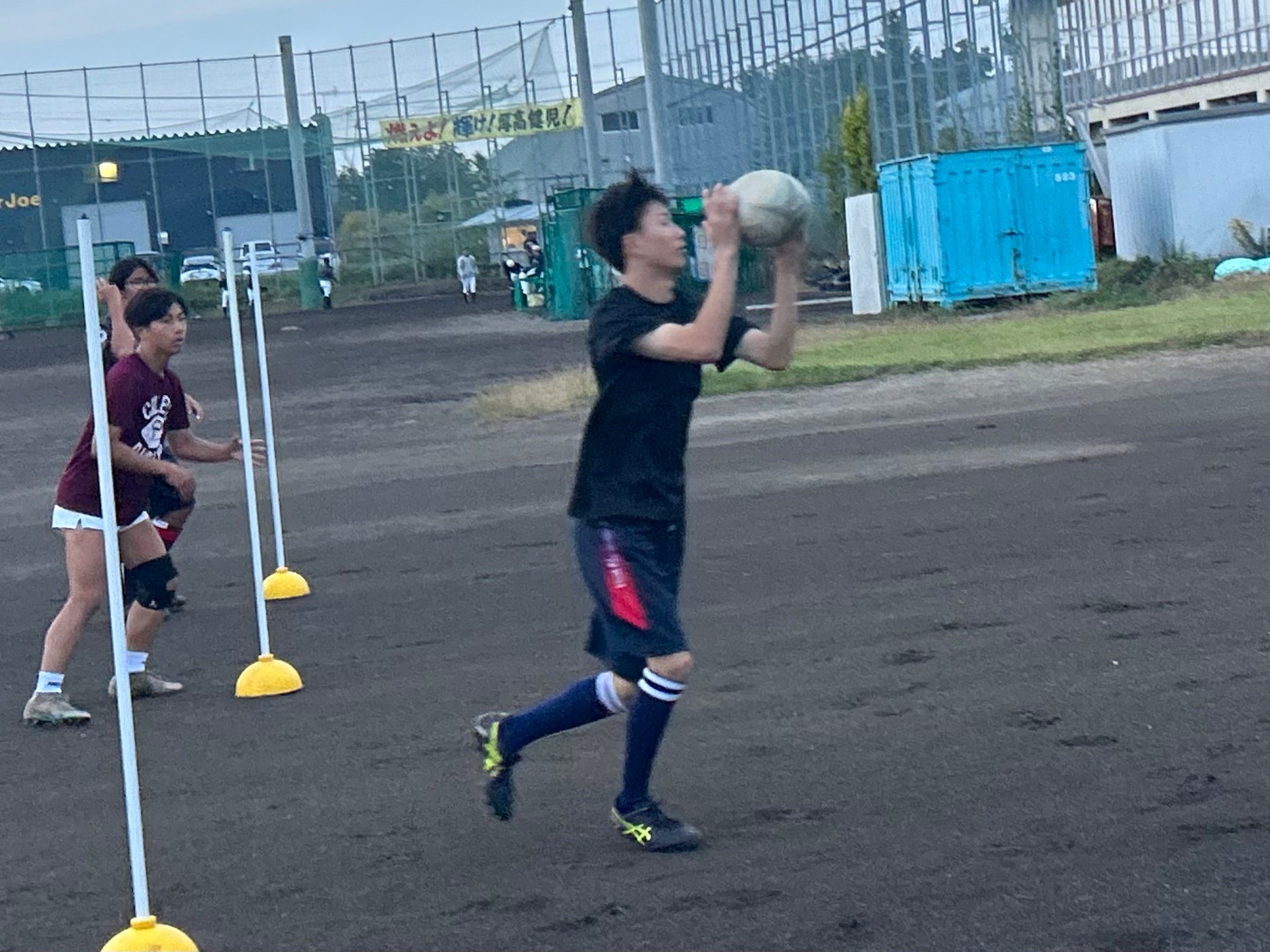 コンタクト要素を抜き、4人1組でオーバーの練習を行いました。様々なシチュエーションに備え、試合のルールに沿って取り組みましょう。活動終了後も部活に通ってくださっている前主将から、前進した後にオーバーで止まる必要はないこと、ペアと動きながら連動し越えることが指摘されました。グラウンドを何往復していることで疲労が溜まっており、雑なプレーが目立ち質が下がってしまっていたのが残念です。