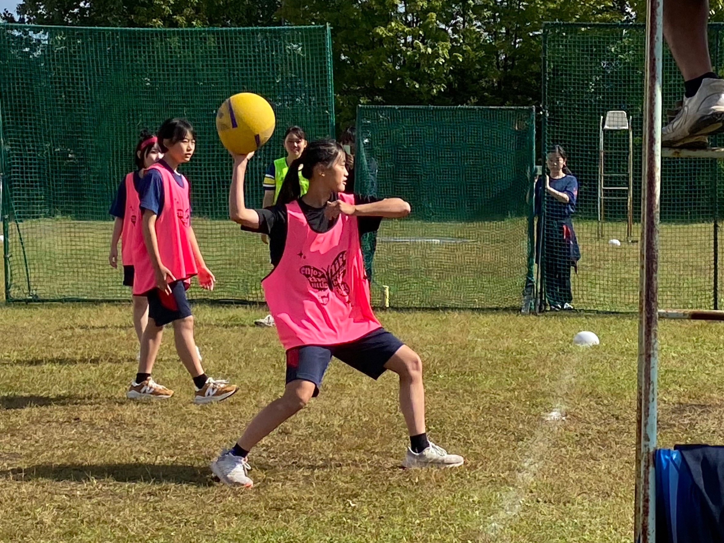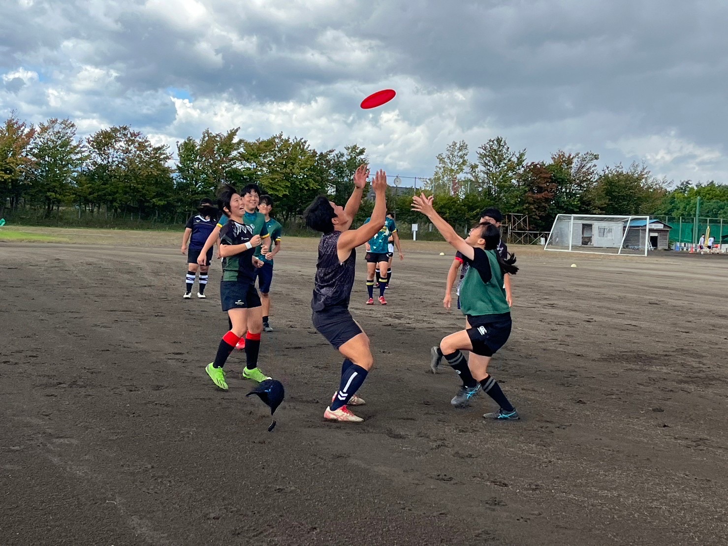 まずアップとしてアルティメットを行いました。風の影響を考えパスの仕方を工夫するなどのコミュニケーションを取れていました。突然の豪雨で中断し、ルーティンに移りました。