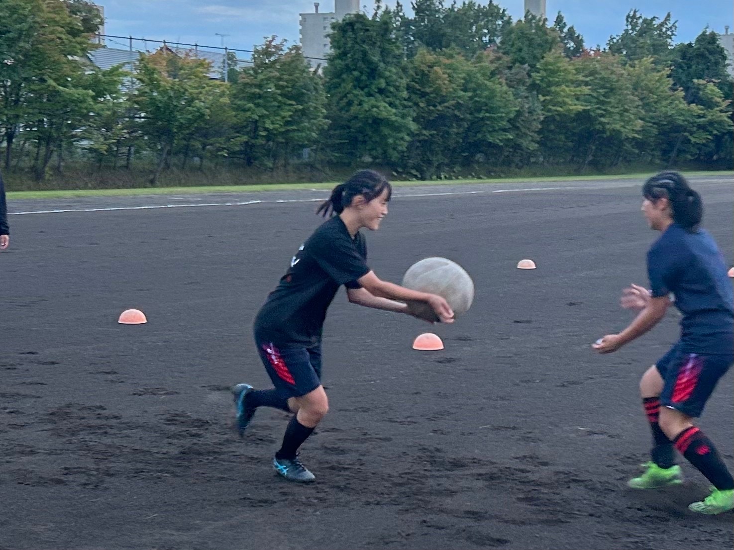 その後2対1を発展させ3対2を行いました。パスのスピードや位置関係などの細かい部分と話し合えているグループも見られました。次の動きを想像した形を考えながらプレーしていきましょう。