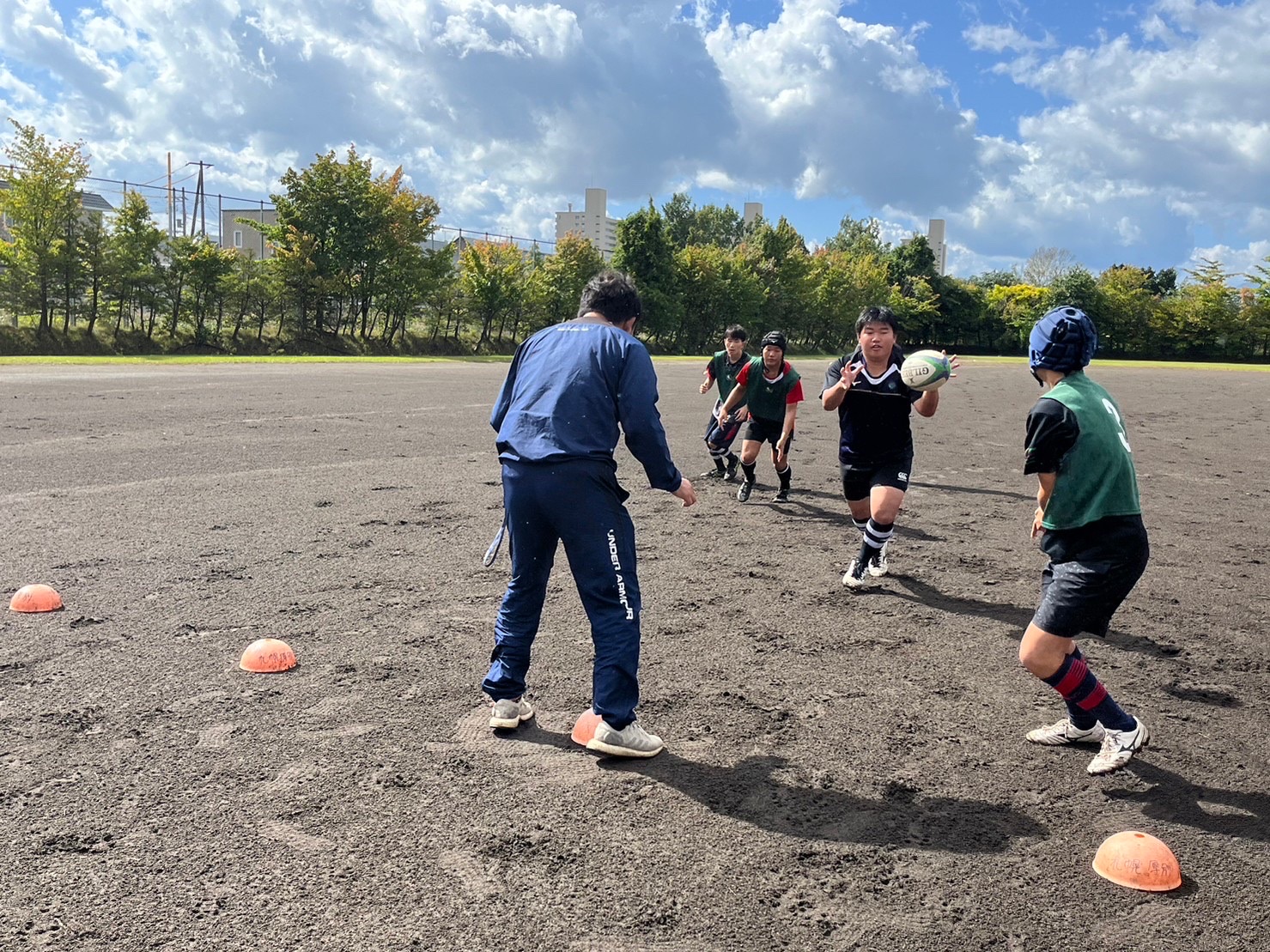 その後改めて新チームのミーティングを行い、小笠原組が始まりました。グラウンド練習では、最初にメディシンボールを使ったハンドリング練習と4列パス、ワイファイを行いました。相手の胸目掛けて放ることを全員が意識して取り組み、だんだんと改善されていきました。