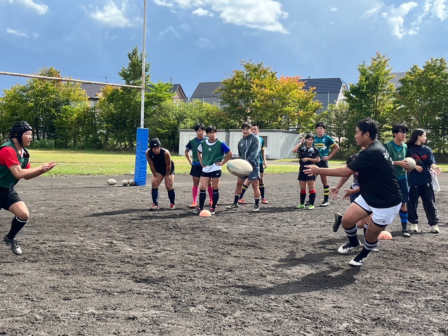 その後FWとBKに分かれてユニットを行いました。FWは1対1、スクラム、ラインアウト、リモールの姿勢を確認しました。BKは2対1、3対2、その後ポジションごとにキック練習とアタック練習、全体でアタック練習を行いました。