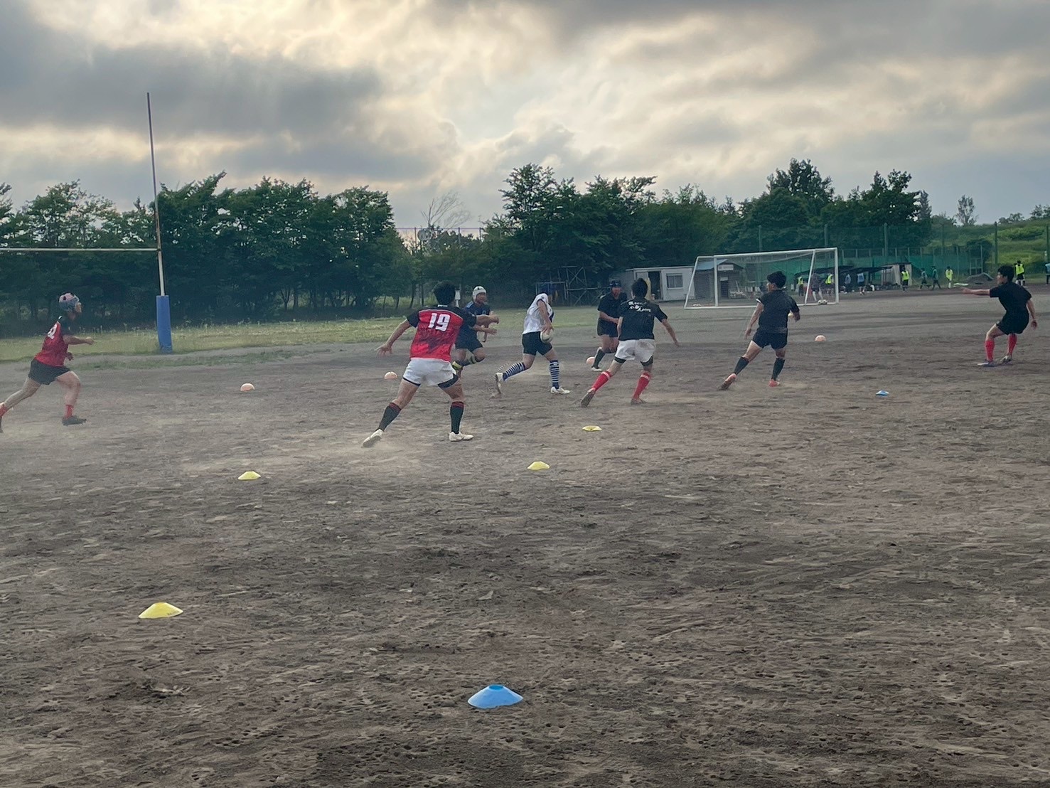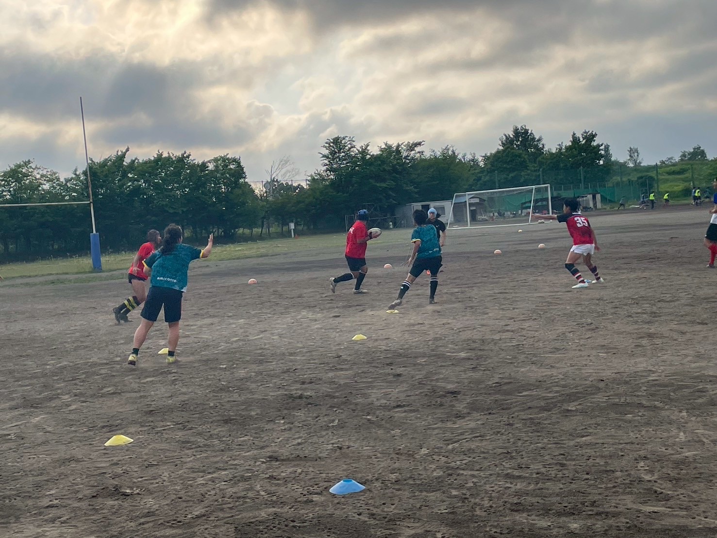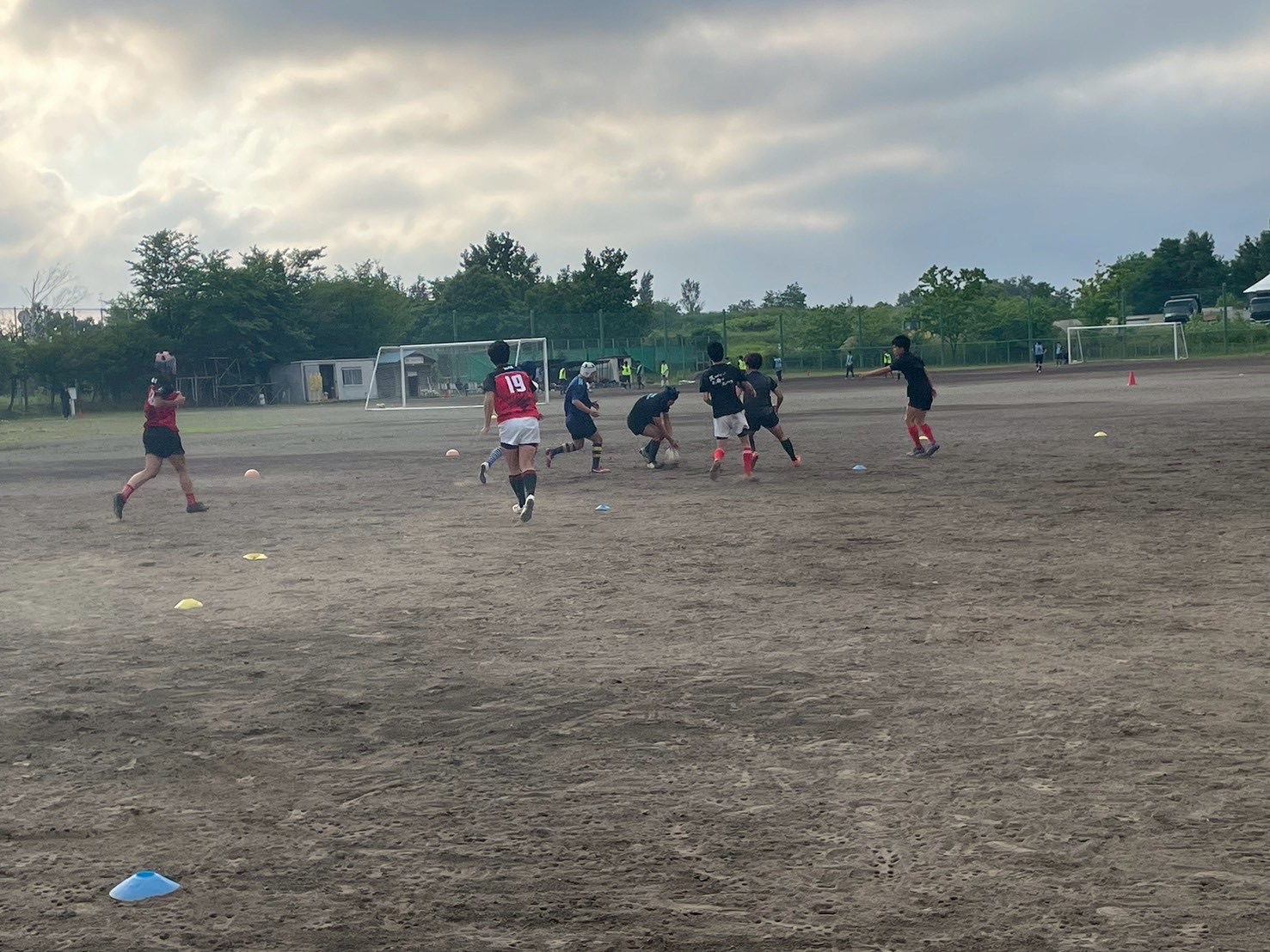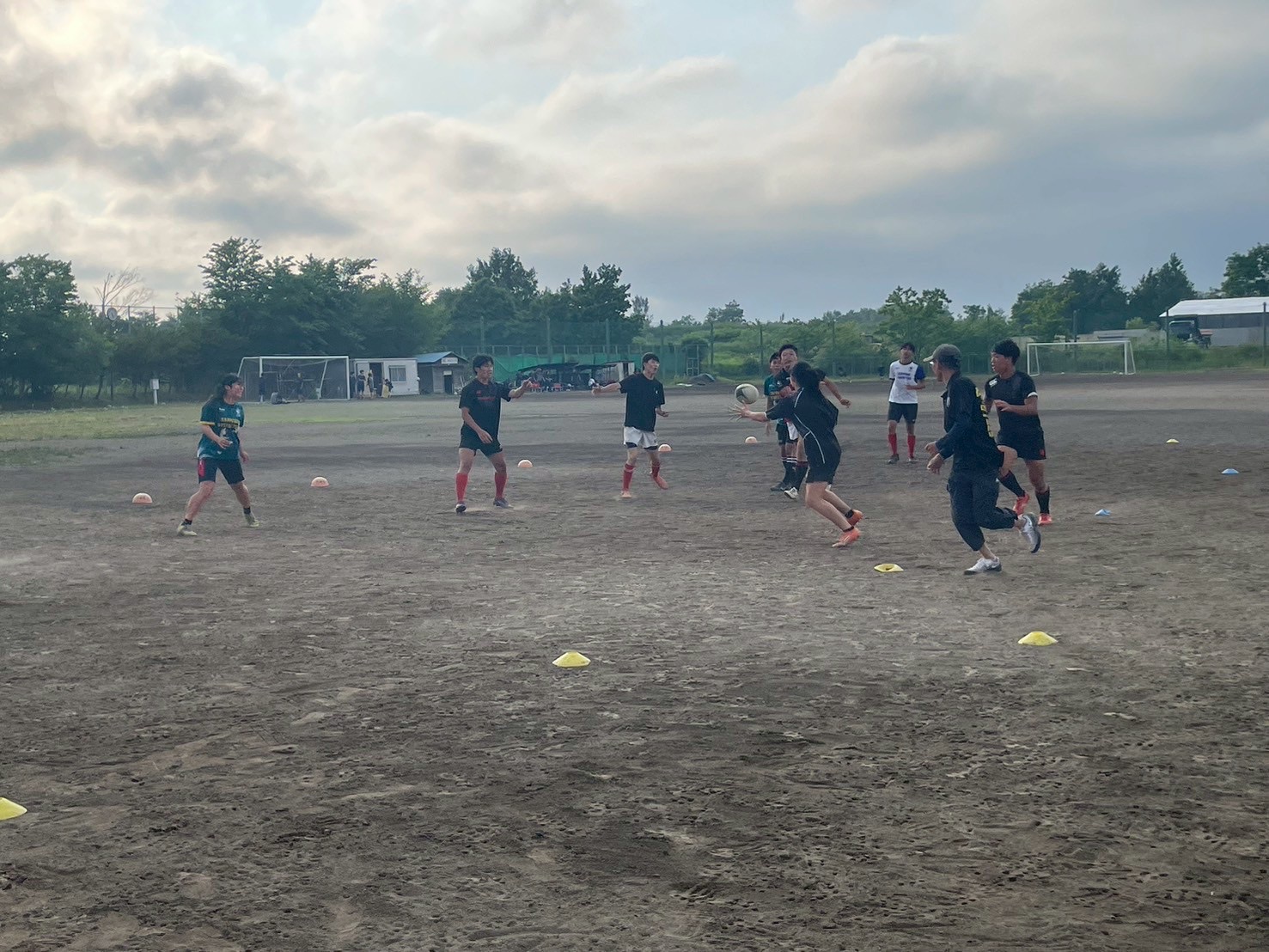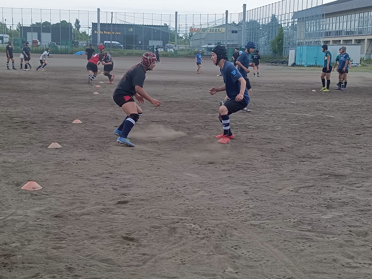 次にキックからのアタックディフェンスの練習を行いました。コミニュケーションが少なくノックオンが多く見られました。アタックはワンパスした後の細かいコミニュケーションを行うようにしましょう。また、ディフェンスは自分のゾーンに入った人に向かって横の繋がりを確認できるよう頑張りましょう。