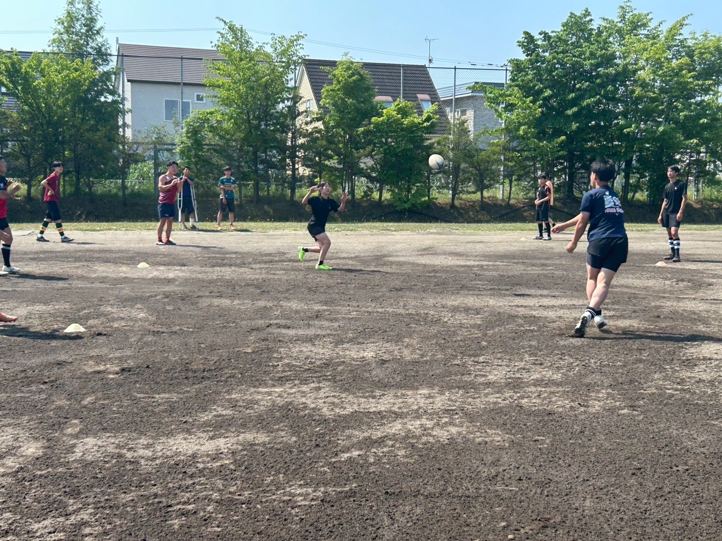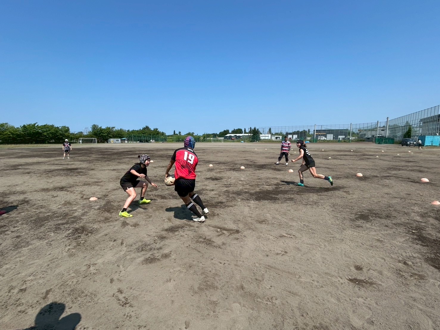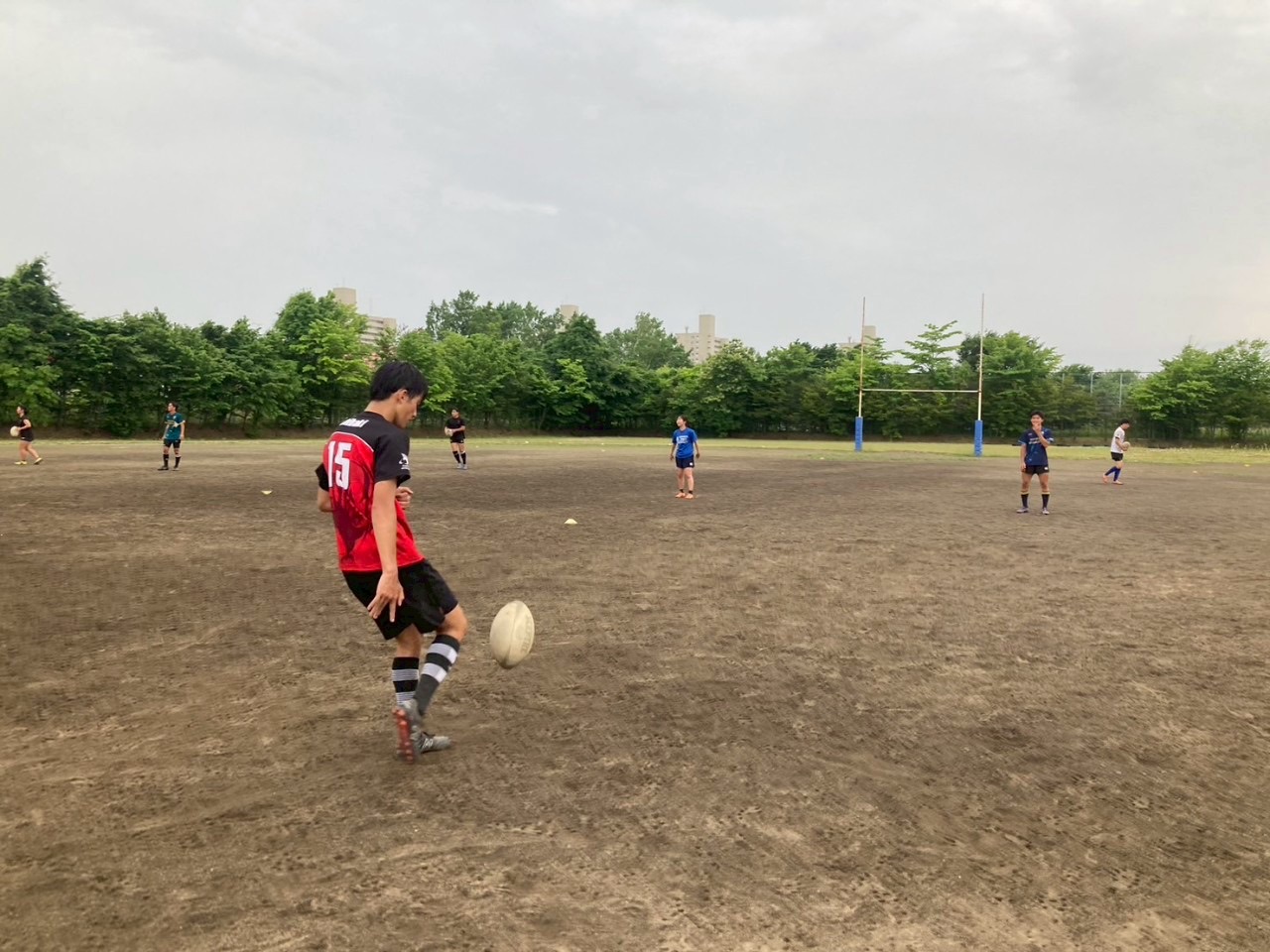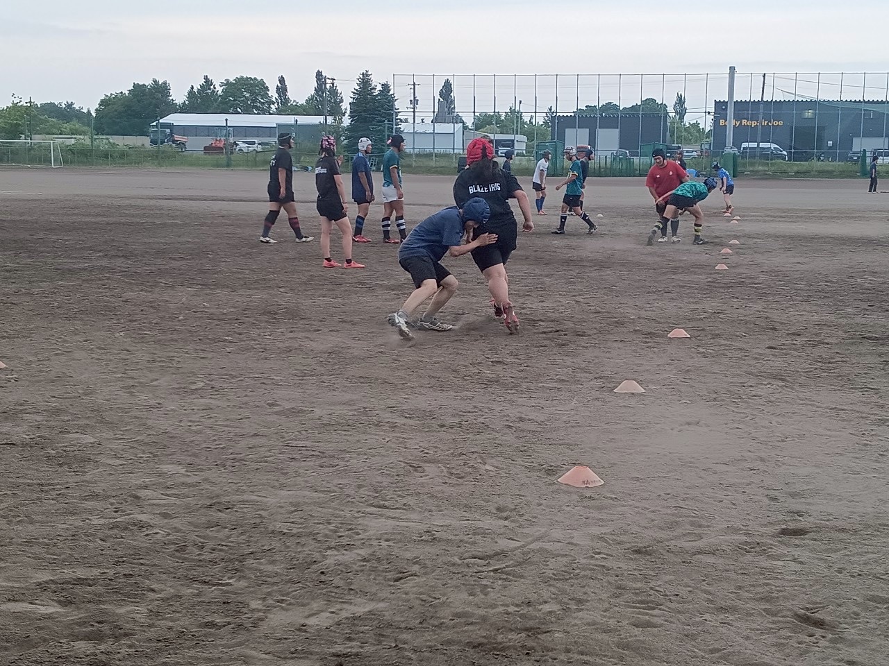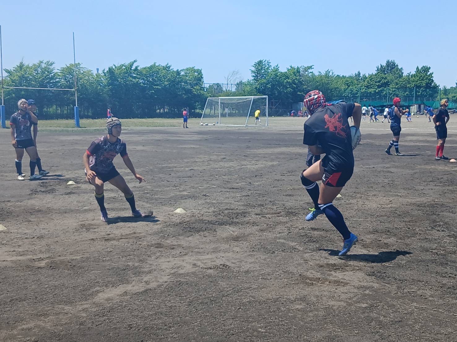 次にキックからのアタックディフェンスの練習を行いました。コミニュケーションが少なくノックオンが多く見られました。アタックはワンパスした後の細かいコミニュケーションを行うようにしましょう。また、ディフェンスは自分のゾーンに入った人に向かって横の繋がりを確認できるよう頑張りましょう。