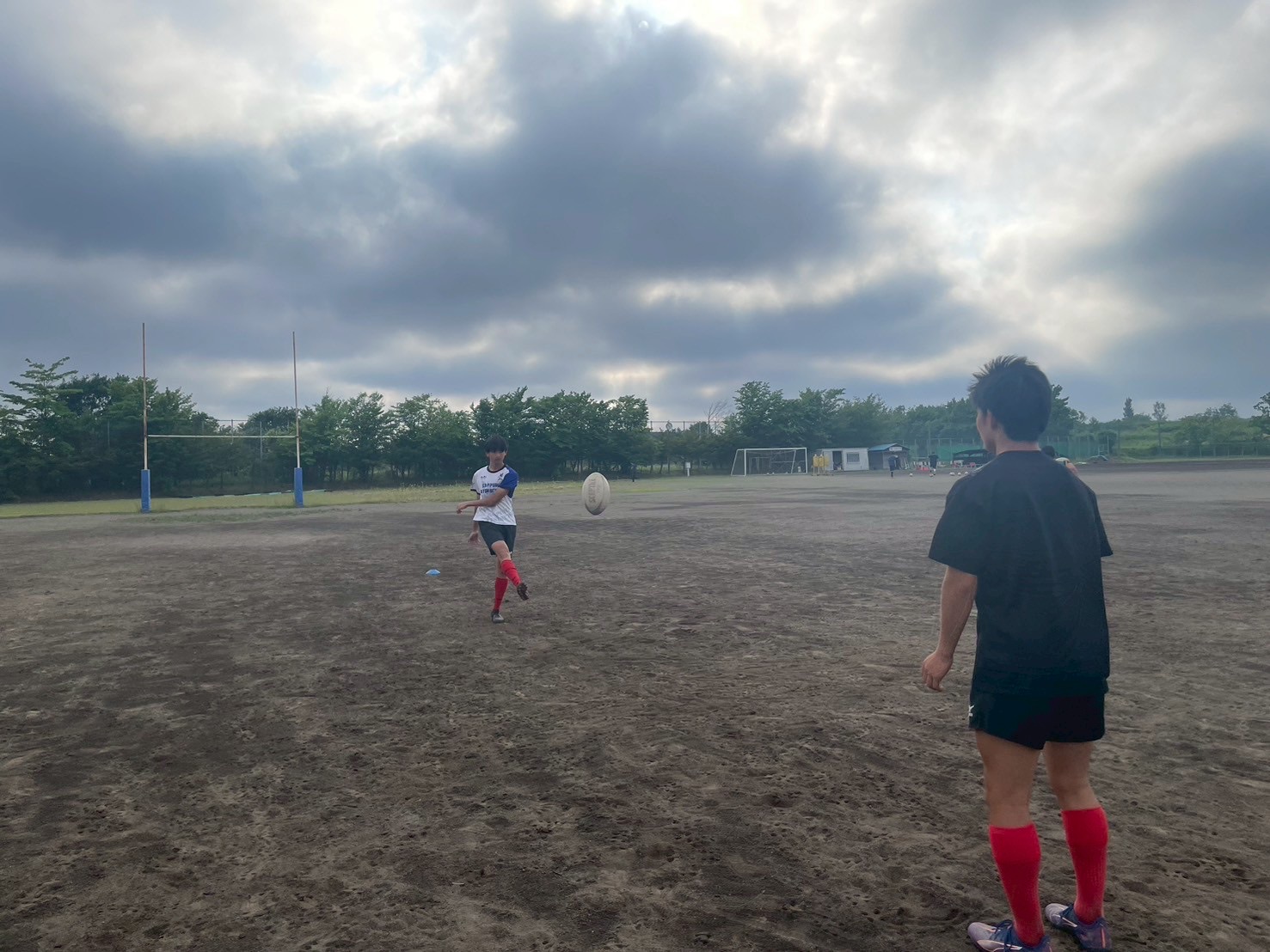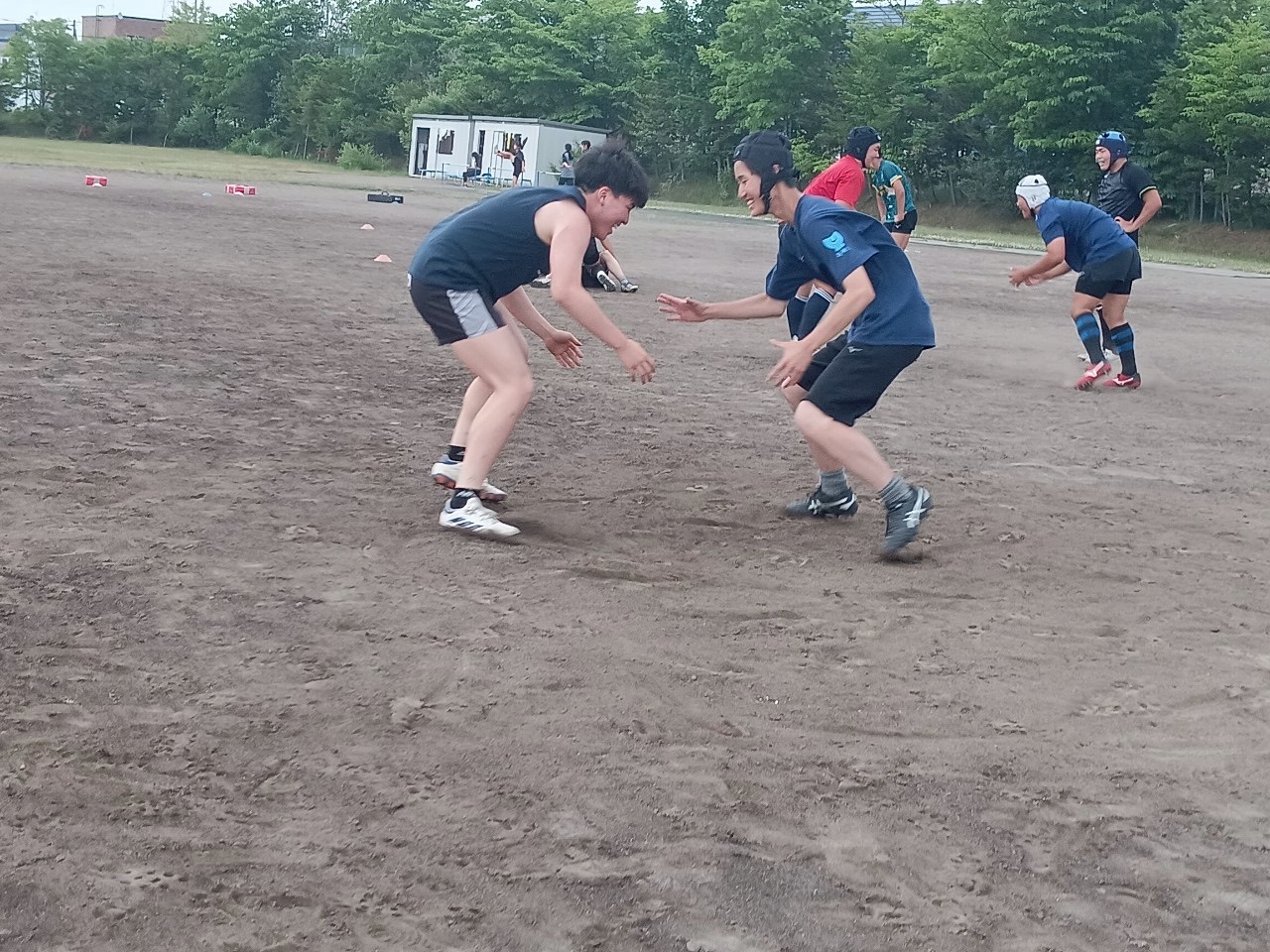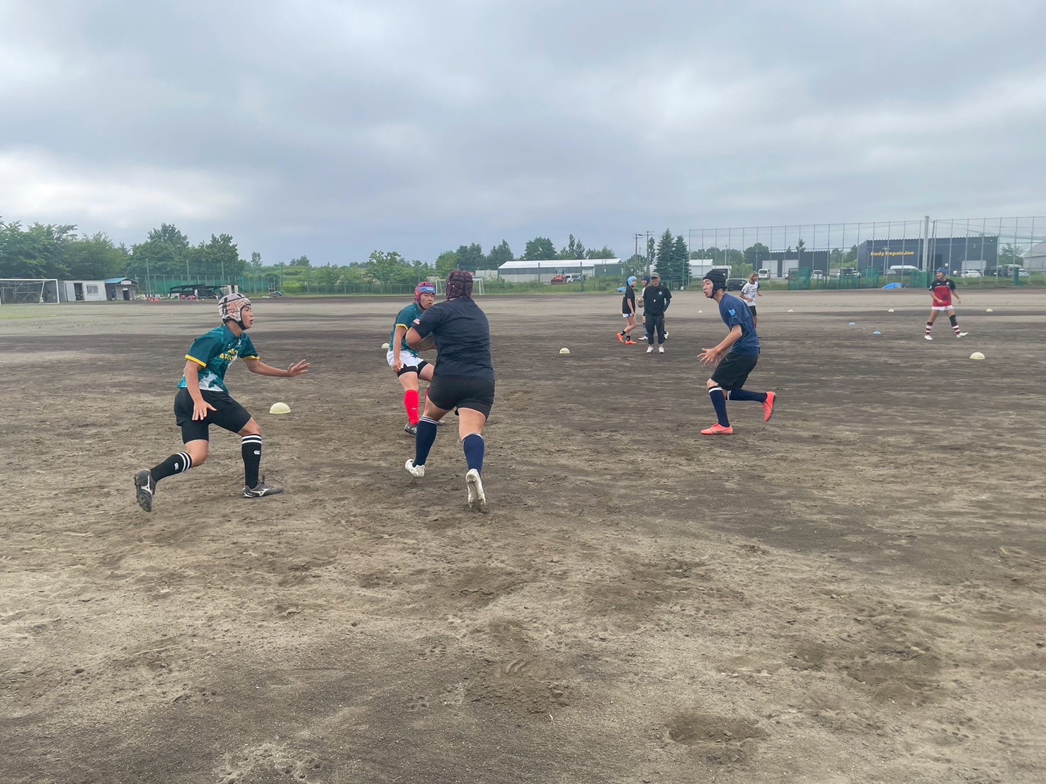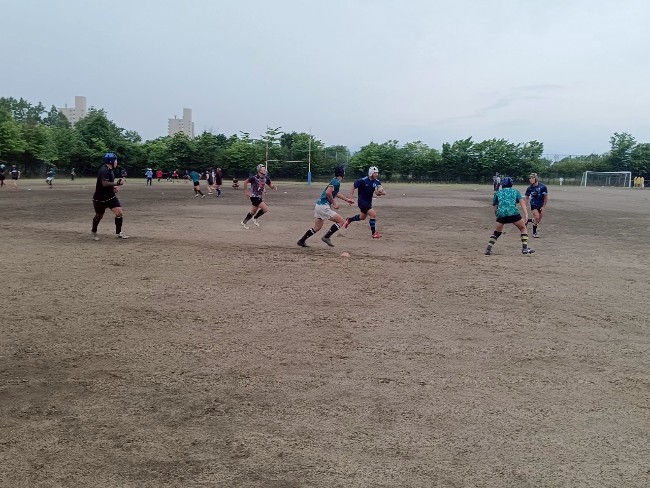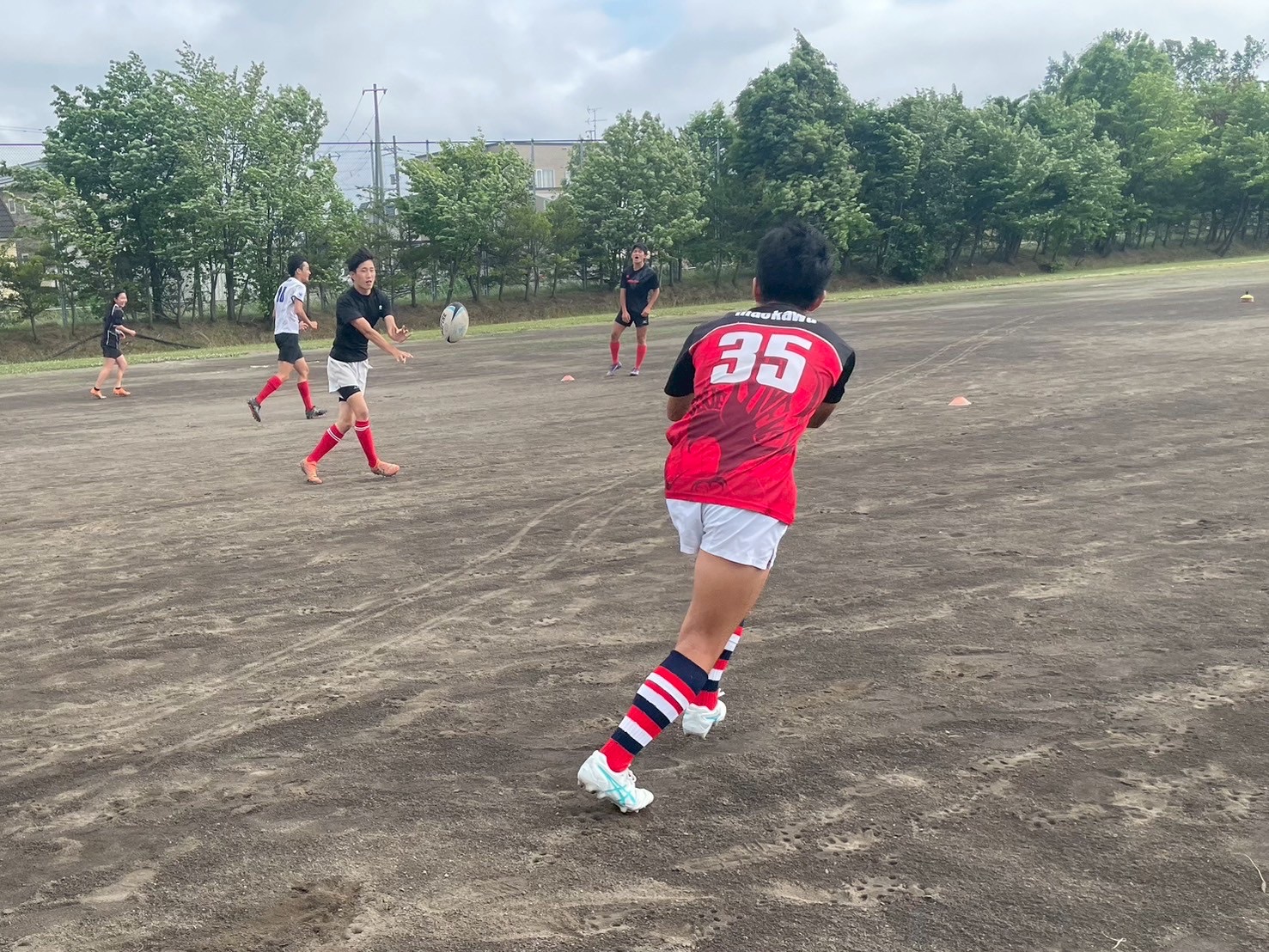 次にキックからのアタックディフェンスの練習を行いました。コミニュケーションが少なくノックオンが多く見られました。アタックはワンパスした後の細かいコミニュケーションを行うようにしましょう。また、ディフェンスは自分のゾーンに入った人に向かって横の繋がりを確認できるよう頑張りましょう。