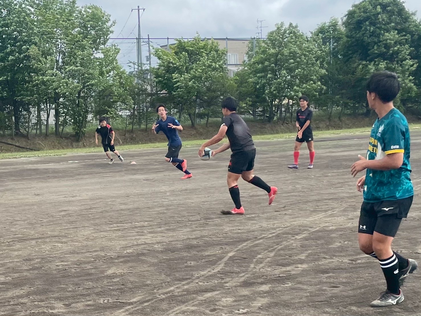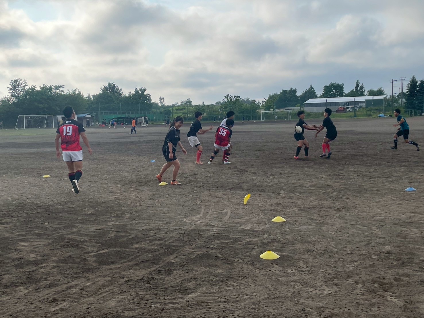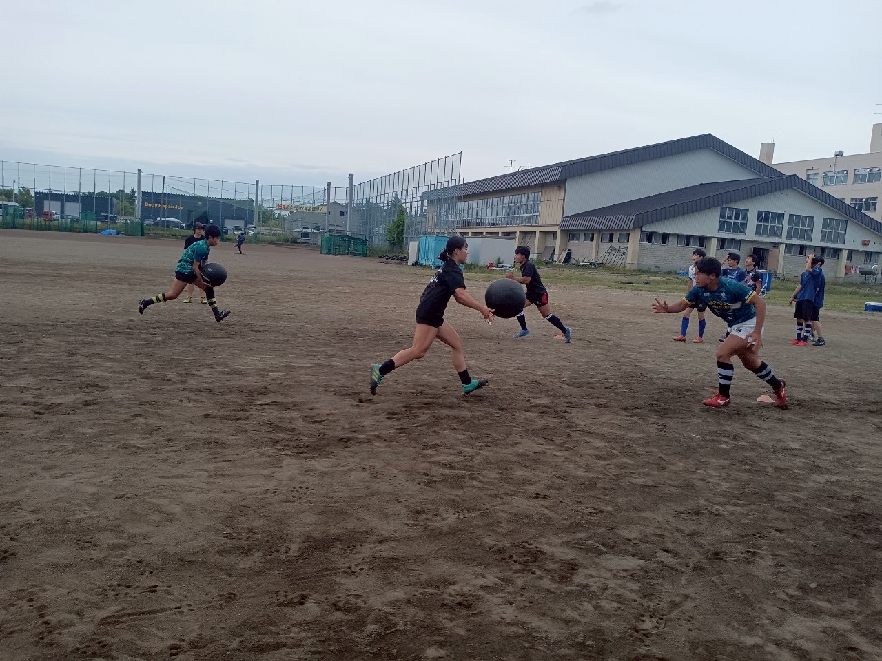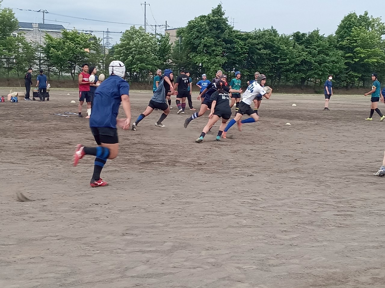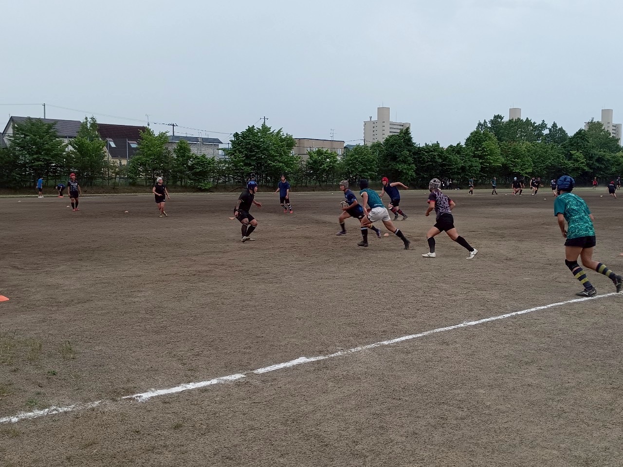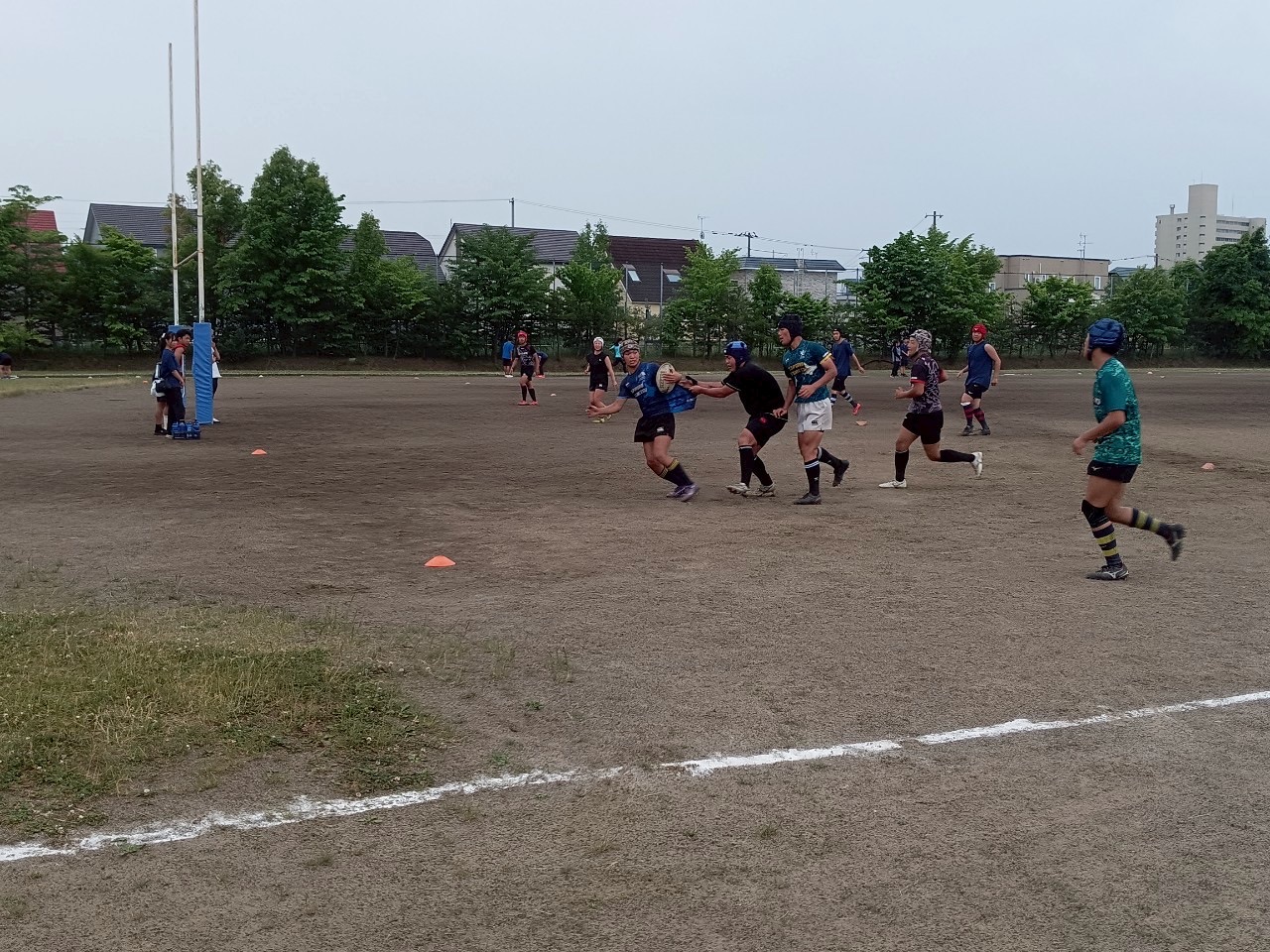 次にキックからのアタックディフェンスの練習を行いました。コミニュケーションが少なくノックオンが多く見られました。アタックはワンパスした後の細かいコミニュケーションを行うようにしましょう。また、ディフェンスは自分のゾーンに入った人に向かって横の繋がりを確認できるよう頑張りましょう。