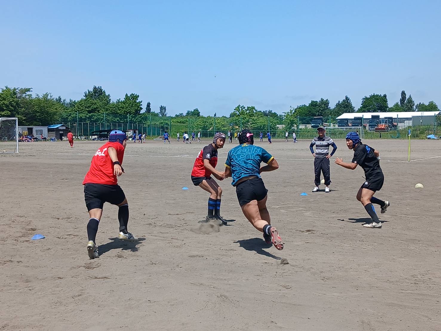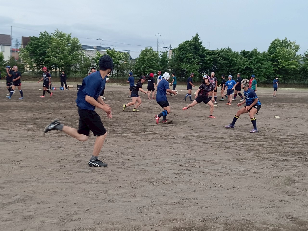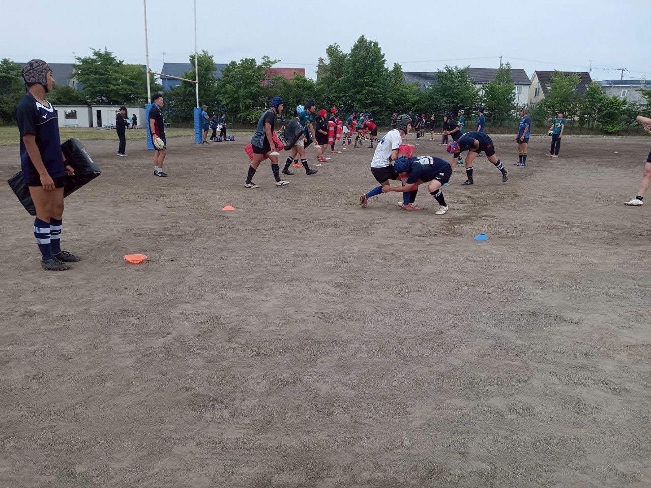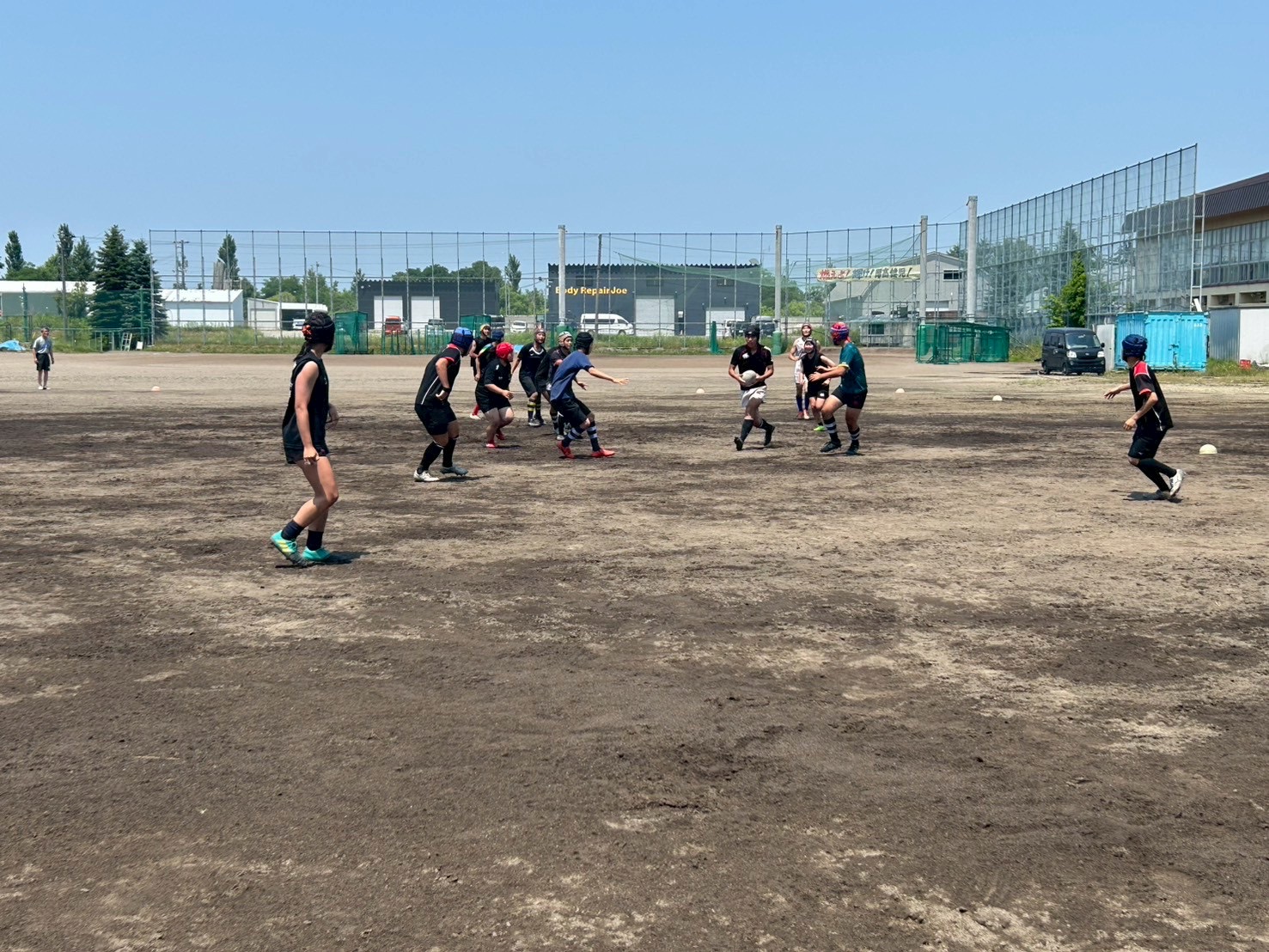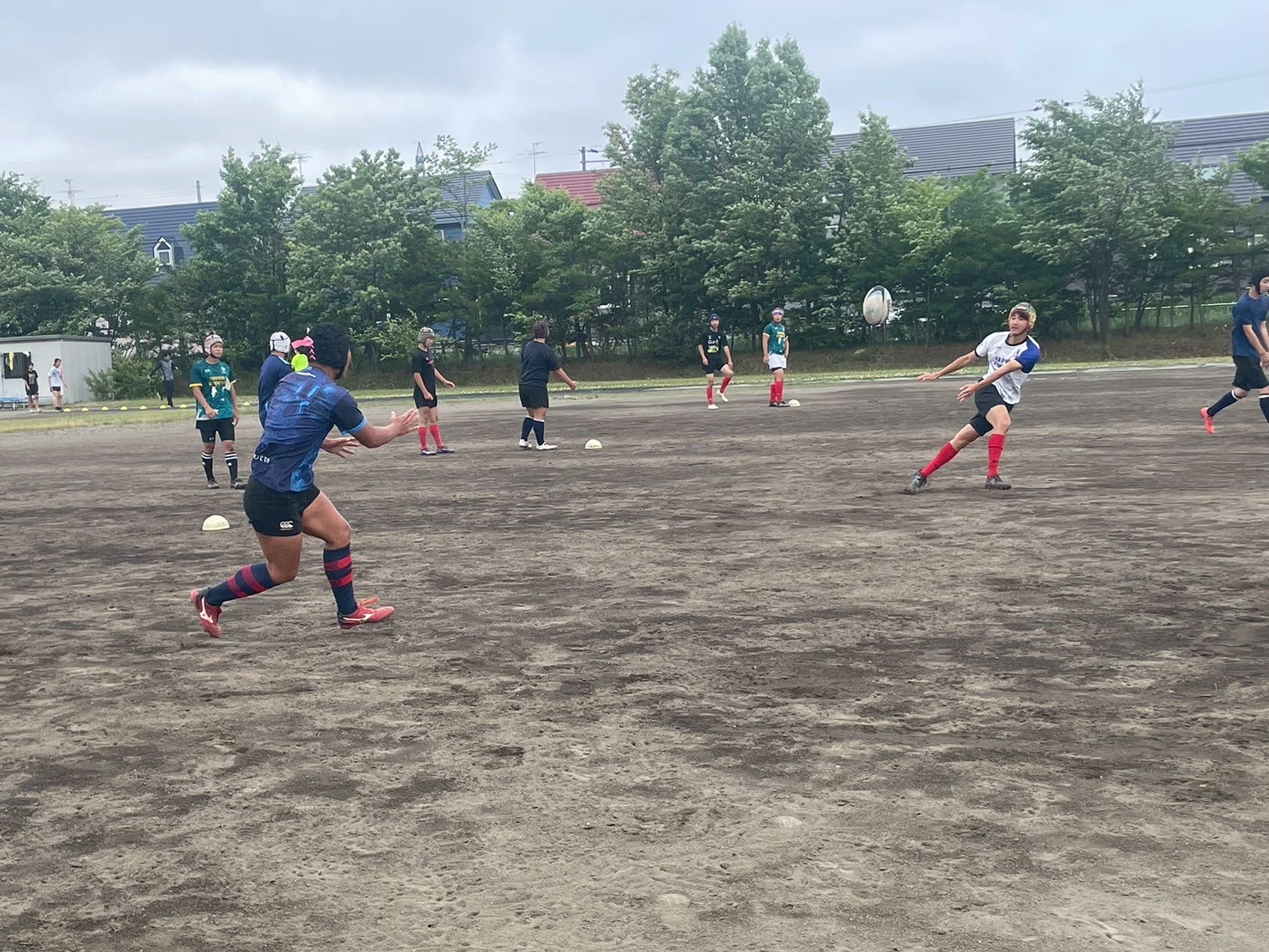 次にキックからのアタックディフェンスの練習を行いました。コミニュケーションが少なくノックオンが多く見られました。アタックはワンパスした後の細かいコミニュケーションを行うようにしましょう。また、ディフェンスは自分のゾーンに入った人に向かって横の繋がりを確認できるよう頑張りましょう。
