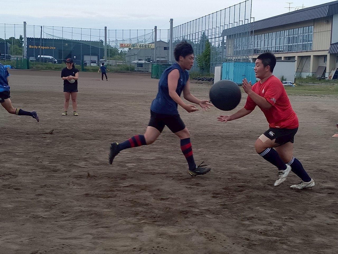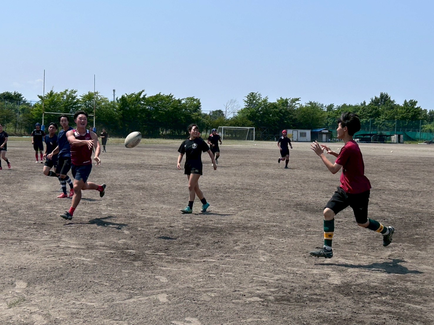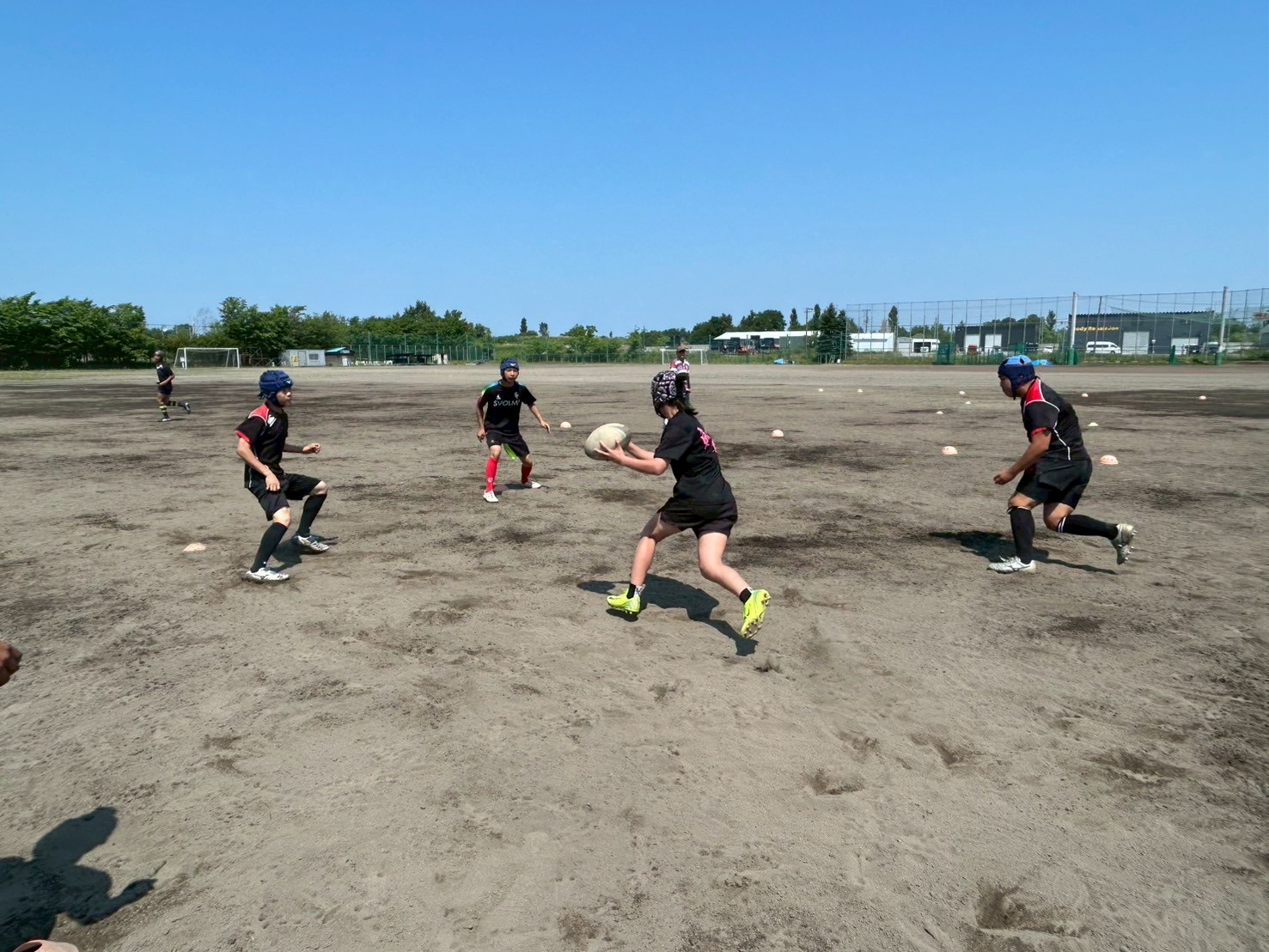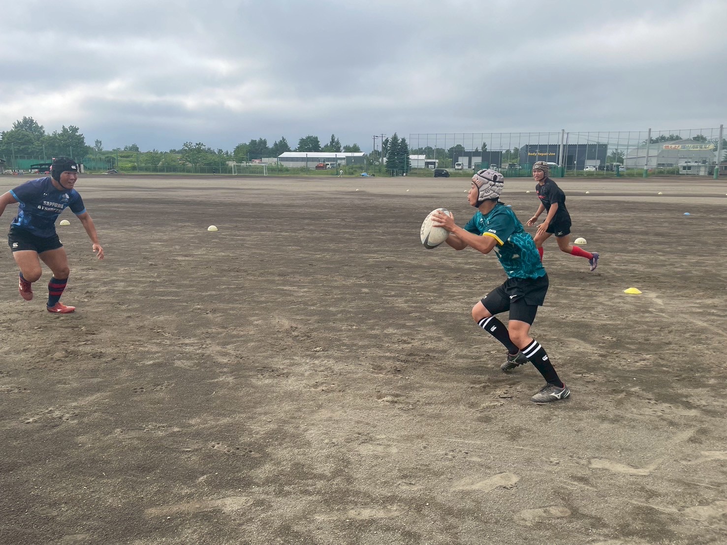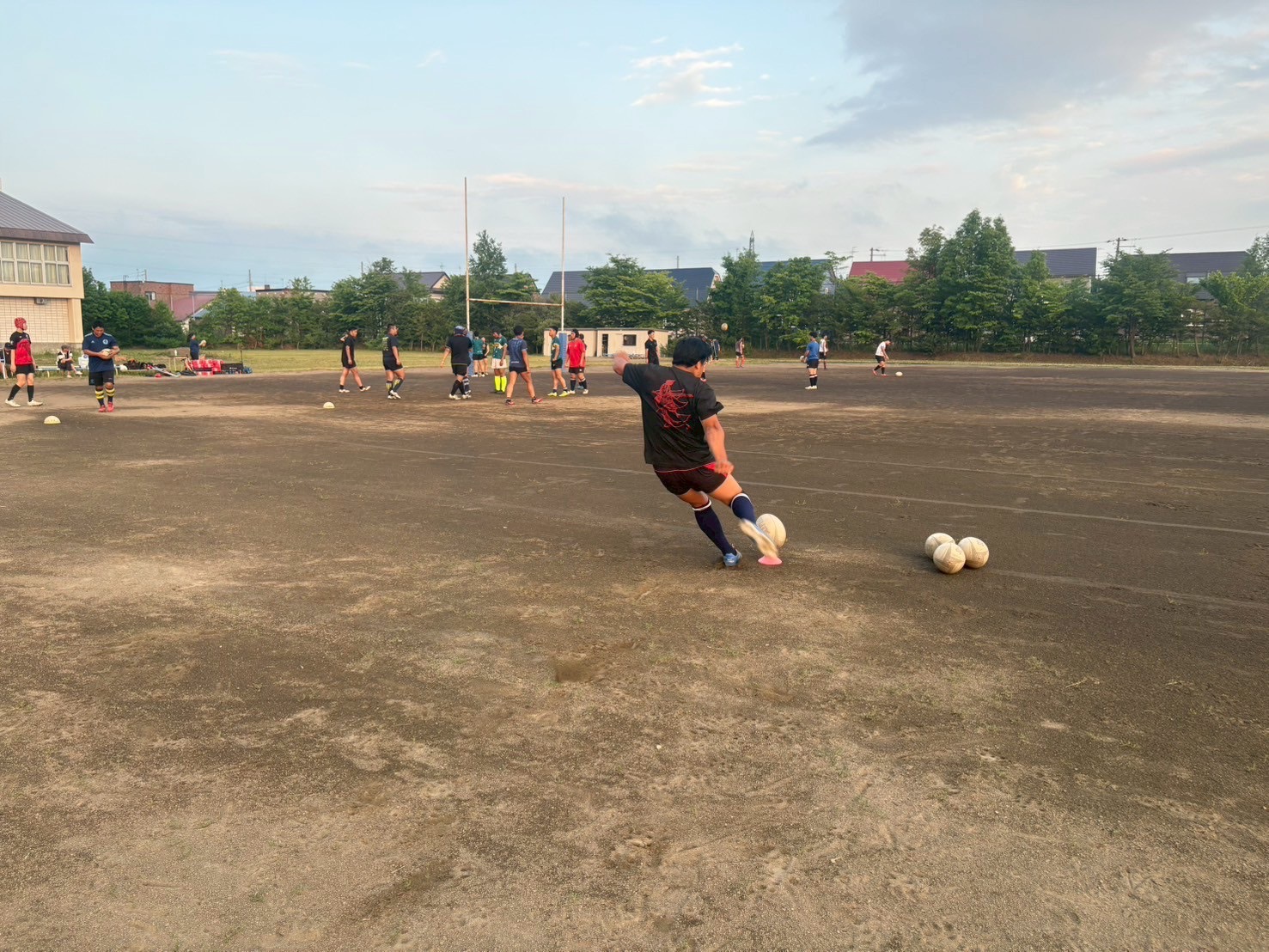 次にキックからのアタックディフェンスの練習を行いました。コミニュケーションが少なくノックオンが多く見られました。アタックはワンパスした後の細かいコミニュケーションを行うようにしましょう。また、ディフェンスは自分のゾーンに入った人に向かって横の繋がりを確認できるよう頑張りましょう。