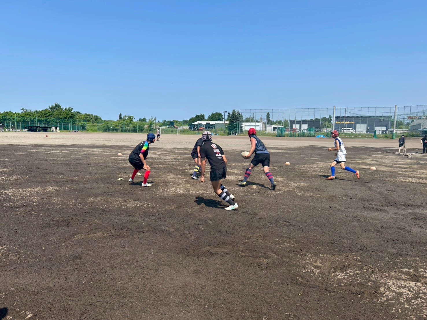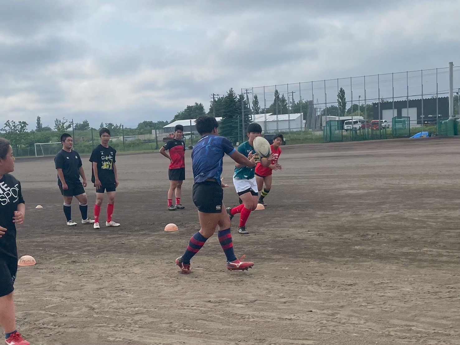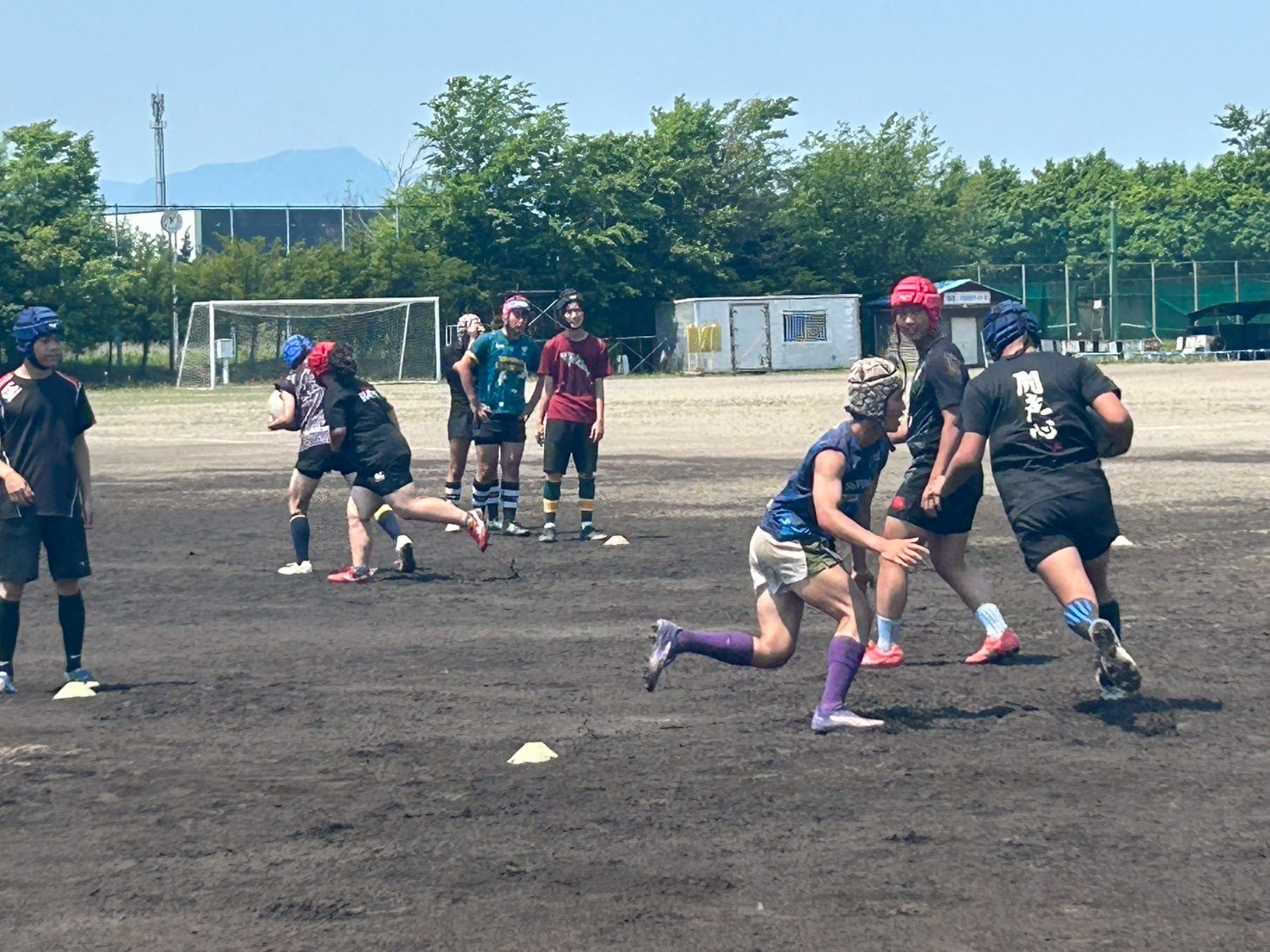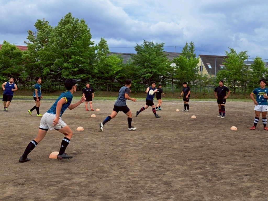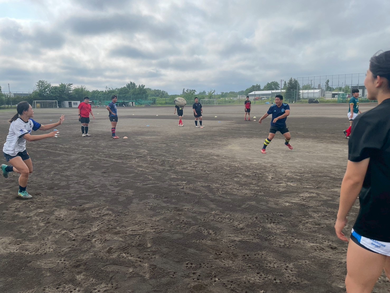 次にキックからのアタックディフェンスの練習を行いました。コミニュケーションが少なくノックオンが多く見られました。アタックはワンパスした後の細かいコミニュケーションを行うようにしましょう。また、ディフェンスは自分のゾーンに入った人に向かって横の繋がりを確認できるよう頑張りましょう。