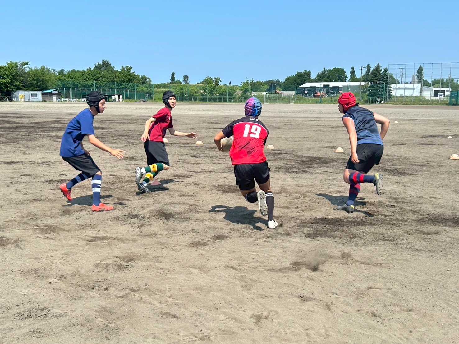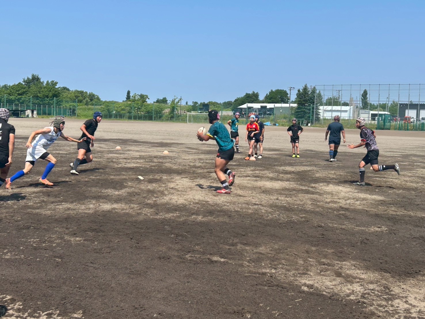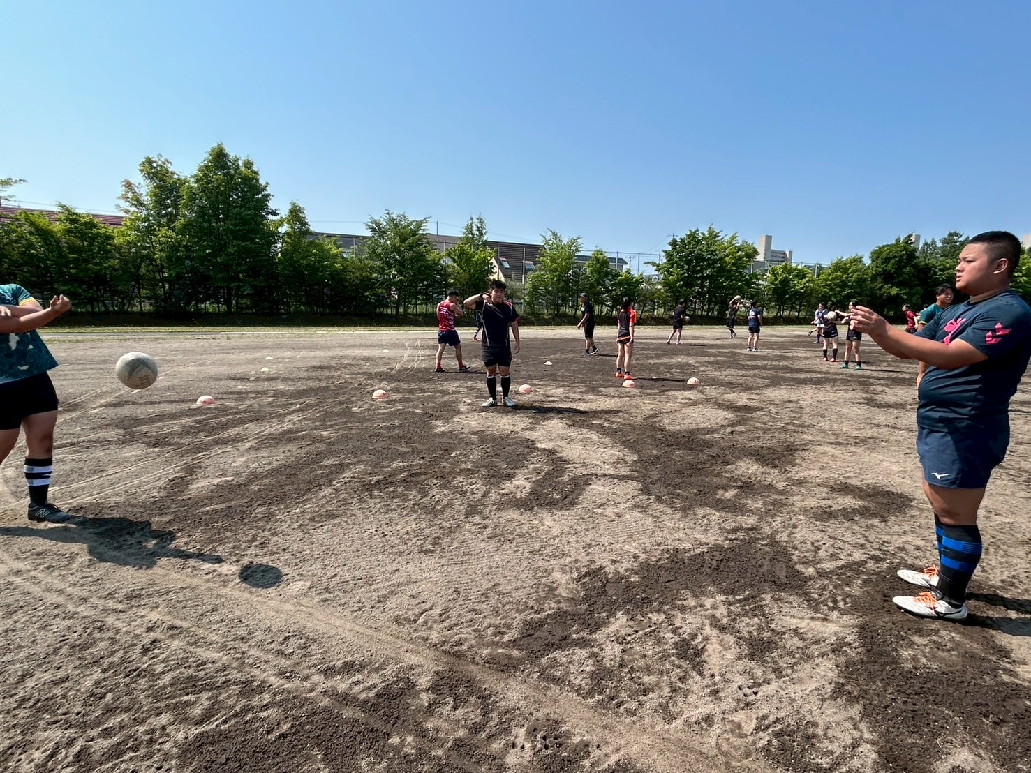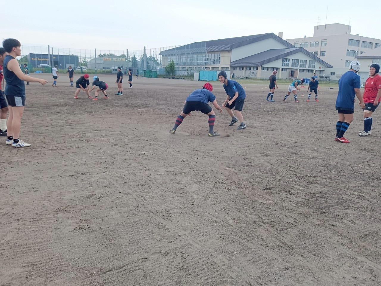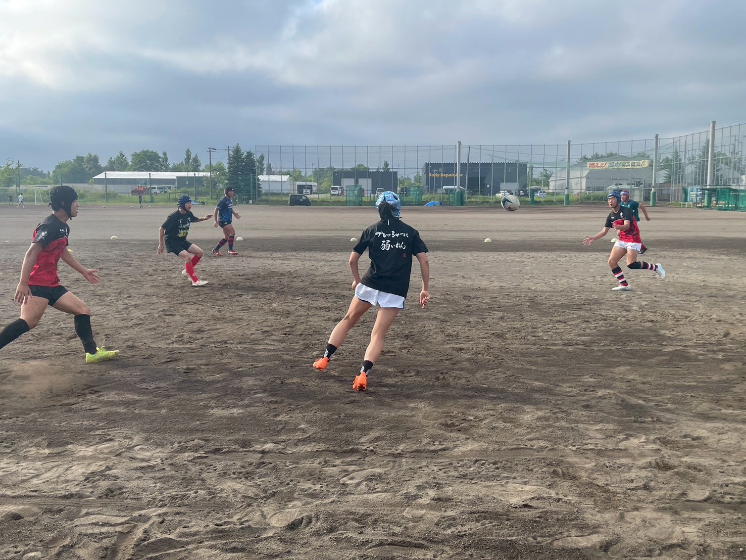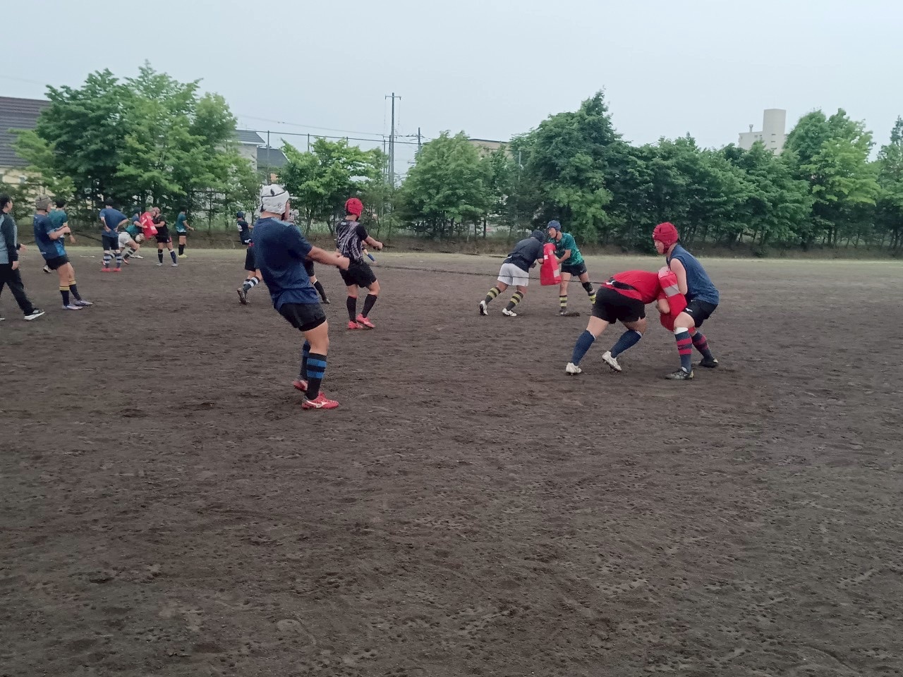 次にキックからのアタックディフェンスの練習を行いました。コミニュケーションが少なくノックオンが多く見られました。アタックはワンパスした後の細かいコミニュケーションを行うようにしましょう。また、ディフェンスは自分のゾーンに入った人に向かって横の繋がりを確認できるよう頑張りましょう。