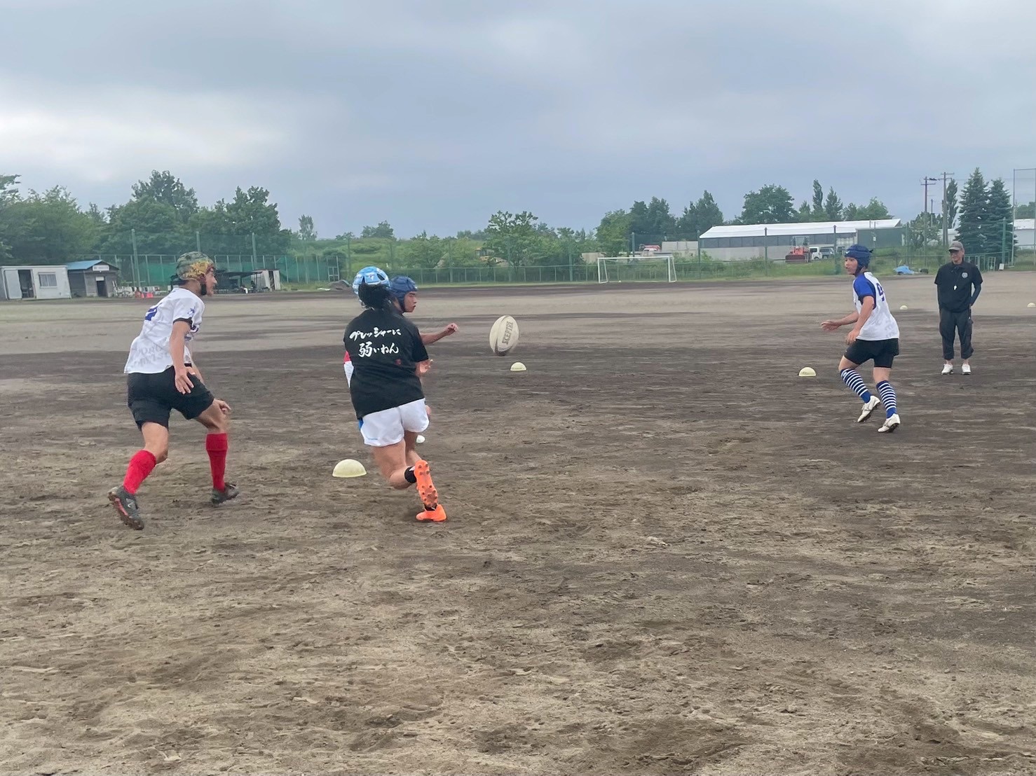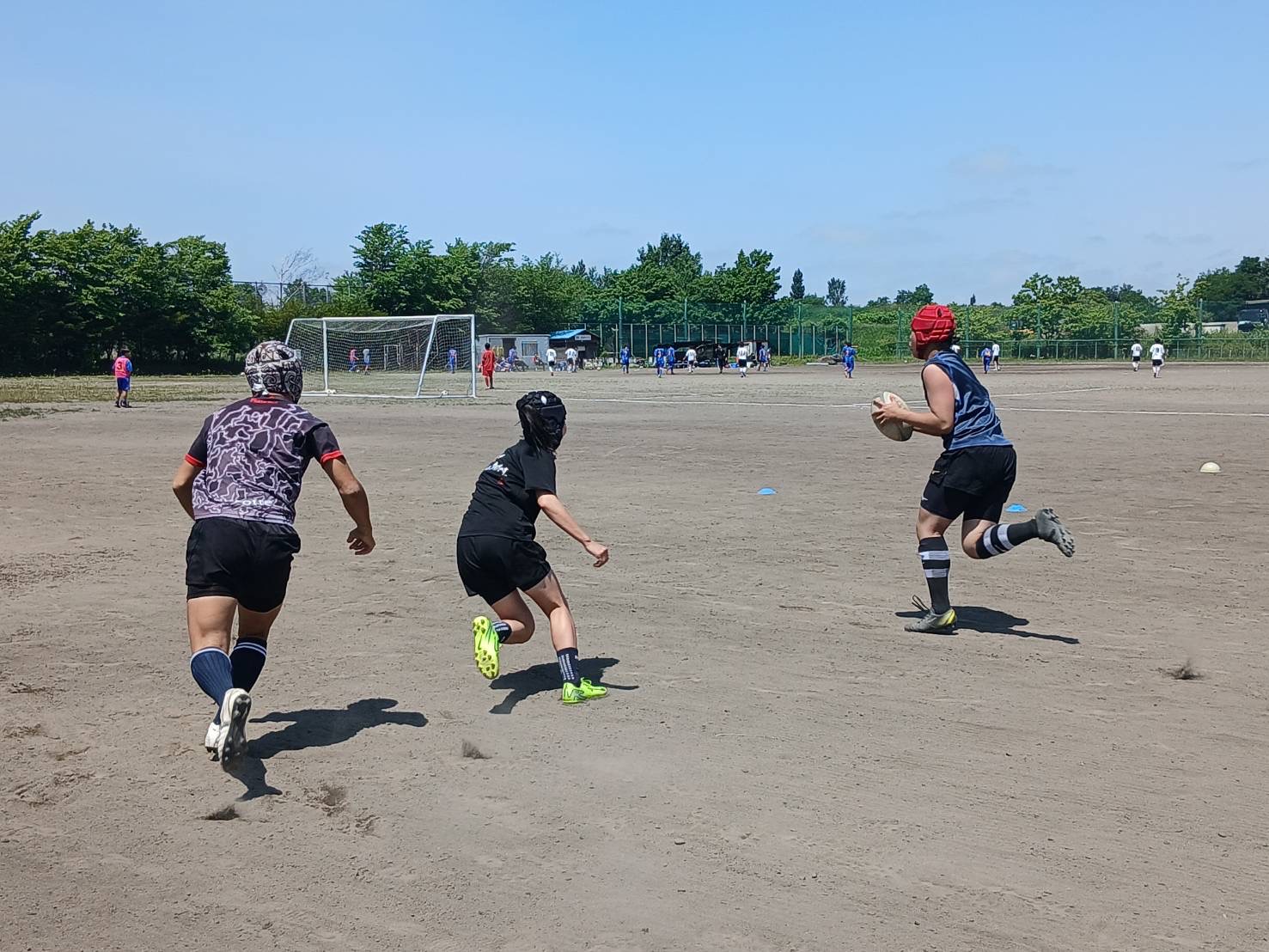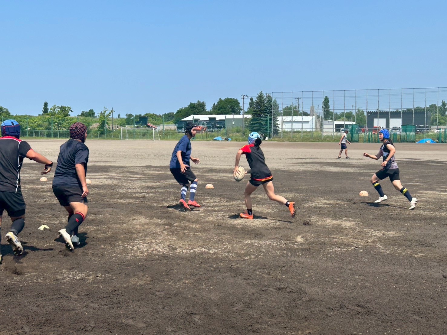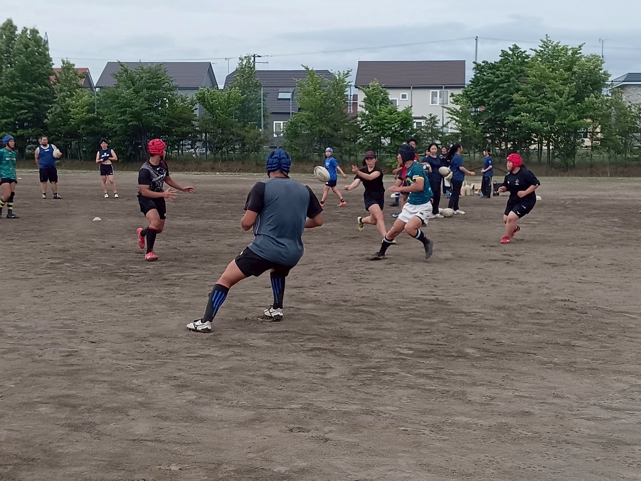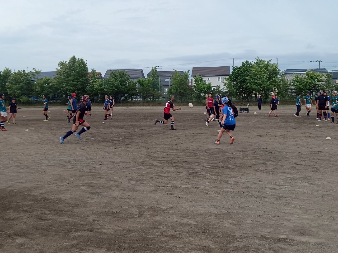 次にキックからのアタックディフェンスの練習を行いました。コミニュケーションが少なくノックオンが多く見られました。アタックはワンパスした後の細かいコミニュケーションを行うようにしましょう。また、ディフェンスは自分のゾーンに入った人に向かって横の繋がりを確認できるよう頑張りましょう。