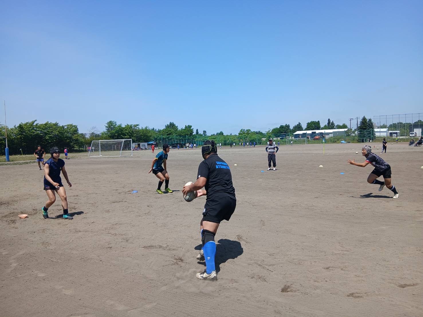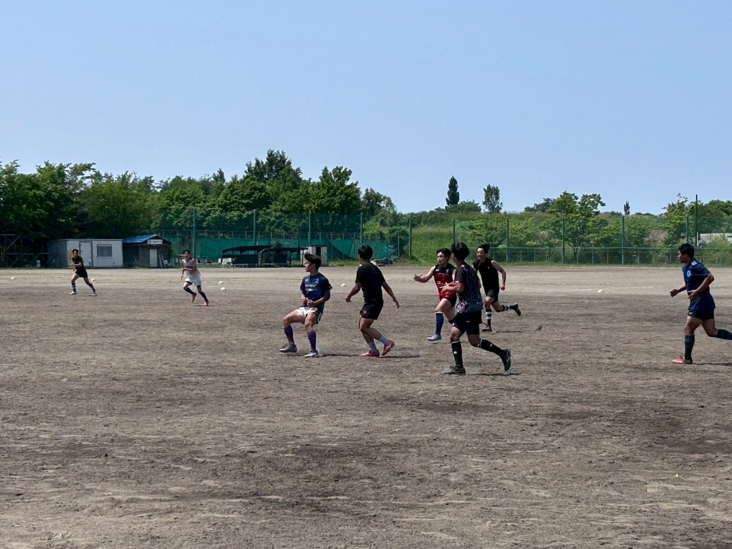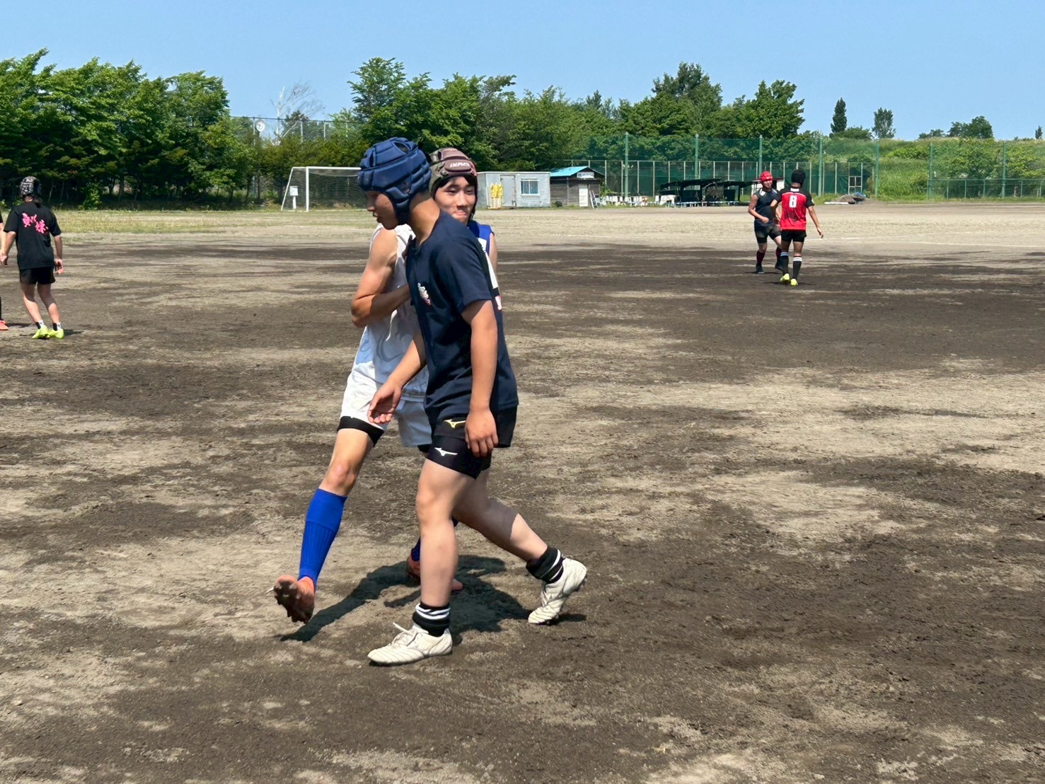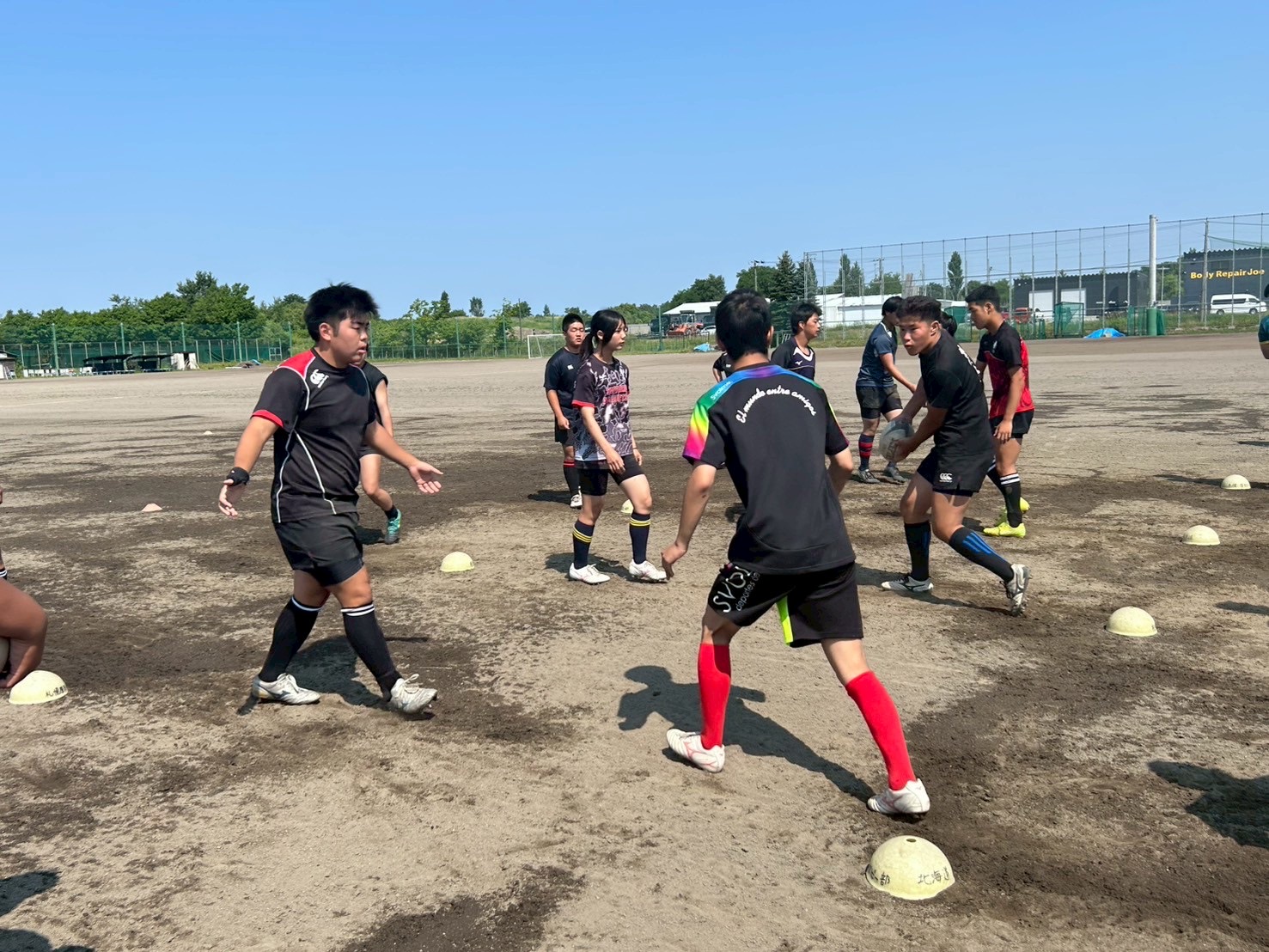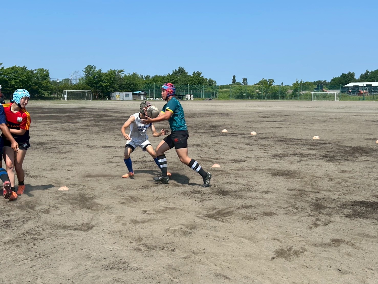 次にキックからのアタックディフェンスの練習を行いました。コミニュケーションが少なくノックオンが多く見られました。アタックはワンパスした後の細かいコミニュケーションを行うようにしましょう。また、ディフェンスは自分のゾーンに入った人に向かって横の繋がりを確認できるよう頑張りましょう。