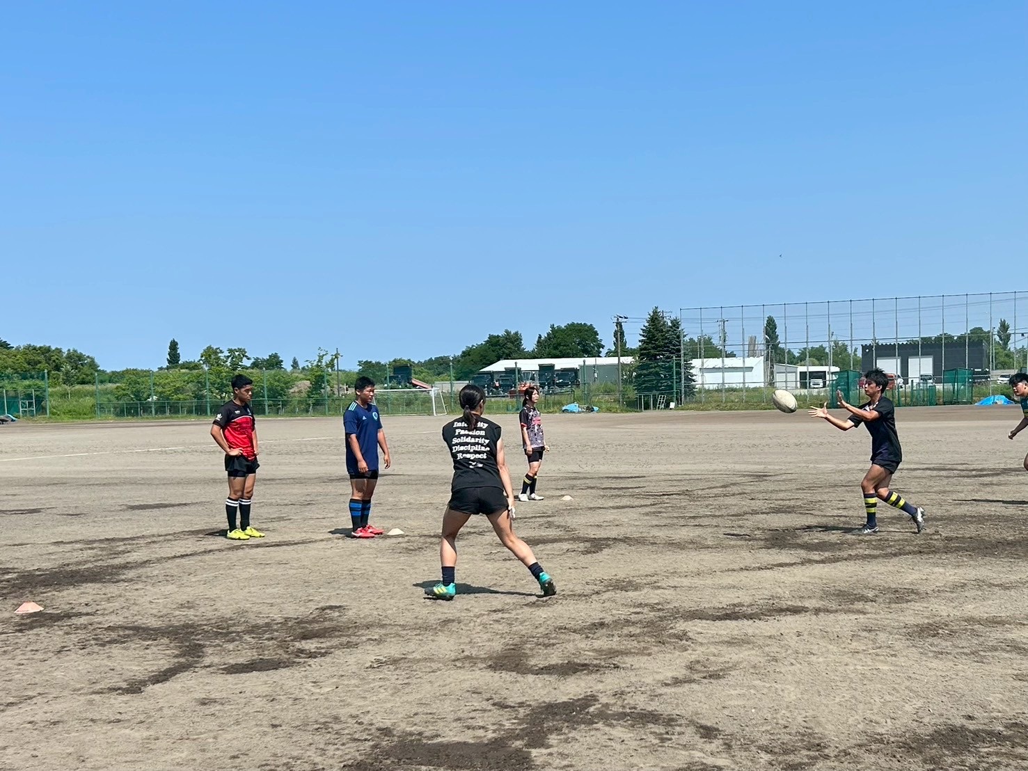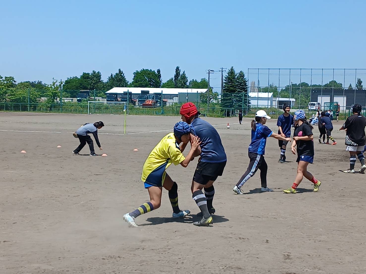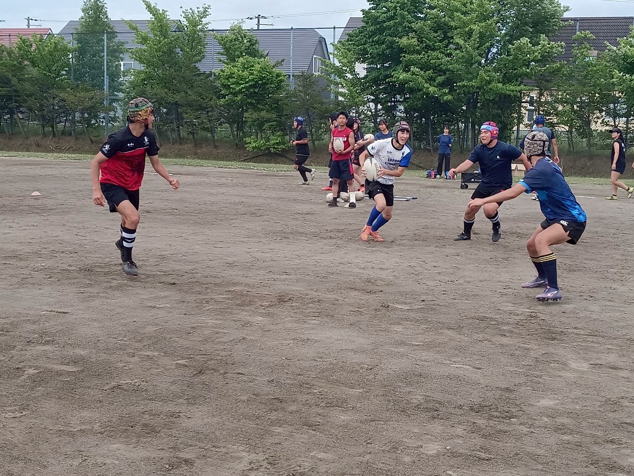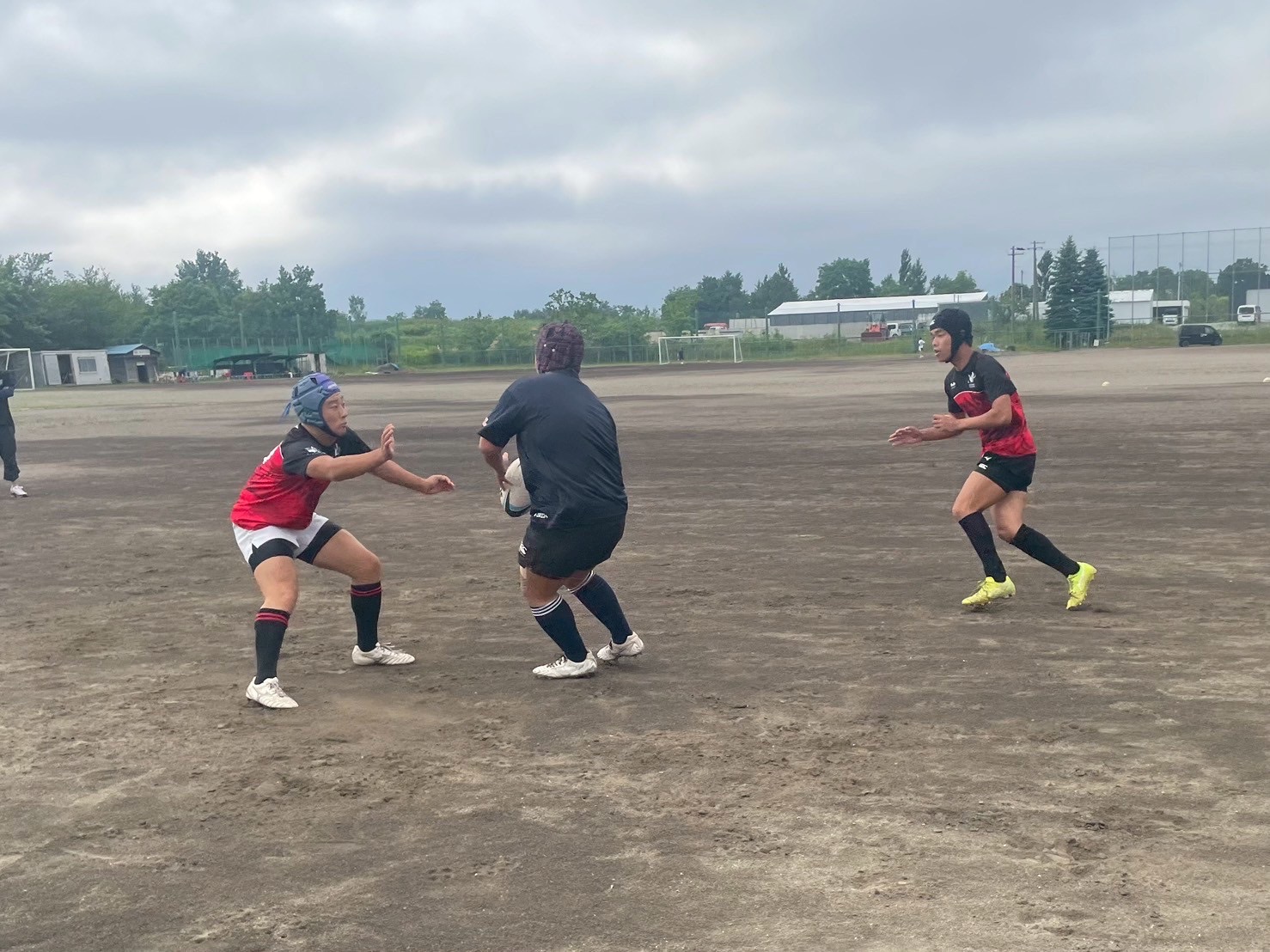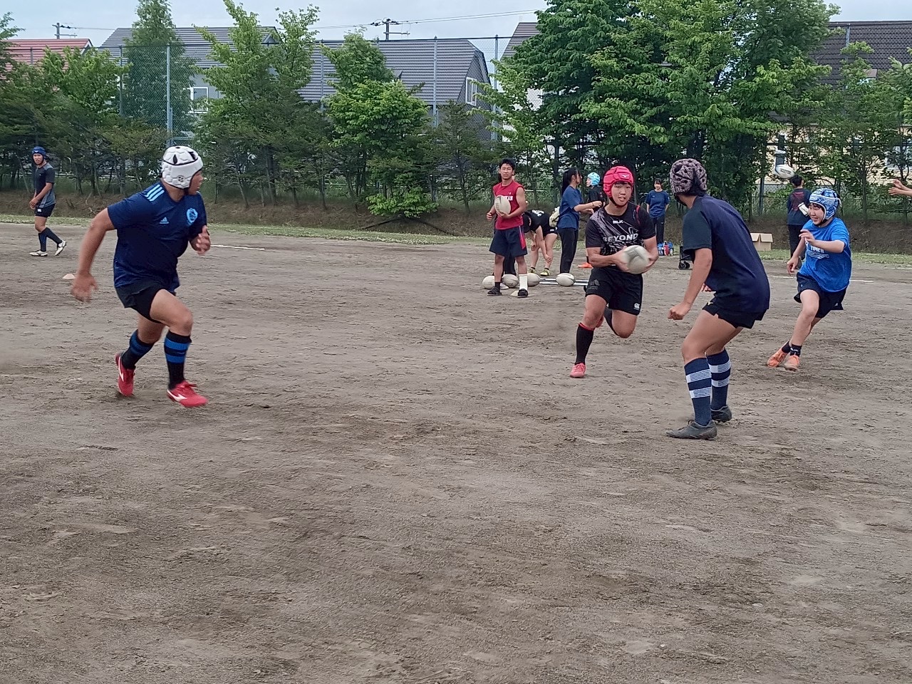 次にキックからのアタックディフェンスの練習を行いました。コミニュケーションが少なくノックオンが多く見られました。アタックはワンパスした後の細かいコミニュケーションを行うようにしましょう。また、ディフェンスは自分のゾーンに入った人に向かって横の繋がりを確認できるよう頑張りましょう。