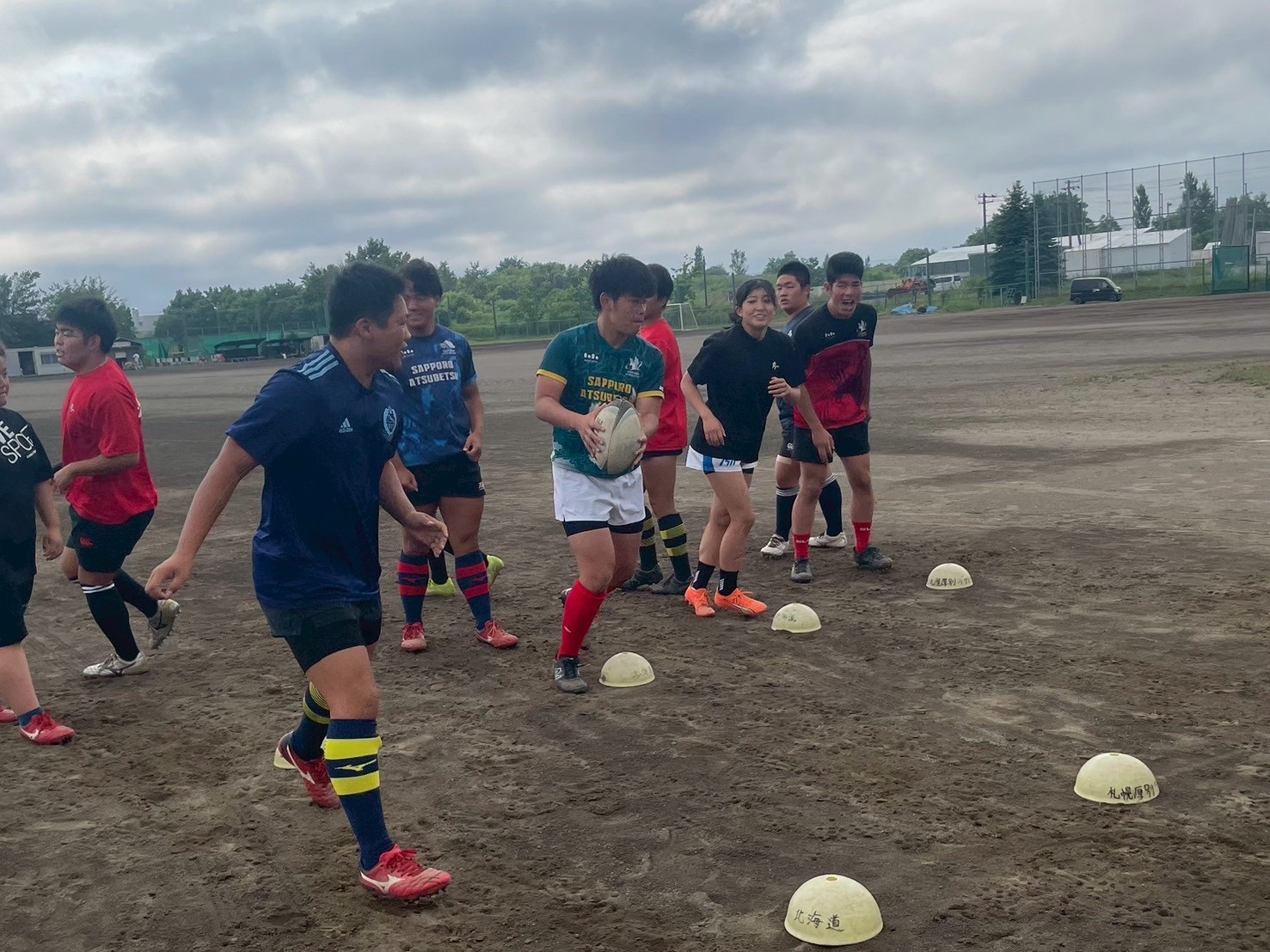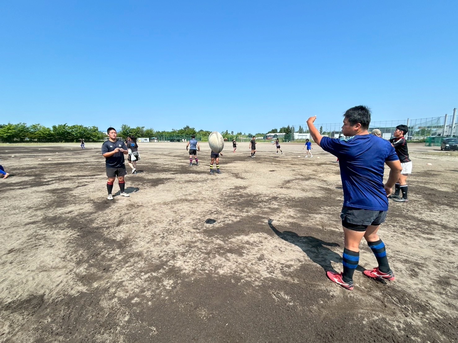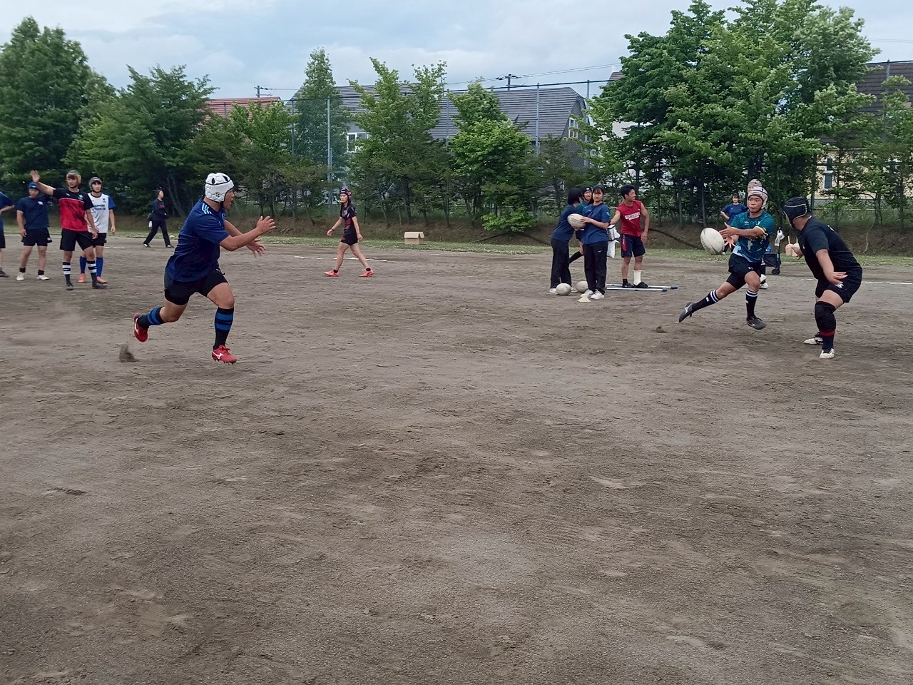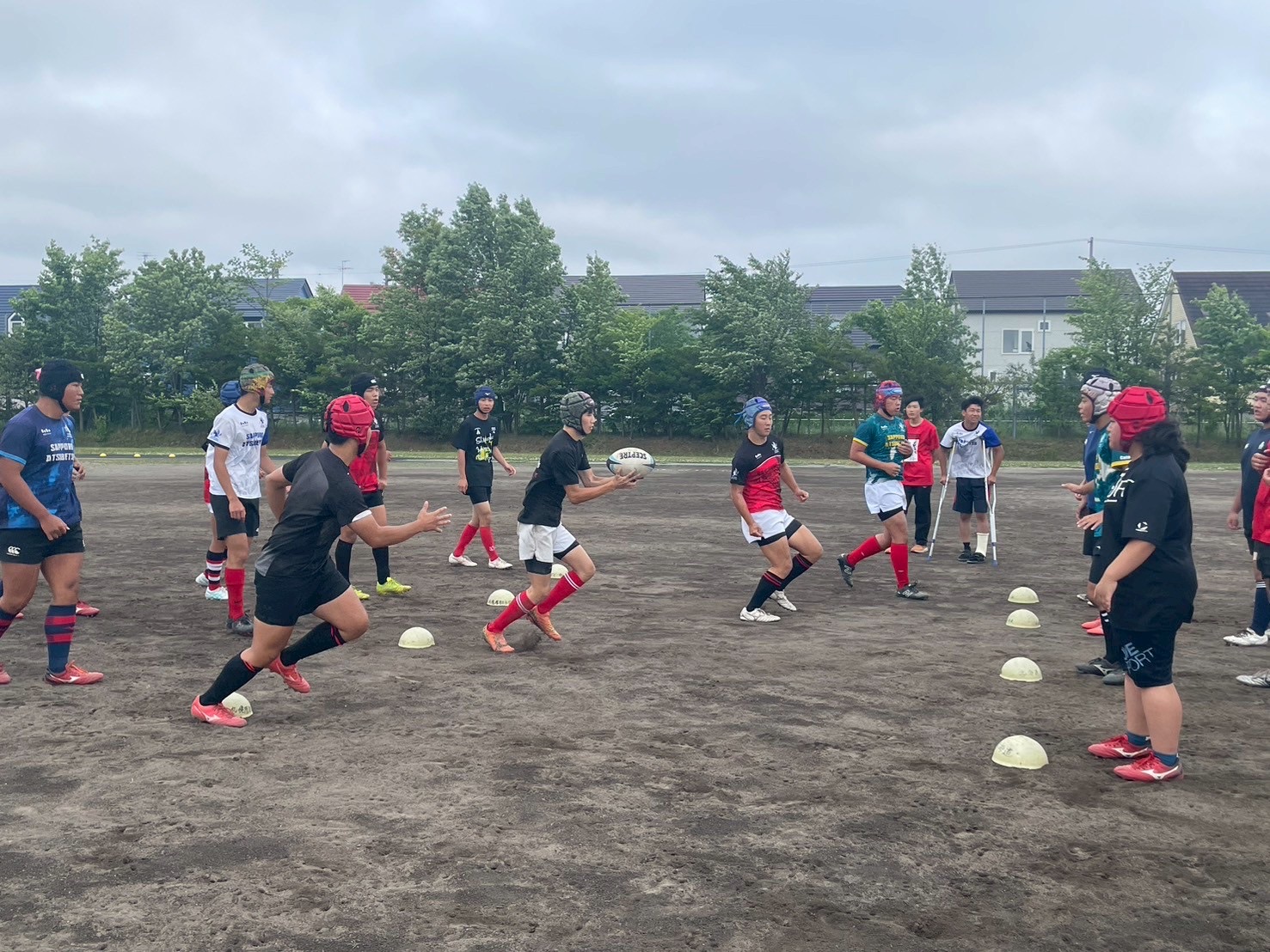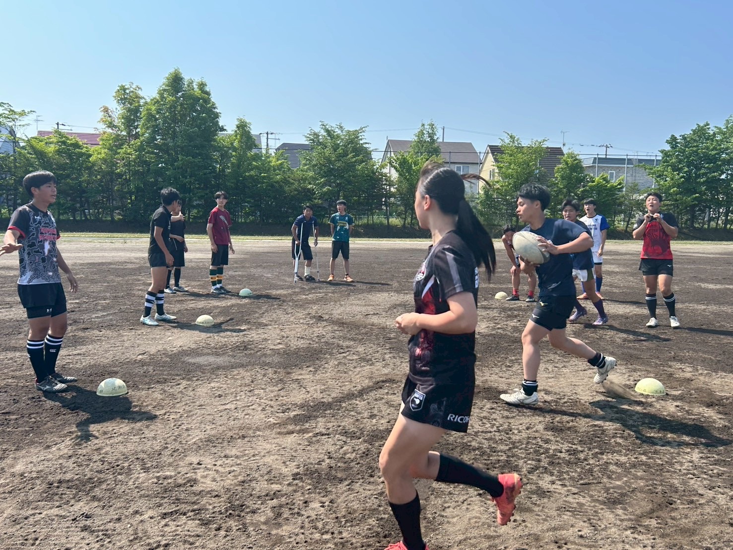 次にキックからのアタックディフェンスの練習を行いました。コミニュケーションが少なくノックオンが多く見られました。アタックはワンパスした後の細かいコミニュケーションを行うようにしましょう。また、ディフェンスは自分のゾーンに入った人に向かって横の繋がりを確認できるよう頑張りましょう。