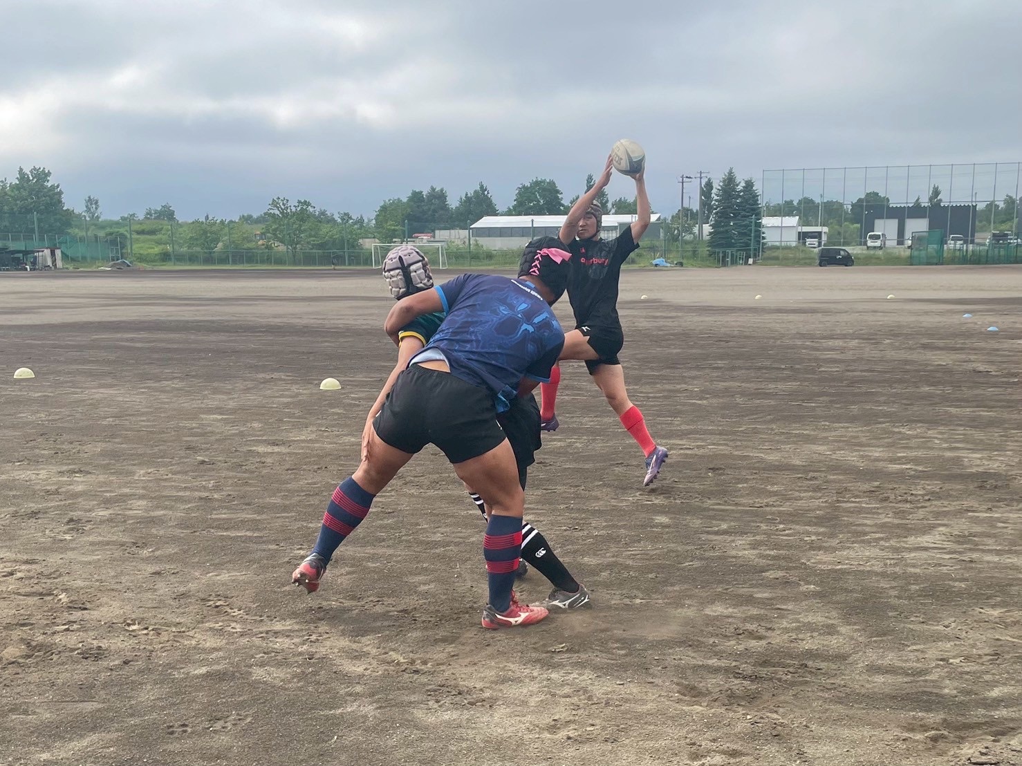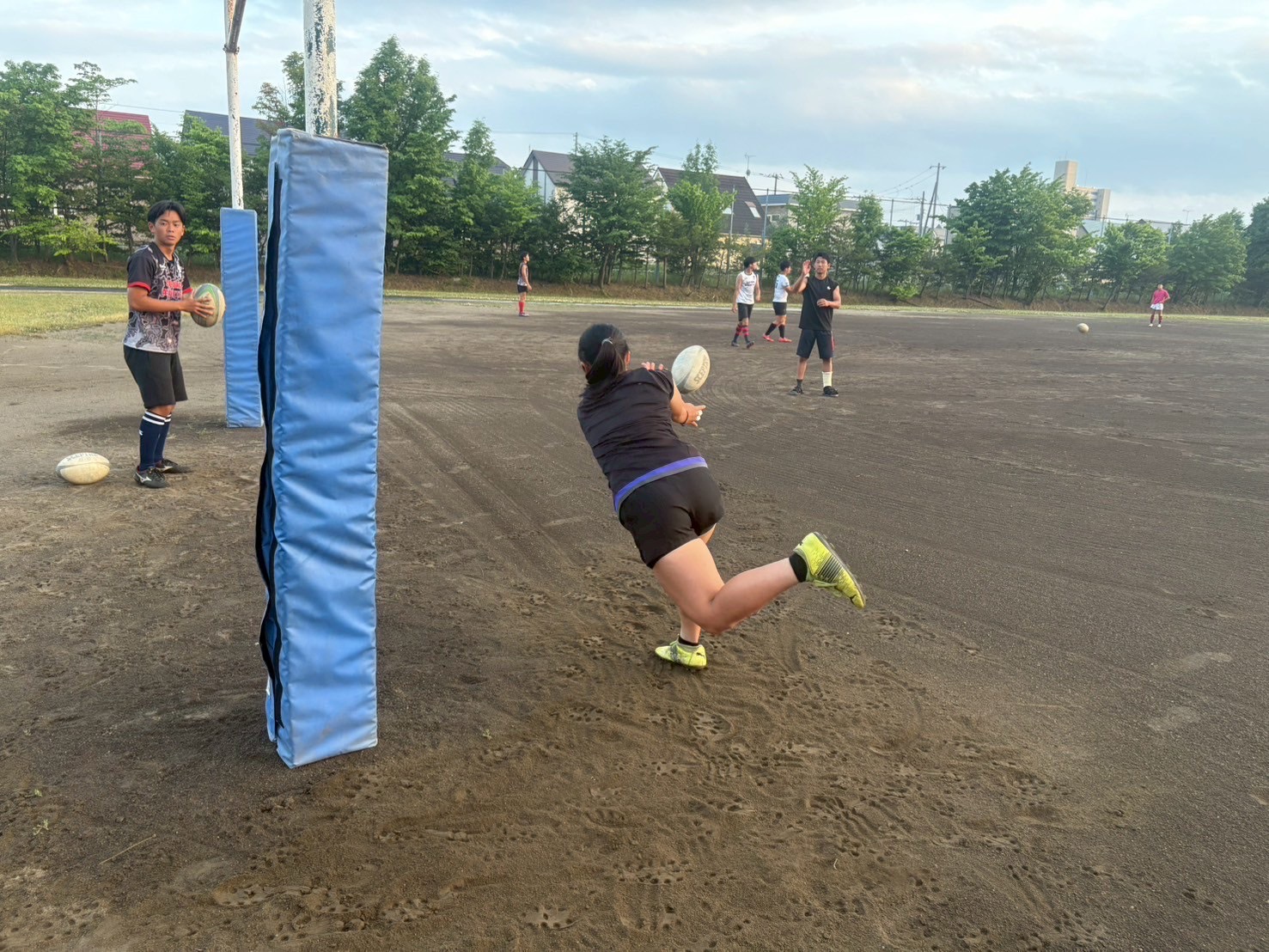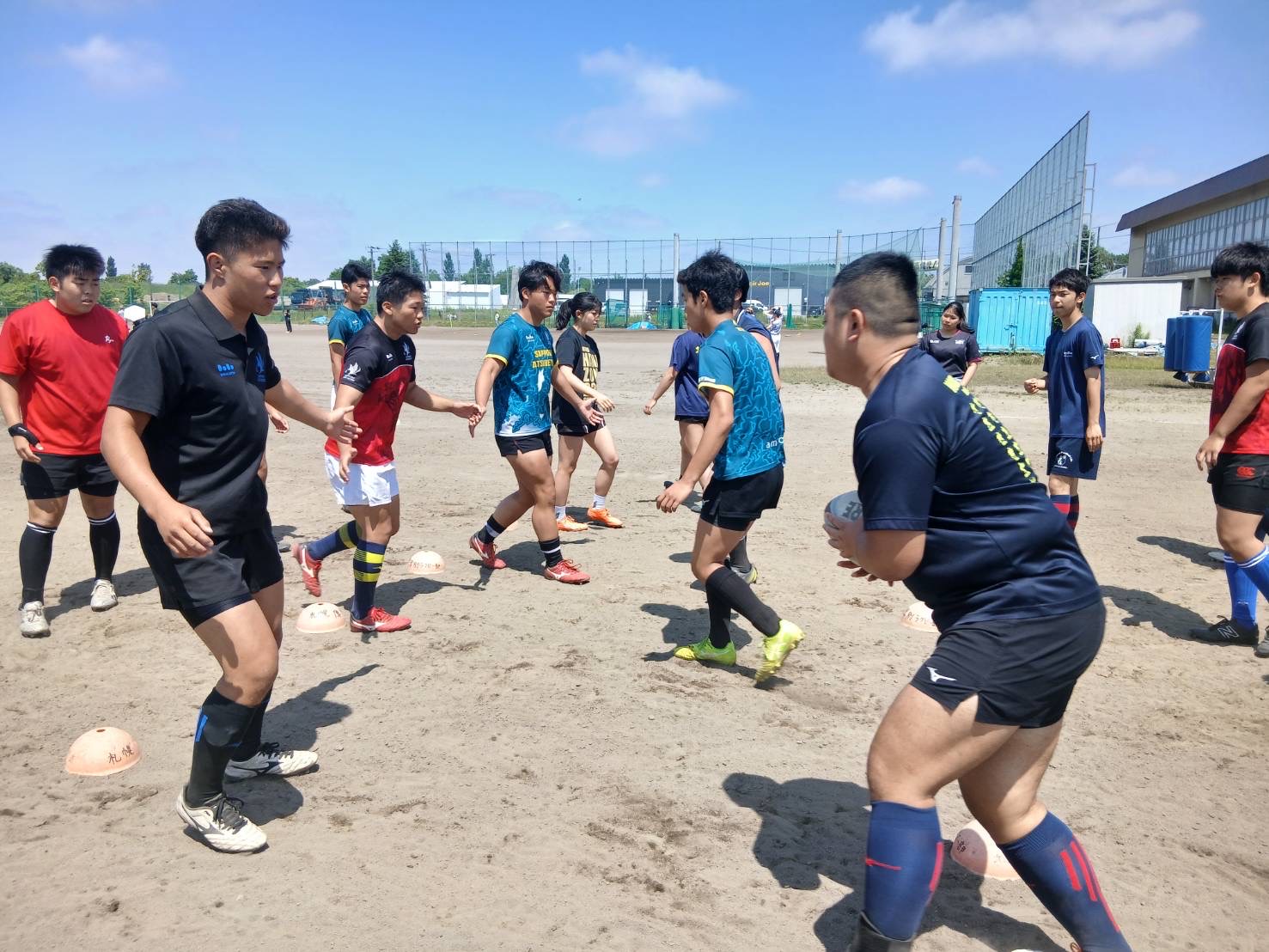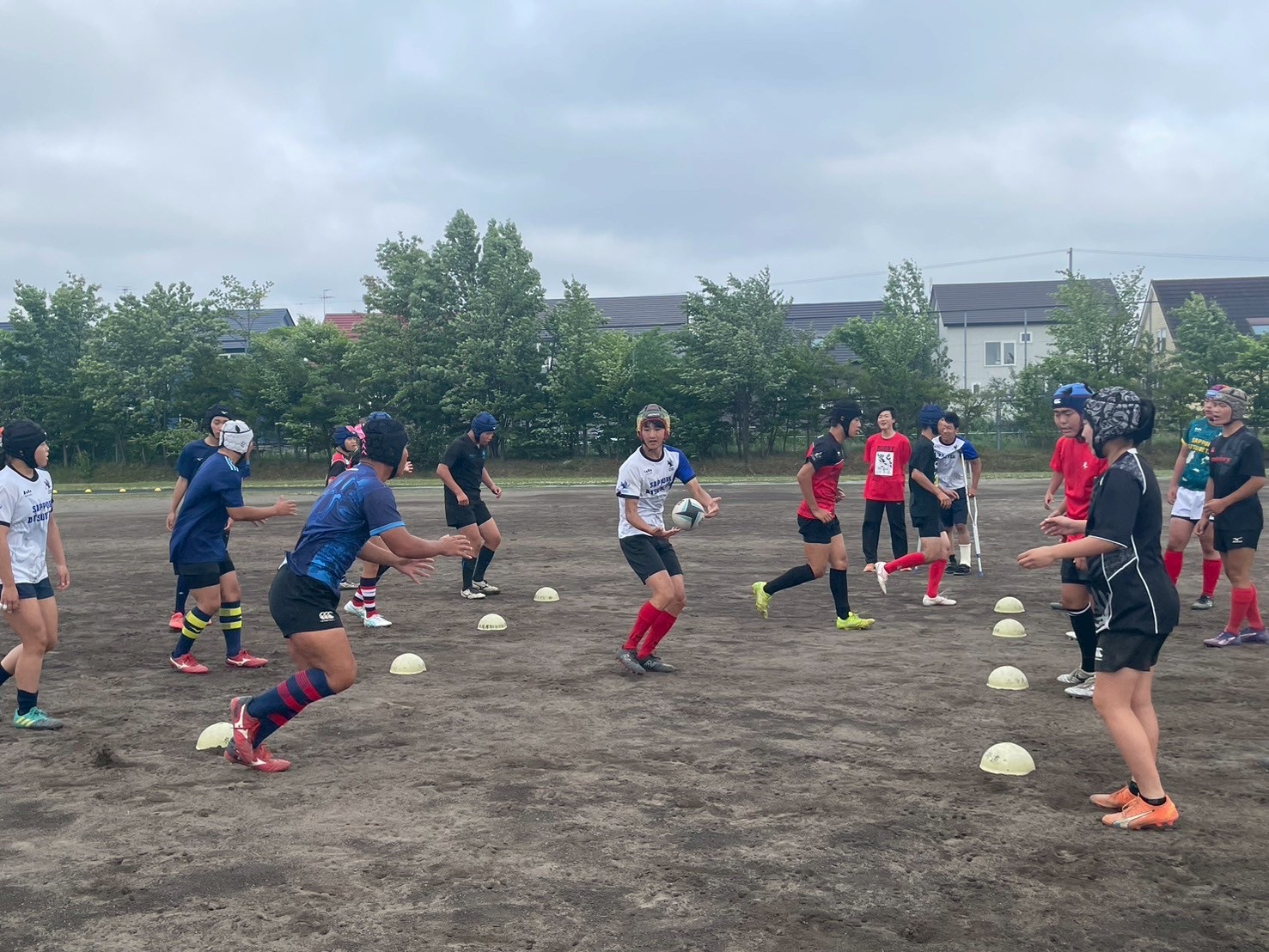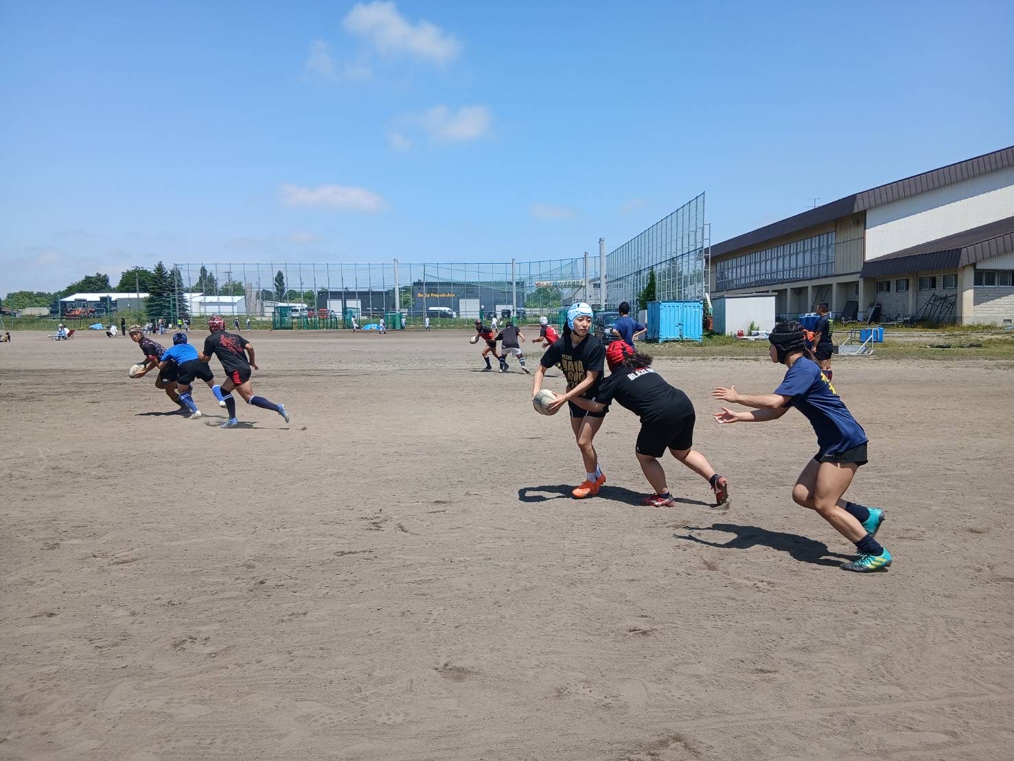 次にキックからのアタックディフェンスの練習を行いました。コミニュケーションが少なくノックオンが多く見られました。アタックはワンパスした後の細かいコミニュケーションを行うようにしましょう。また、ディフェンスは自分のゾーンに入った人に向かって横の繋がりを確認できるよう頑張りましょう。