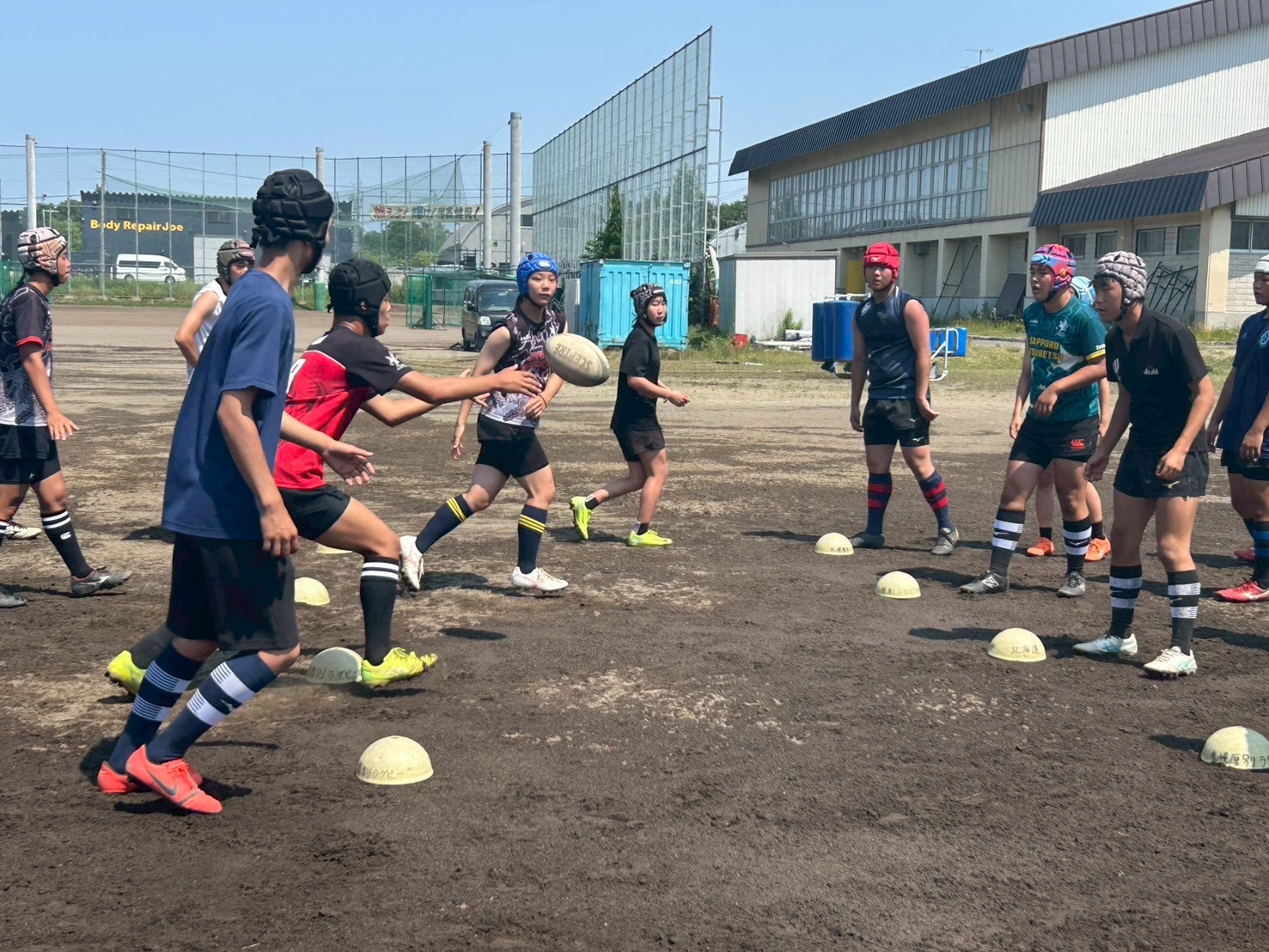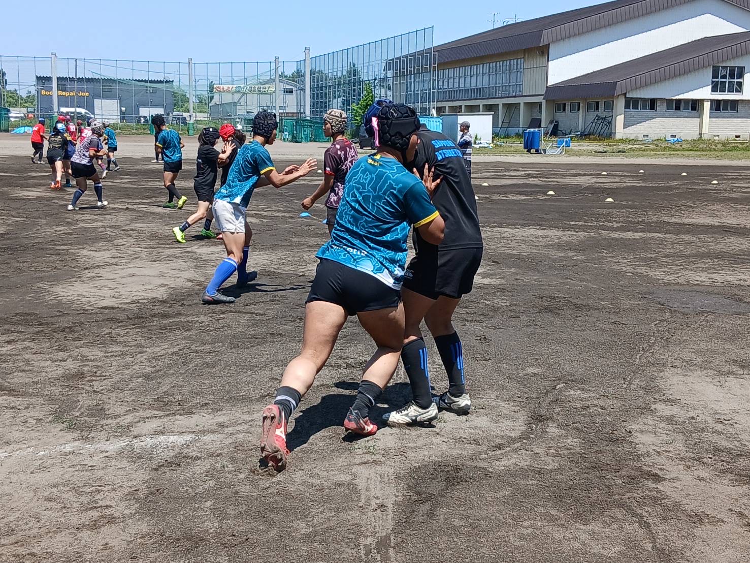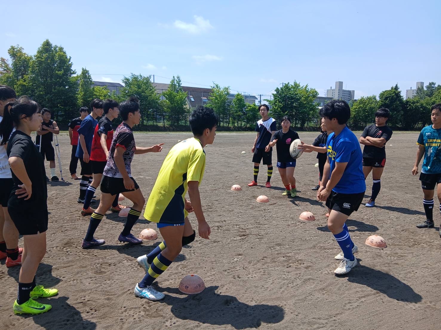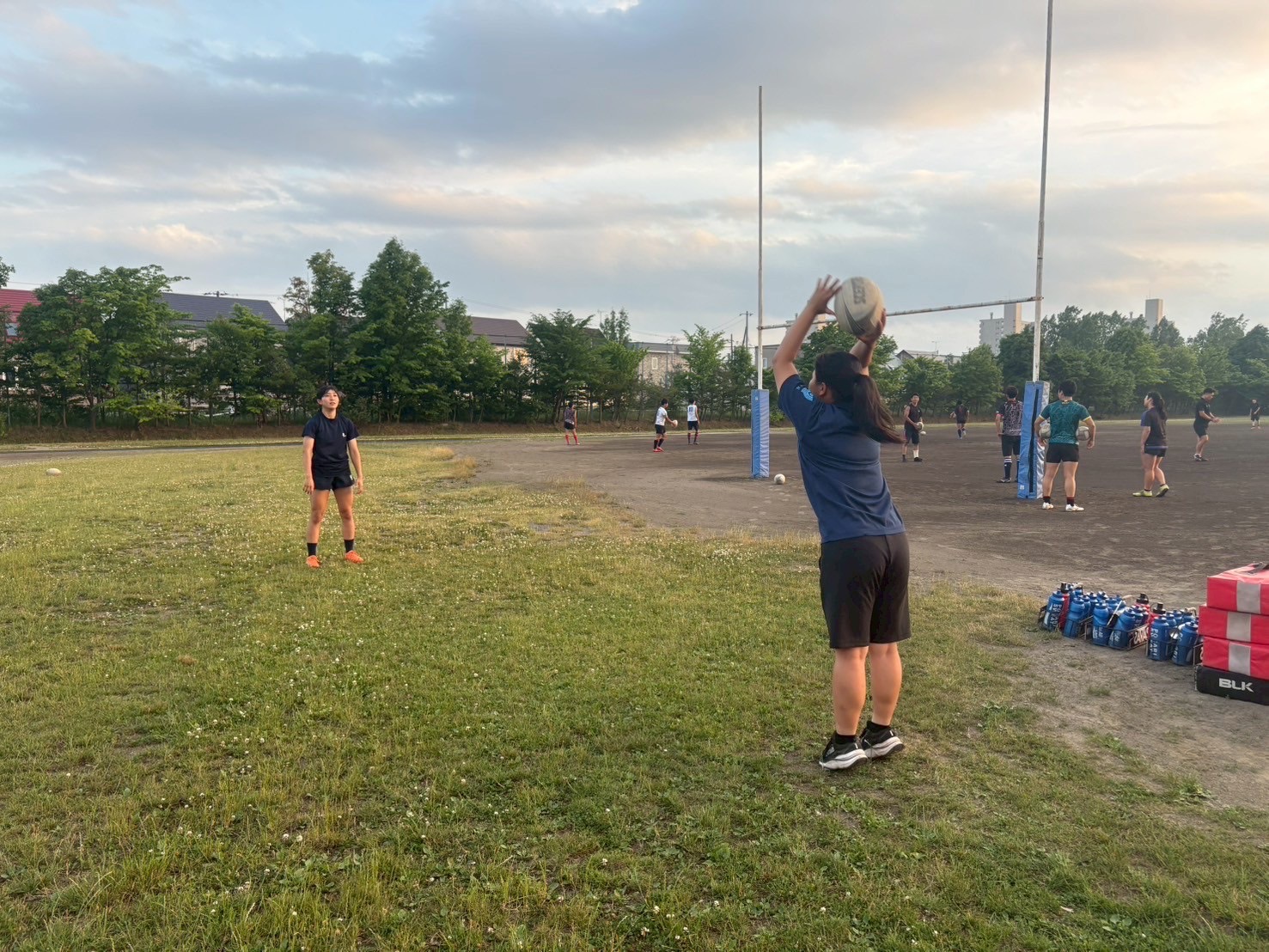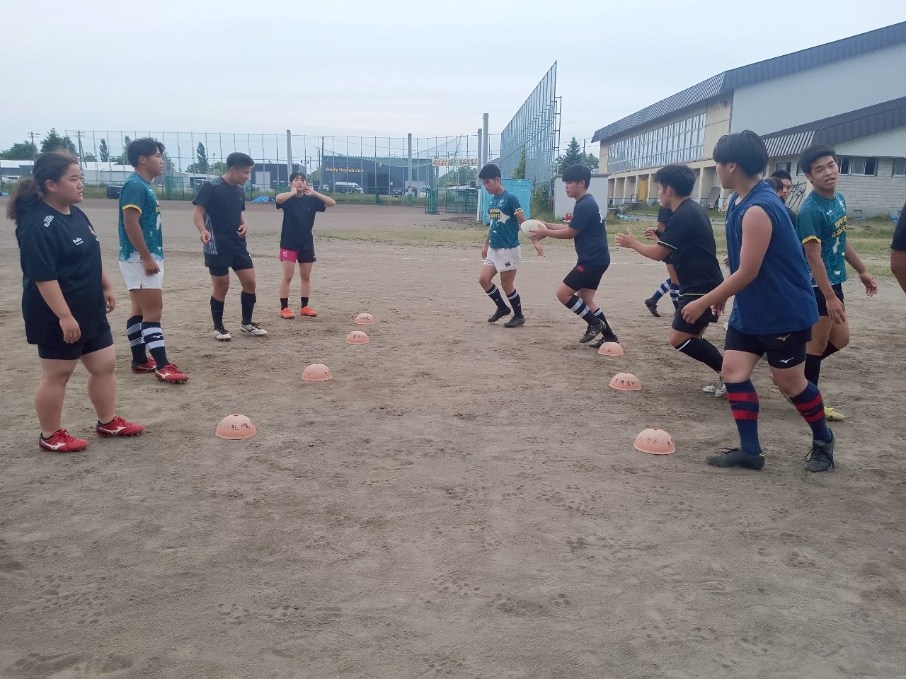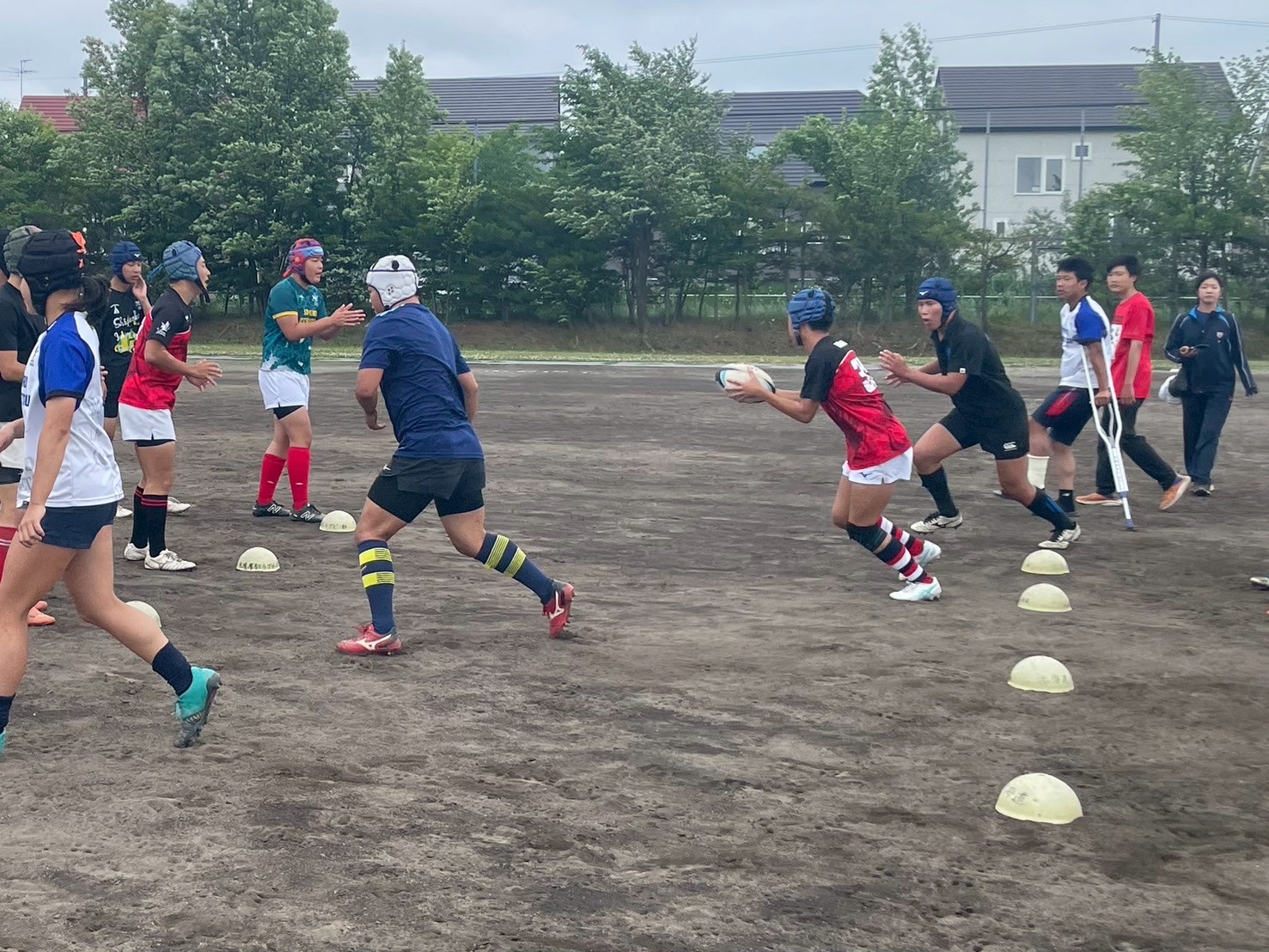 次にキックからのアタックディフェンスの練習を行いました。コミニュケーションが少なくノックオンが多く見られました。アタックはワンパスした後の細かいコミニュケーションを行うようにしましょう。また、ディフェンスは自分のゾーンに入った人に向かって横の繋がりを確認できるよう頑張りましょう。