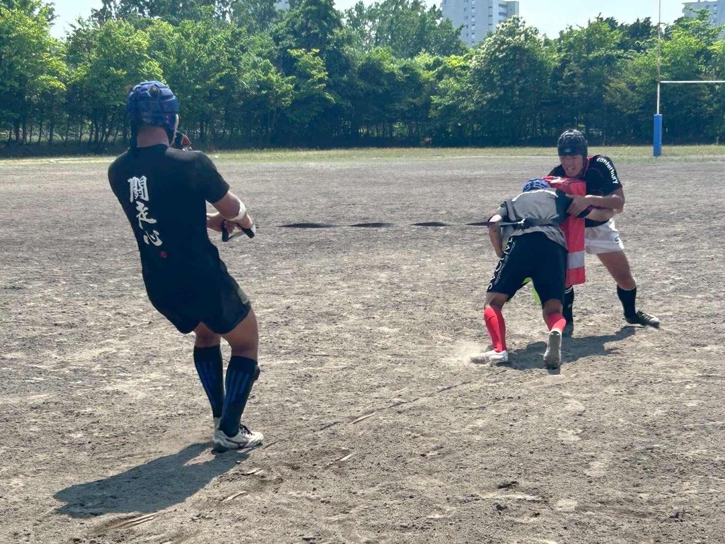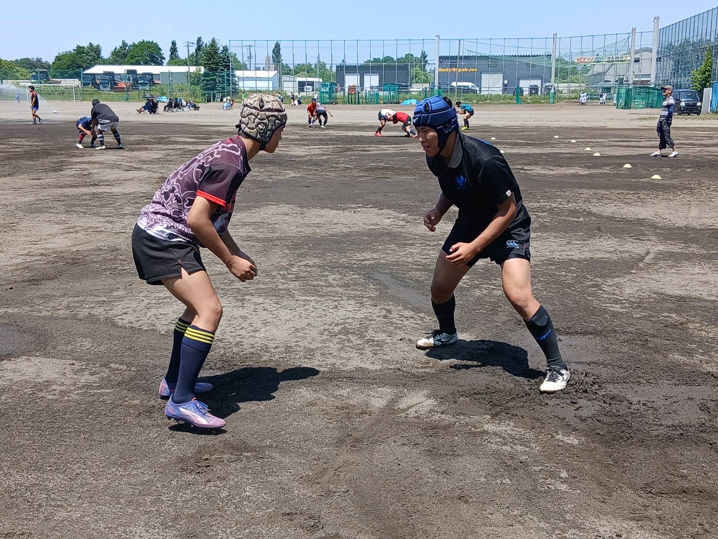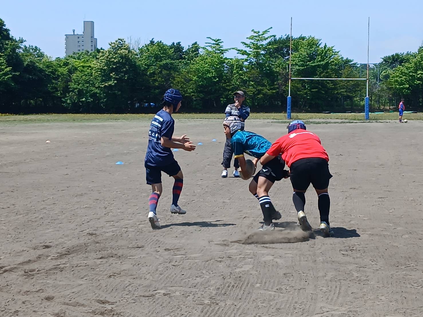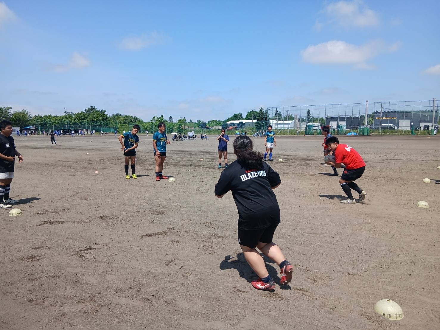 もう一度、ひし形マーカーのタックル練習を行いました。ディップができていないとのご指摘をいただいたので改善していきましょう。