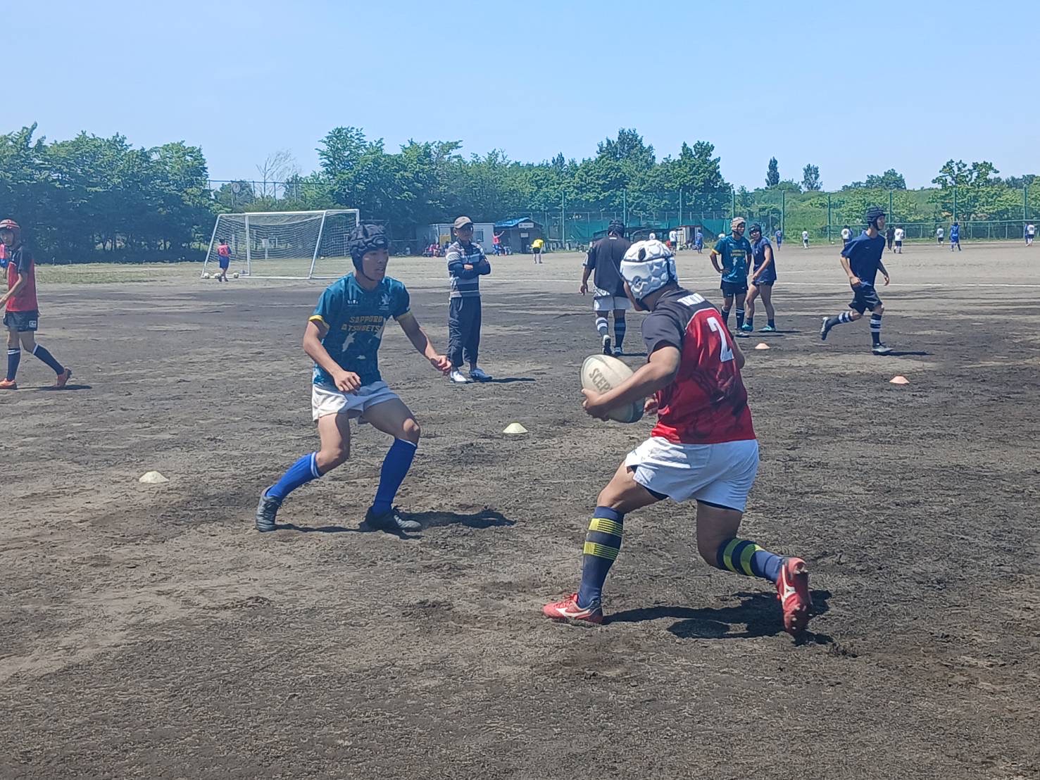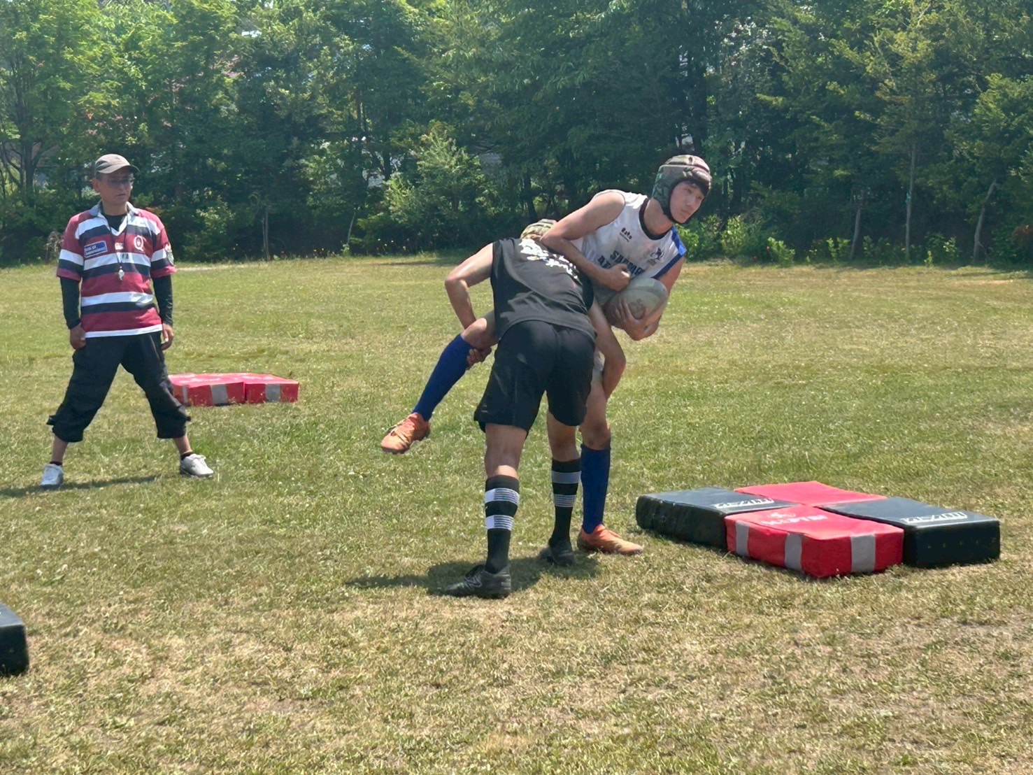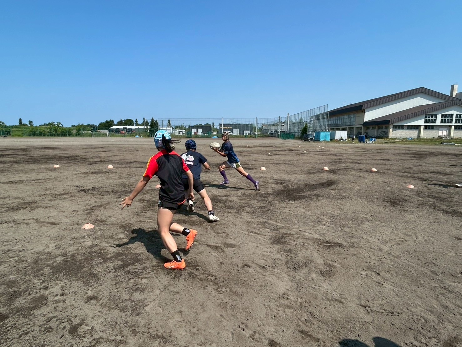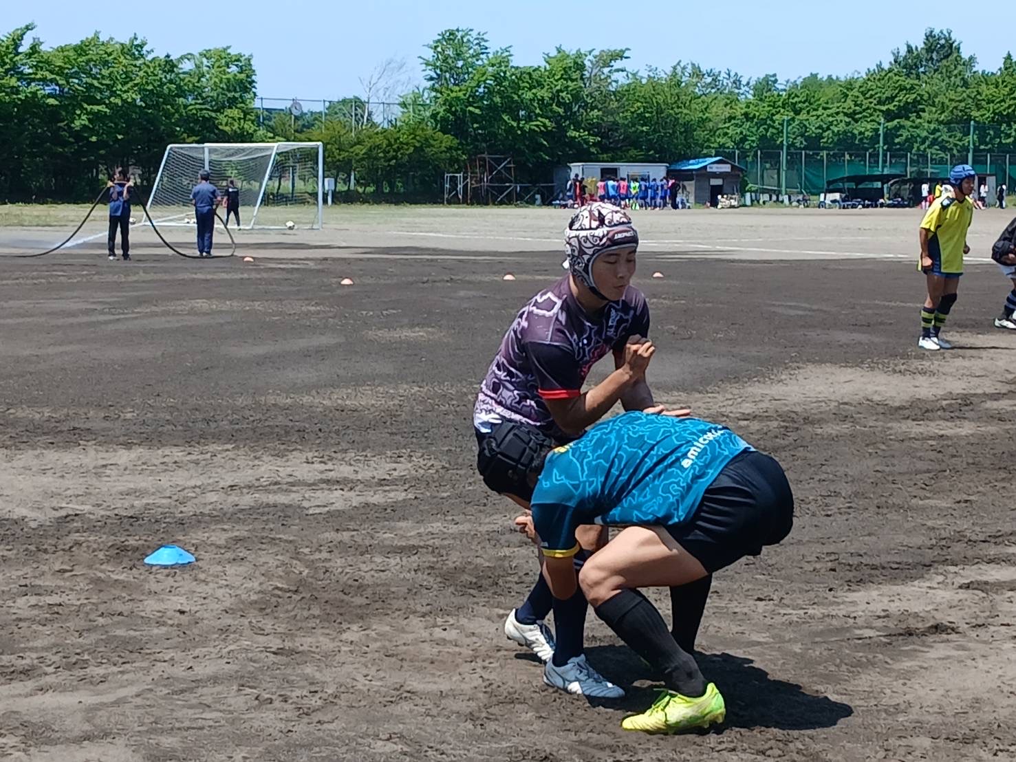 もう一度、ひし形マーカーのタックル練習を行いました。ディップができていないとのご指摘をいただいたので改善していきましょう。