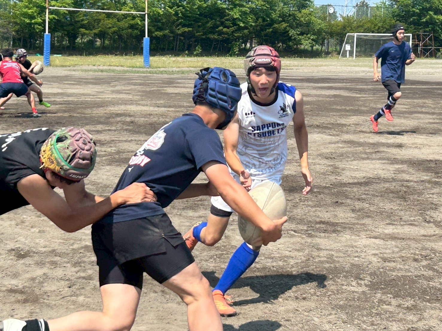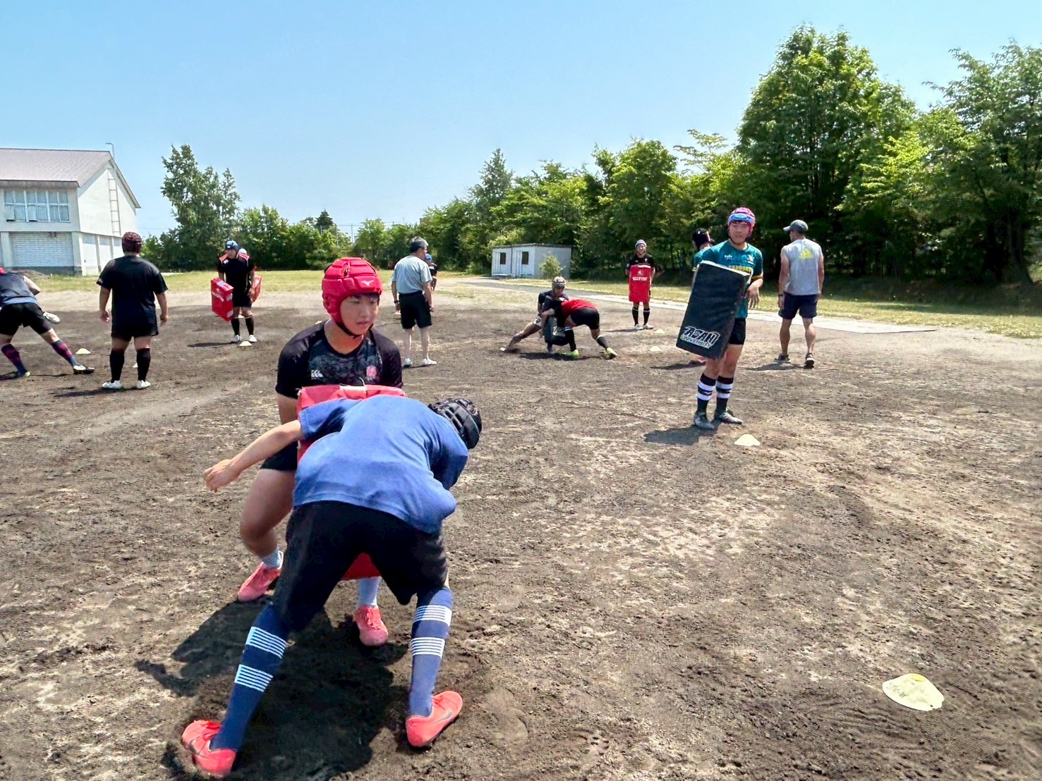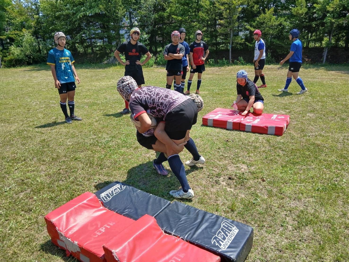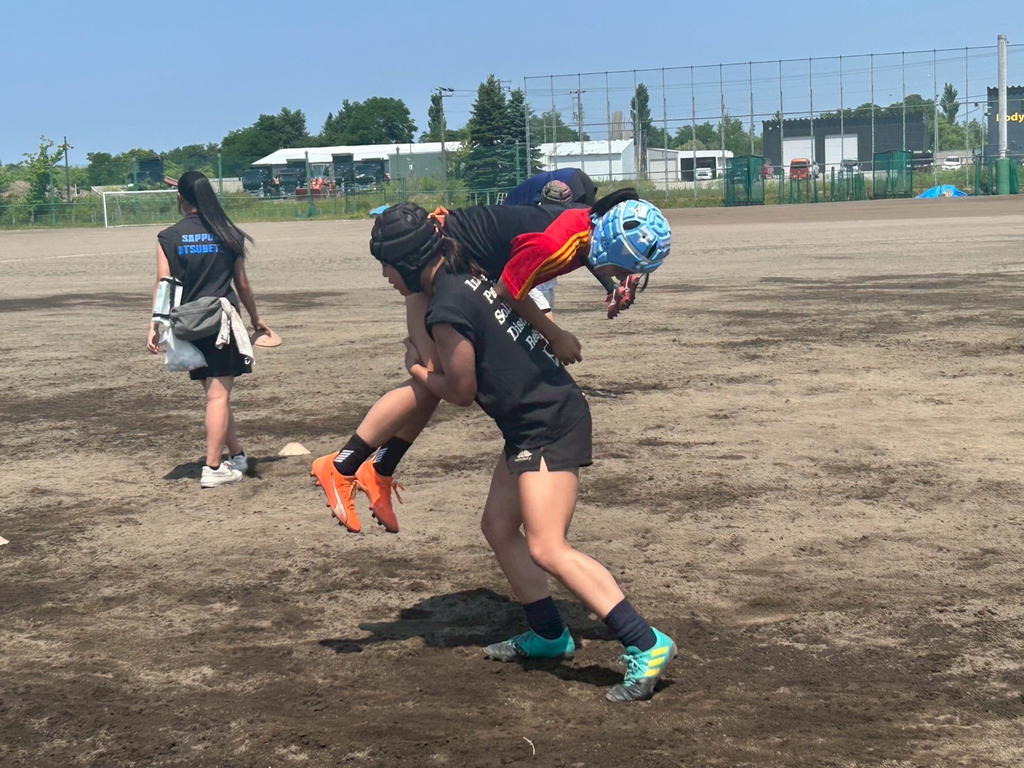 もう一度、ひし形マーカーのタックル練習を行いました。ディップができていないとのご指摘をいただいたので改善していきましょう。