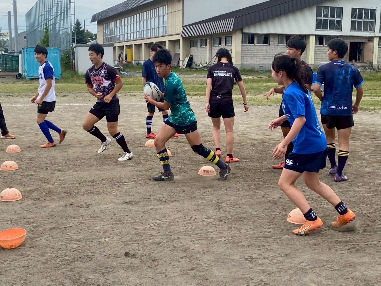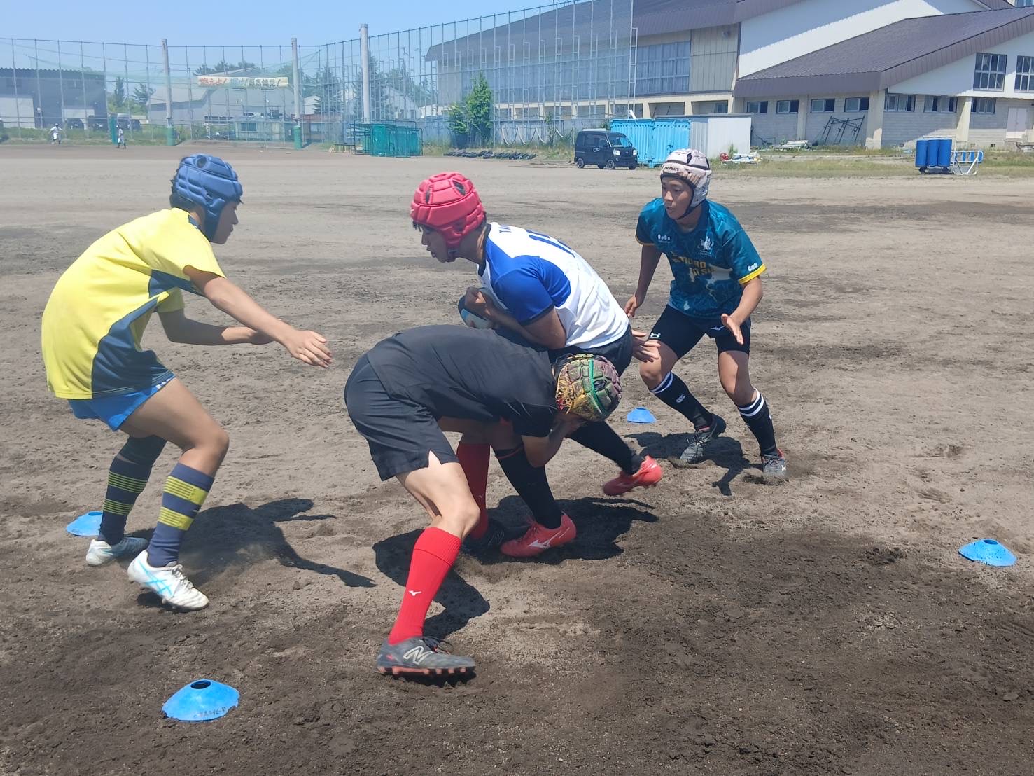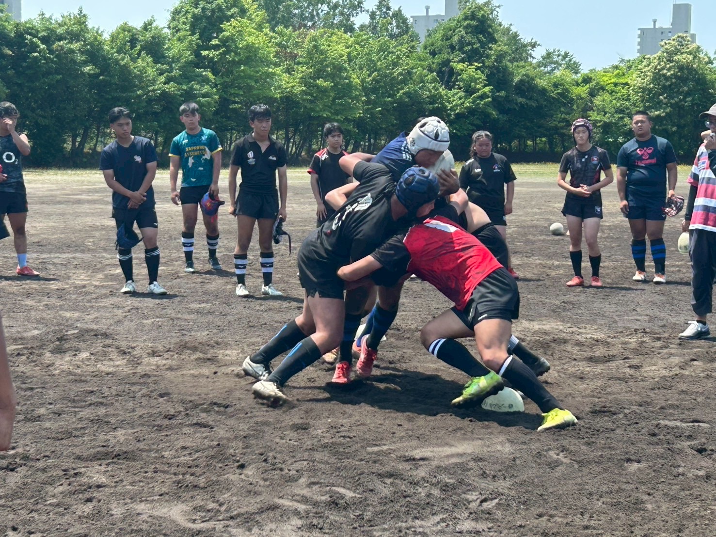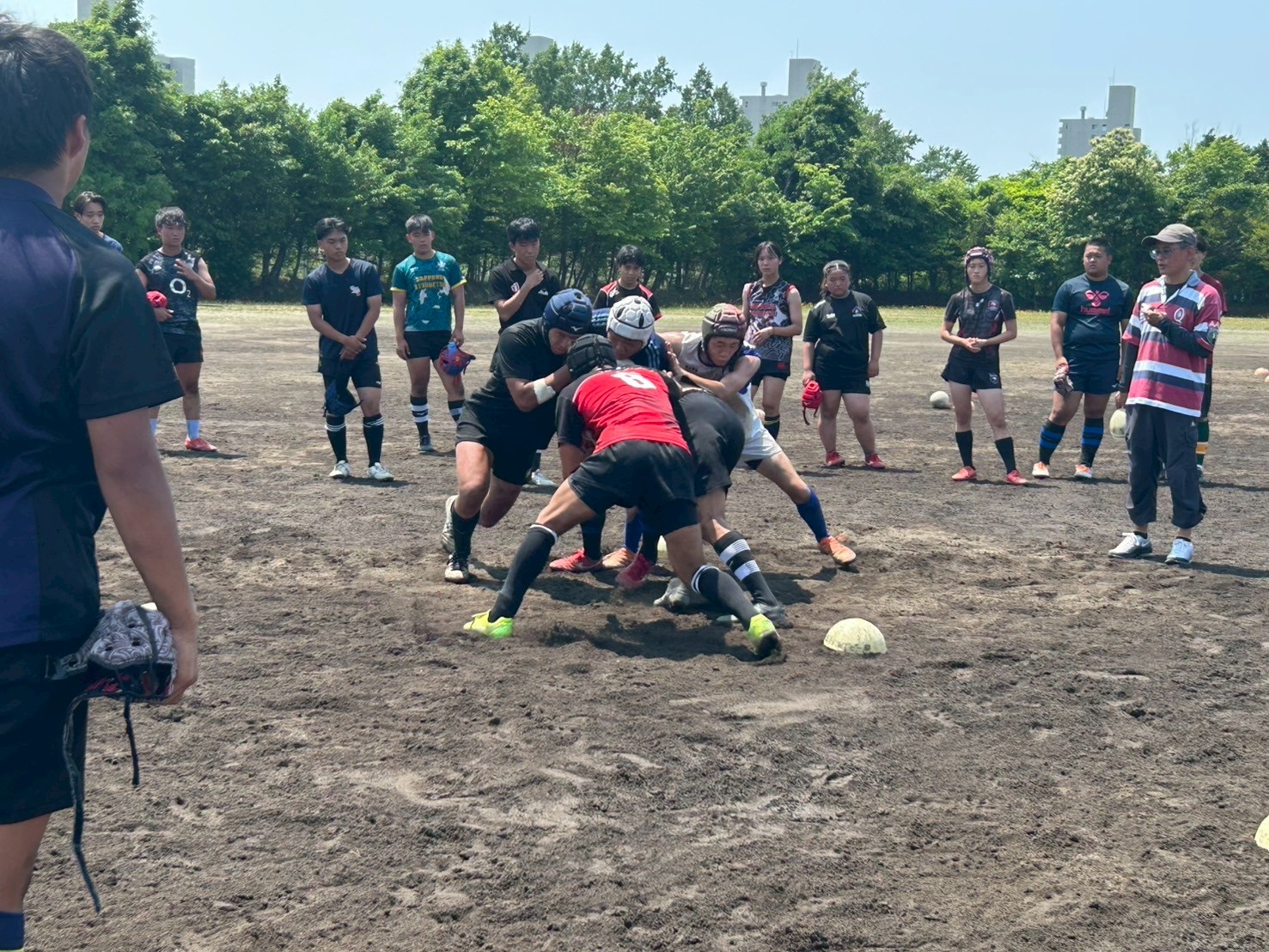 五角形ダブルタックルでは、強くドライブすることの意識、ディフェンスは相手を逃がさないことに視点を置き取り組めていました。