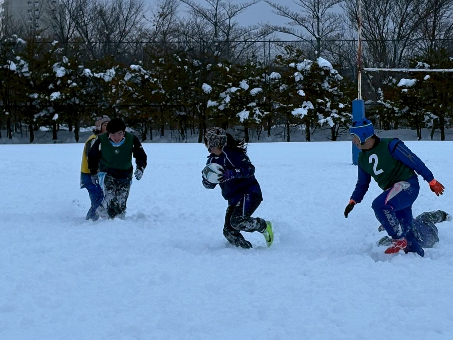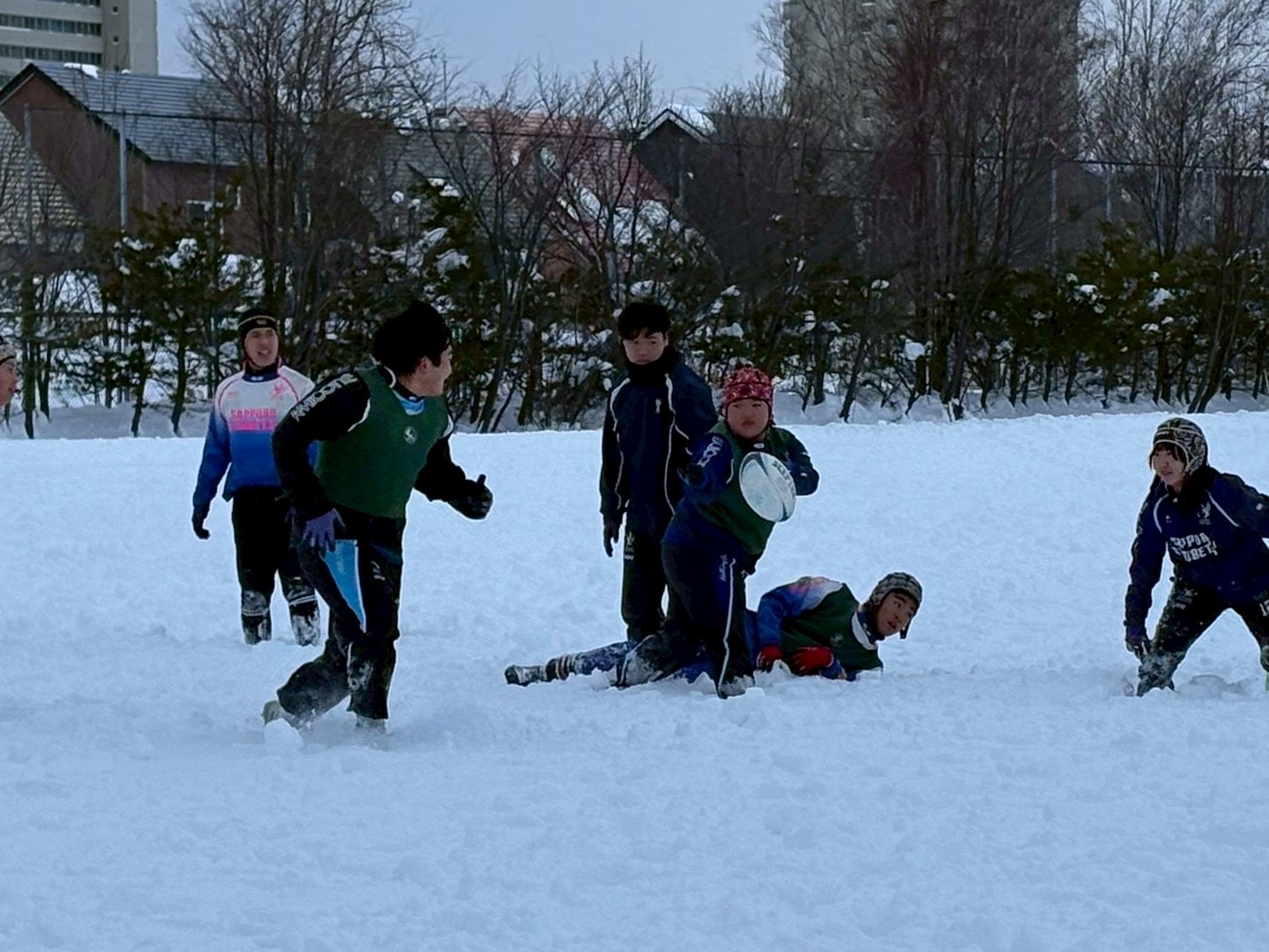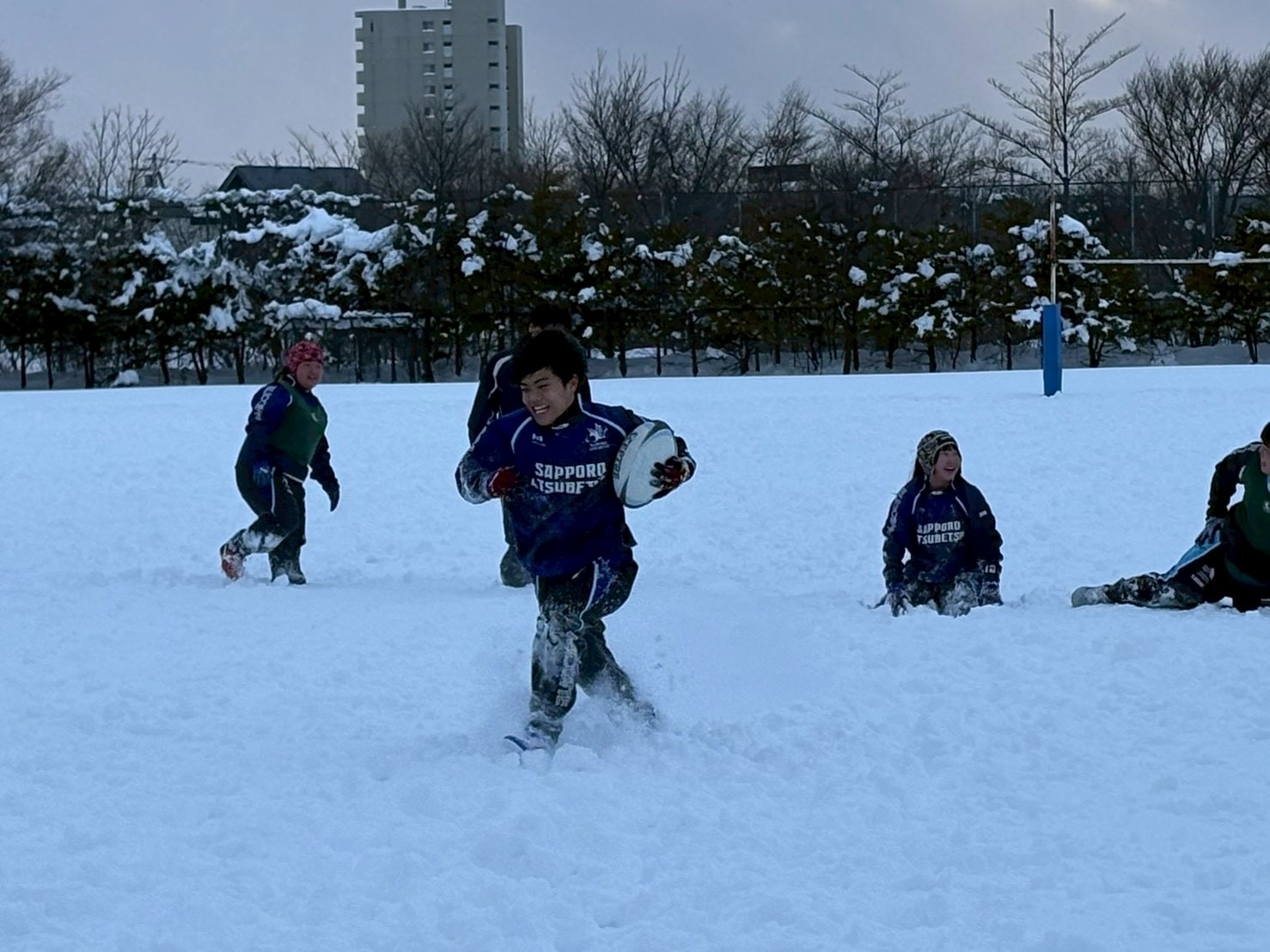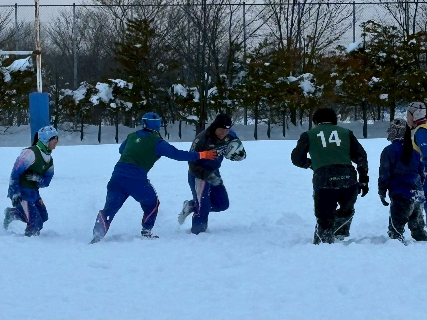 始めにタッチADを行いました。久しぶりのグラウンド練習となり、グラウンド状態が悪い中での練習でしたが、最初から全員で声を出して楽しみながらプレーしている様子が見られました。グラウンド状態が悪いこともあり、ノックフォワードやパスミスなどのイージーミスも多かったですが、回数を重ねる毎に良いプレーが多数見られたり、伝達の声も沢山出せていました。今後も沢山コミュニケーションを取りチームで楽しみながら練習し、雪中ラグビーをしていきましょう。