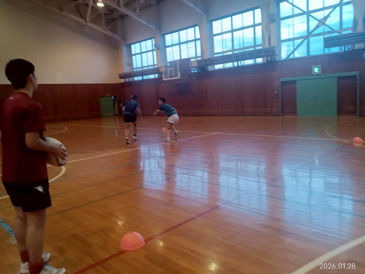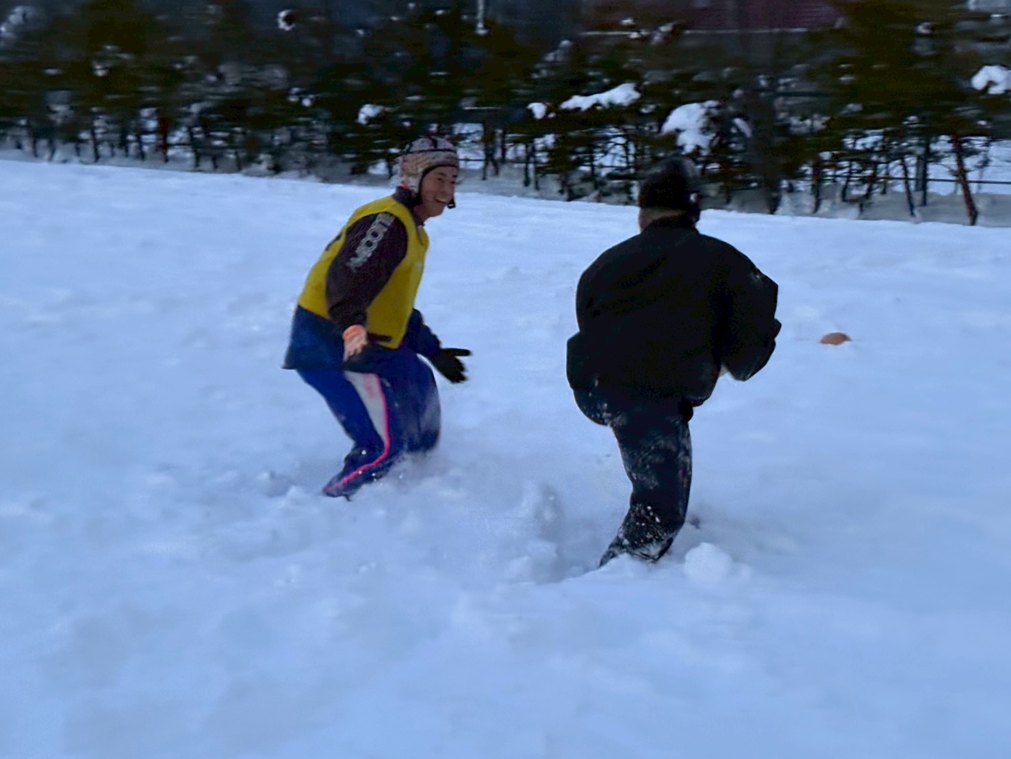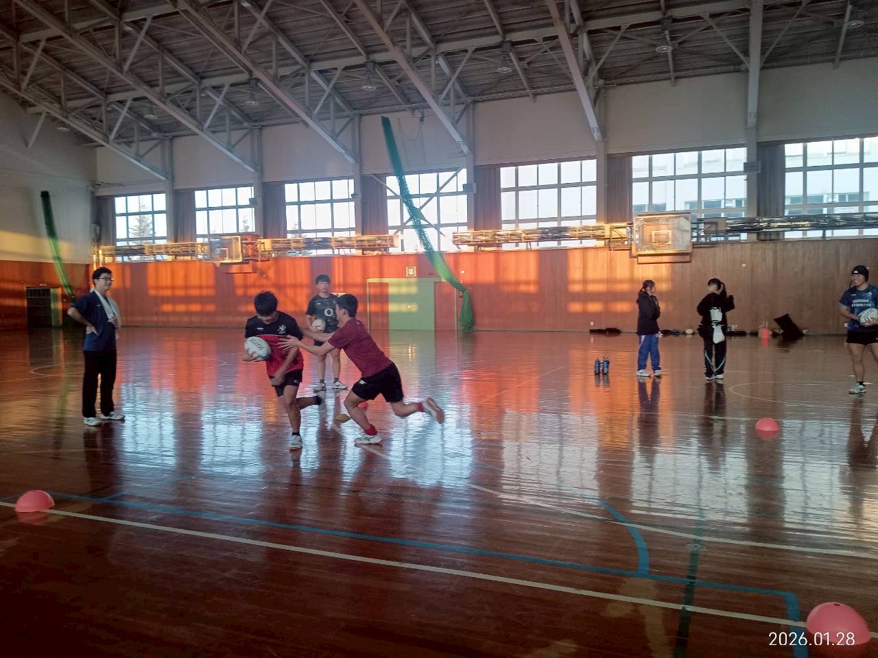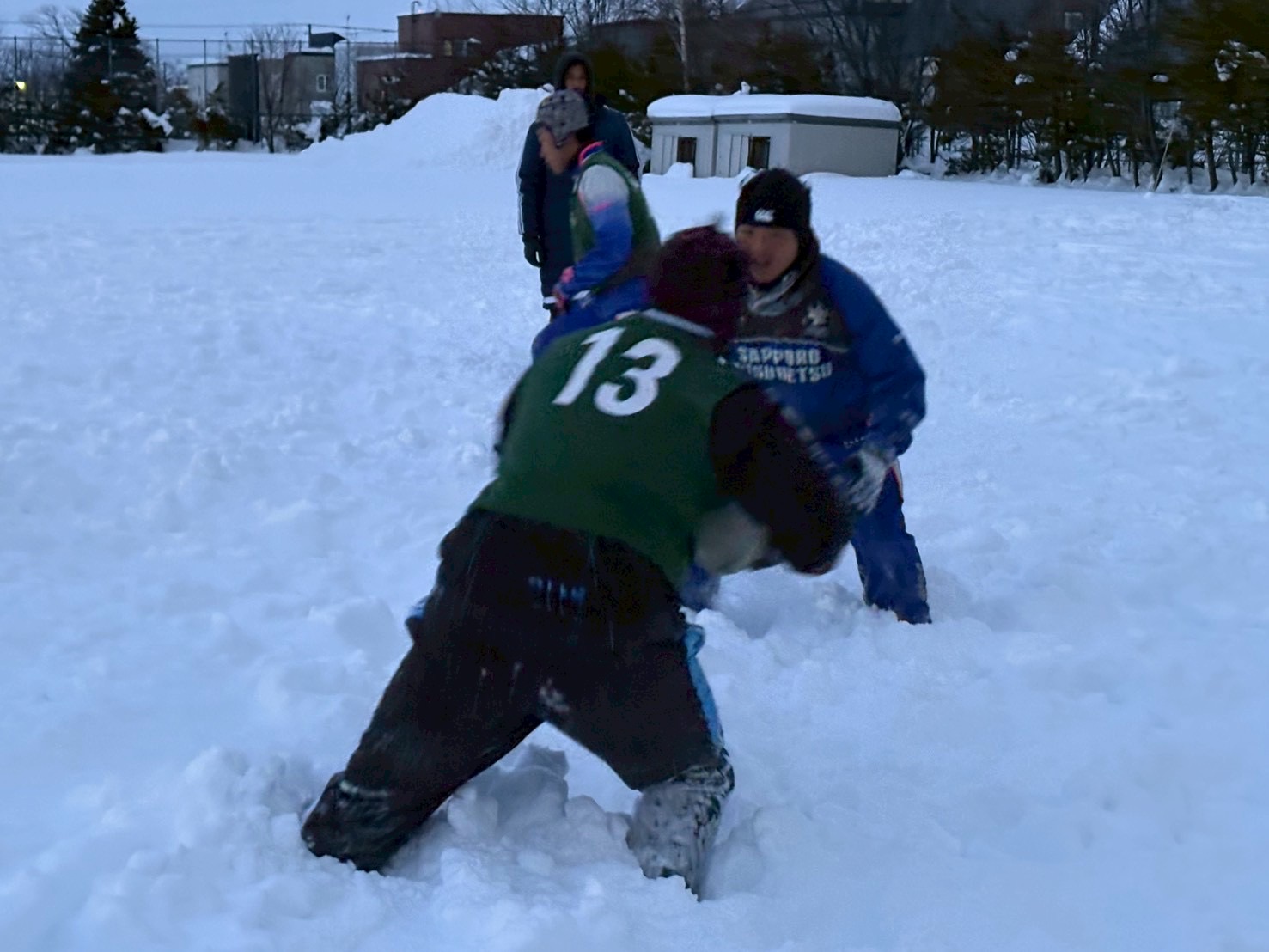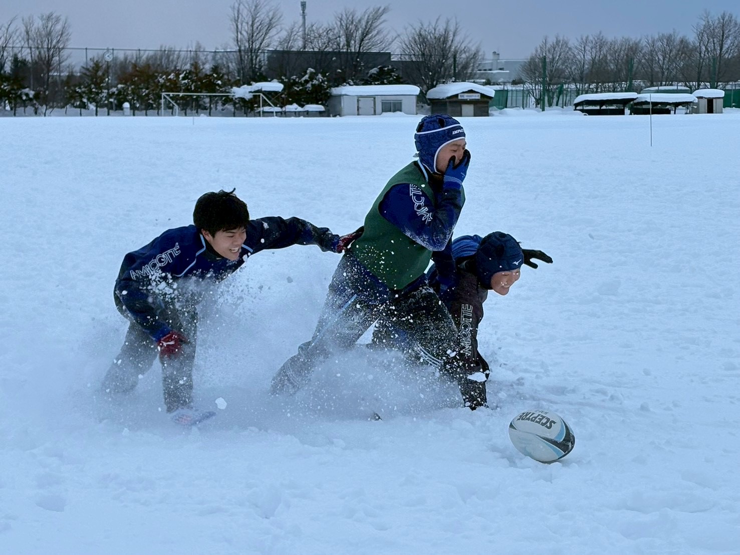 始めにタッチADを行いました。久しぶりのグラウンド練習となり、グラウンド状態が悪い中での練習でしたが、最初から全員で声を出して楽しみながらプレーしている様子が見られました。グラウンド状態が悪いこともあり、ノックフォワードやパスミスなどのイージーミスも多かったですが、回数を重ねる毎に良いプレーが多数見られたり、伝達の声も沢山出せていました。今後も沢山コミュニケーションを取りチームで楽しみながら練習し、雪中ラグビーをしていきましょう。