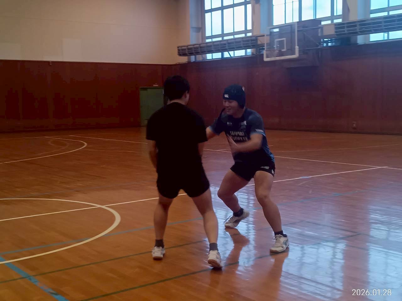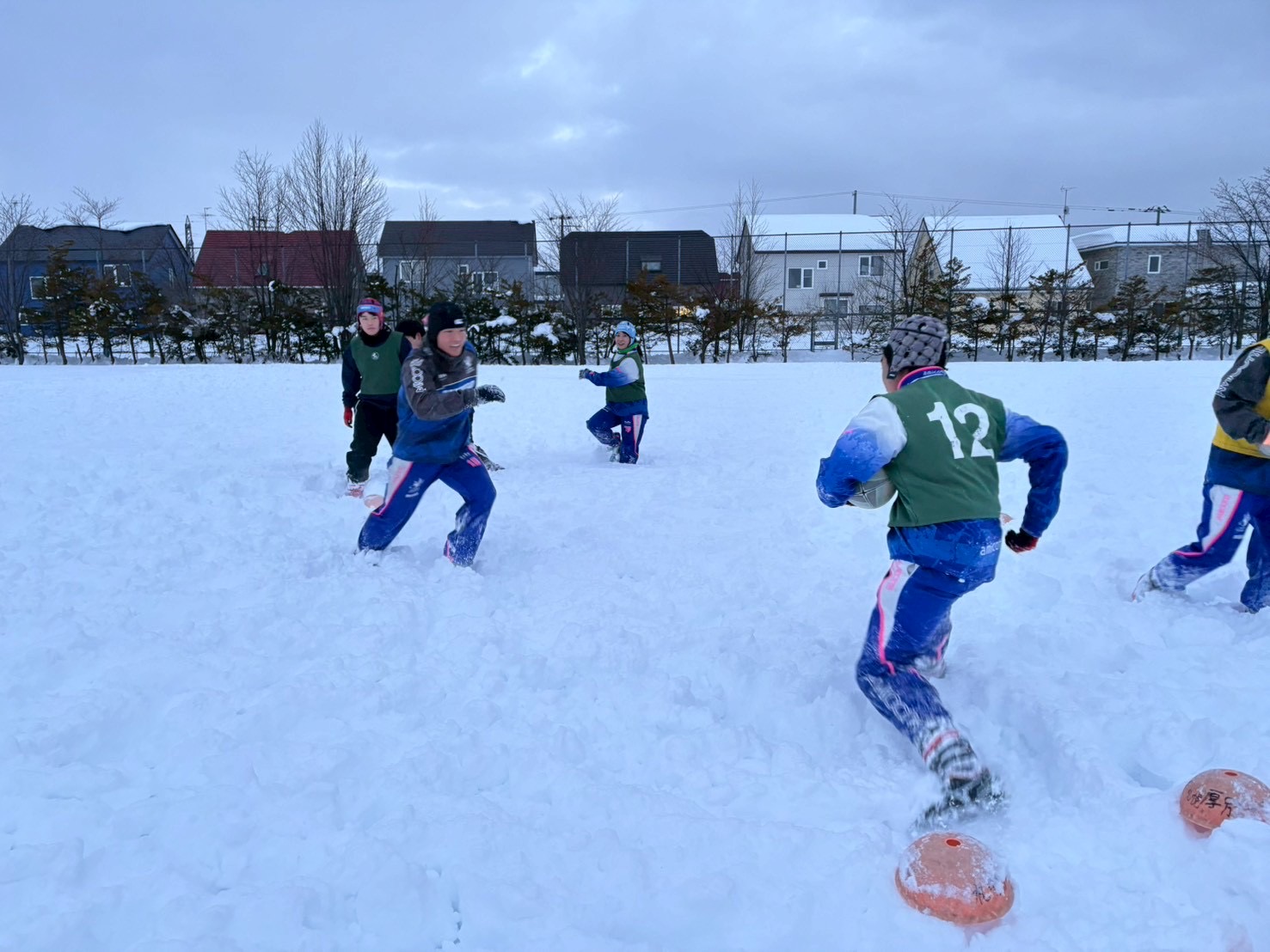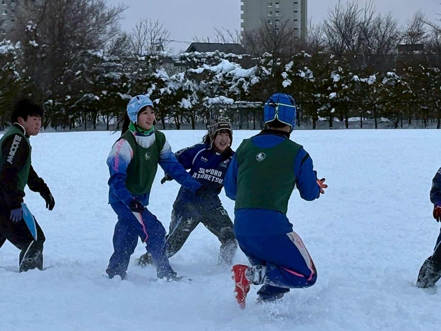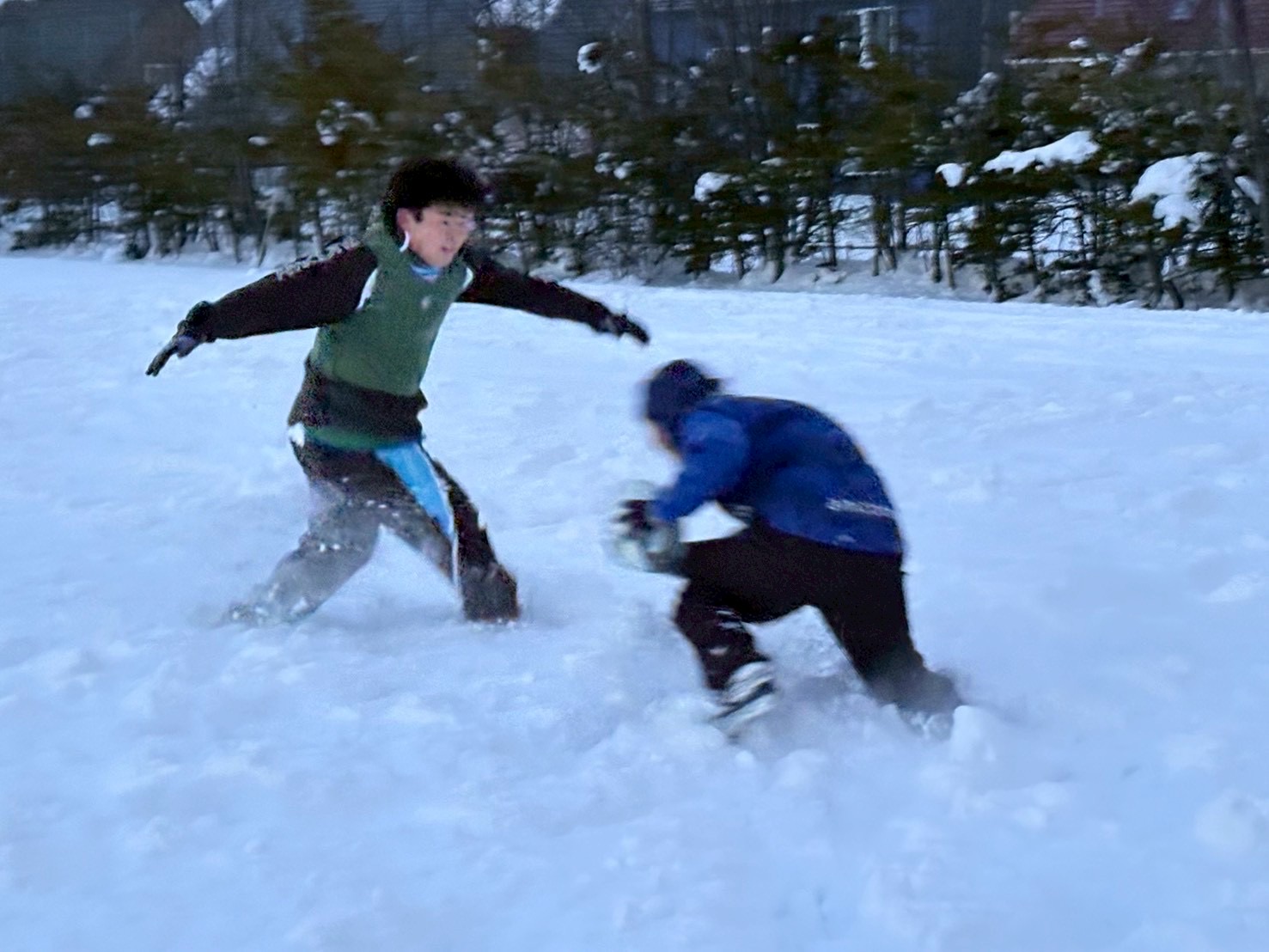 始めにタッチADを行いました。久しぶりのグラウンド練習となり、グラウンド状態が悪い中での練習でしたが、最初から全員で声を出して楽しみながらプレーしている様子が見られました。グラウンド状態が悪いこともあり、ノックフォワードやパスミスなどのイージーミスも多かったですが、回数を重ねる毎に良いプレーが多数見られたり、伝達の声も沢山出せていました。今後も沢山コミュニケーションを取りチームで楽しみながら練習し、雪中ラグビーをしていきましょう。