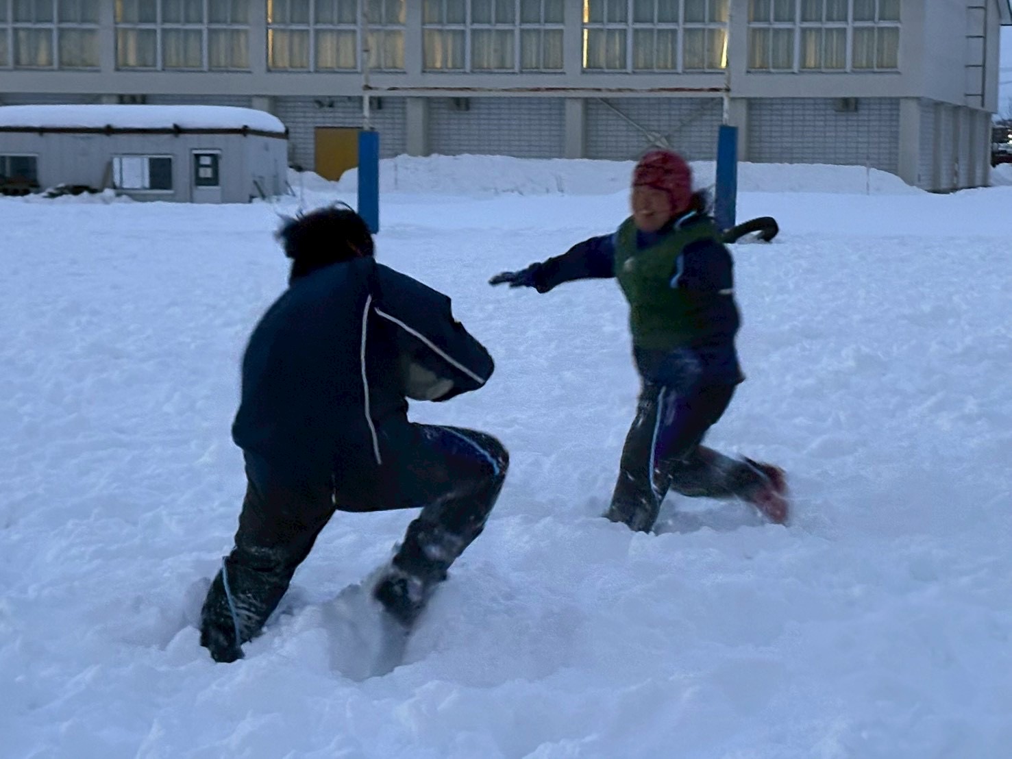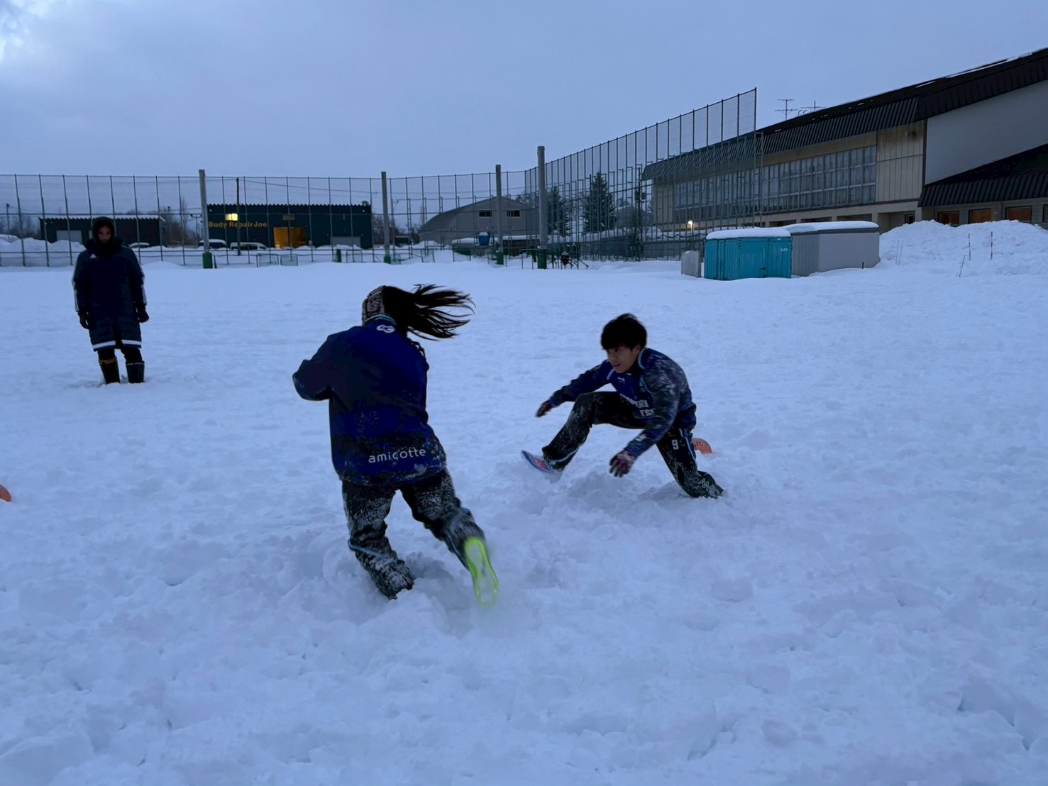 最初に雪踏みをして、足場を固めて練習しやすい環境を作りました。