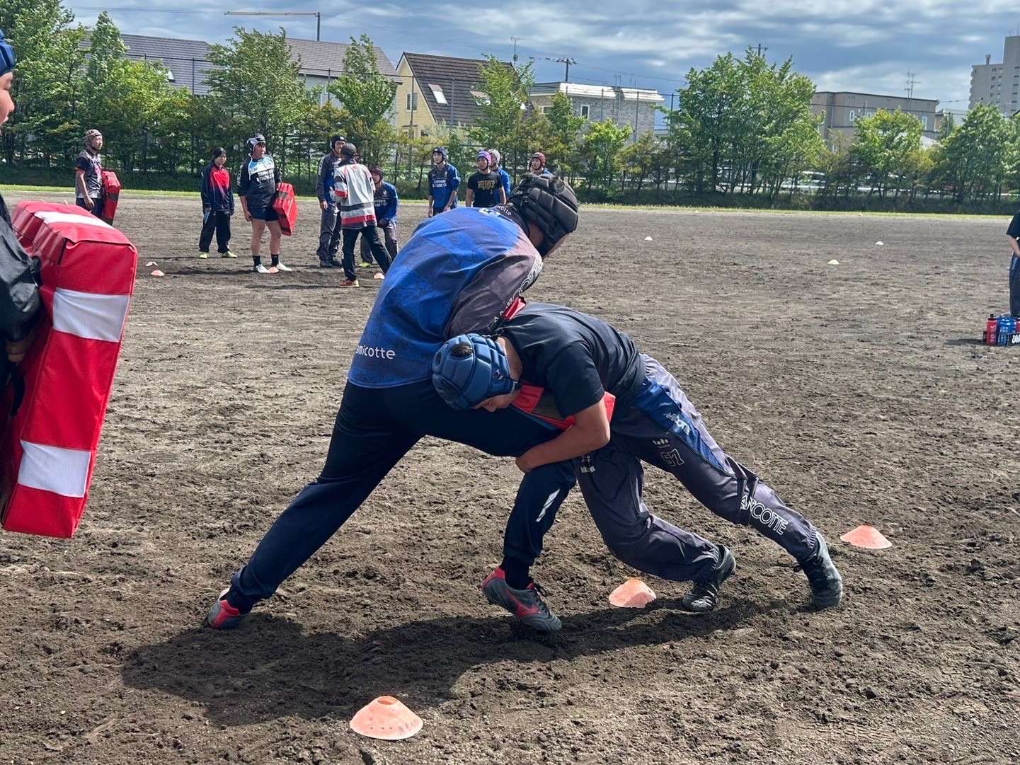 その後、タックルに入る際何を意識するべきなのかを考えながら取り組む為にスローでタックルの練習を行いました。パワーフット、相手の膝裏バインド、首で相手をロック、ドライブの4つのポイントを重点的に抑えました。仰向けで倒し切る事を目標としてパワーフットは相手の足と足の間に踏み、バインドでは両手でしっかり相手をロックしましょう。